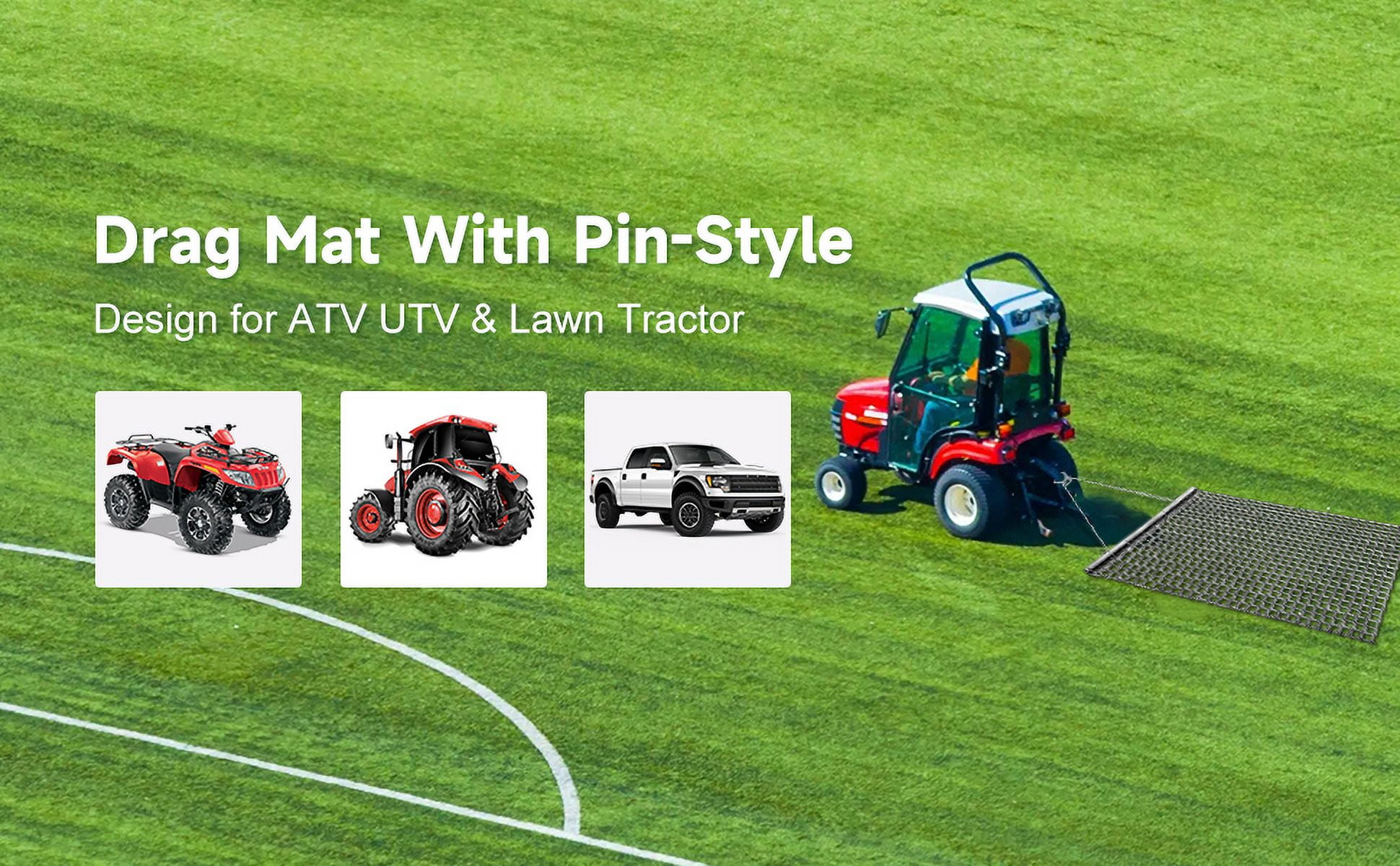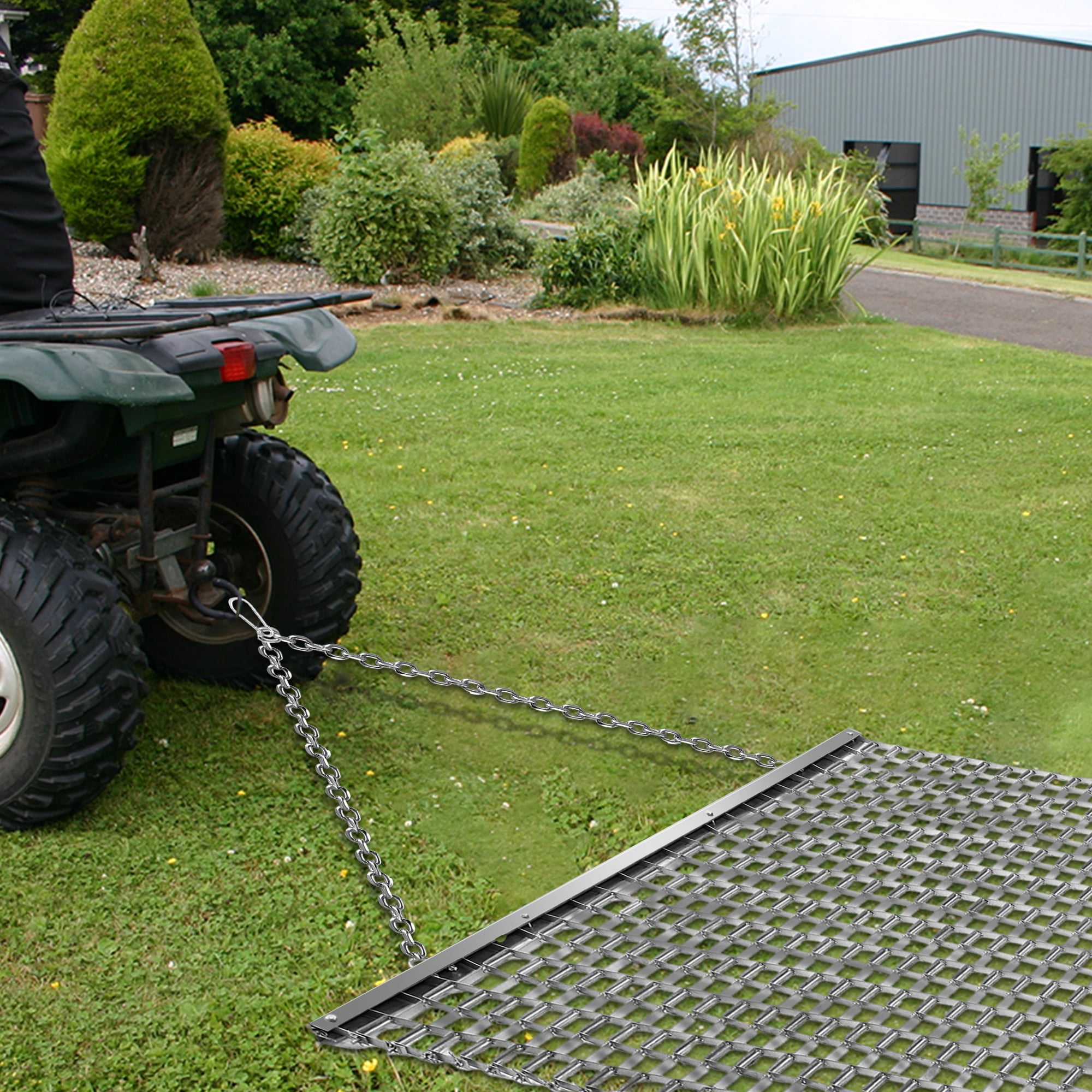 【ATV/UTV 4 x 4 Football Baseball Softball Field Drag Mats, Lawn Leveling Steel Mesh Zinc Plated Heavy Duty Durable Field Surface Leveling Drag Mat for Manual or Vehicle Driveway Farm Garden Base】 DURABLE STEEL CONSTRUCTION, SUITABLE AS TRACTOR ATTACHMENTS, MULTI SURFACE LAWN LEVELING TOOL, SIMPLE TRANSPORTATION & STORAGE. How to install the drag mat: 1. After opening the package, first open the bundled iron chain and unfold the drag mat. (Warning: handle with care to prevent the mat from scratching your hands) 2.Connect the chain and mesh. 3.Connect with ATV/TRACTOR or other vehicle. 4.Clean the product when not in use for a long time. Package Included: 1.Drag mat x 1 2.Drag Chain x 1 3.Plug x 1 4.Connect Ring x 2