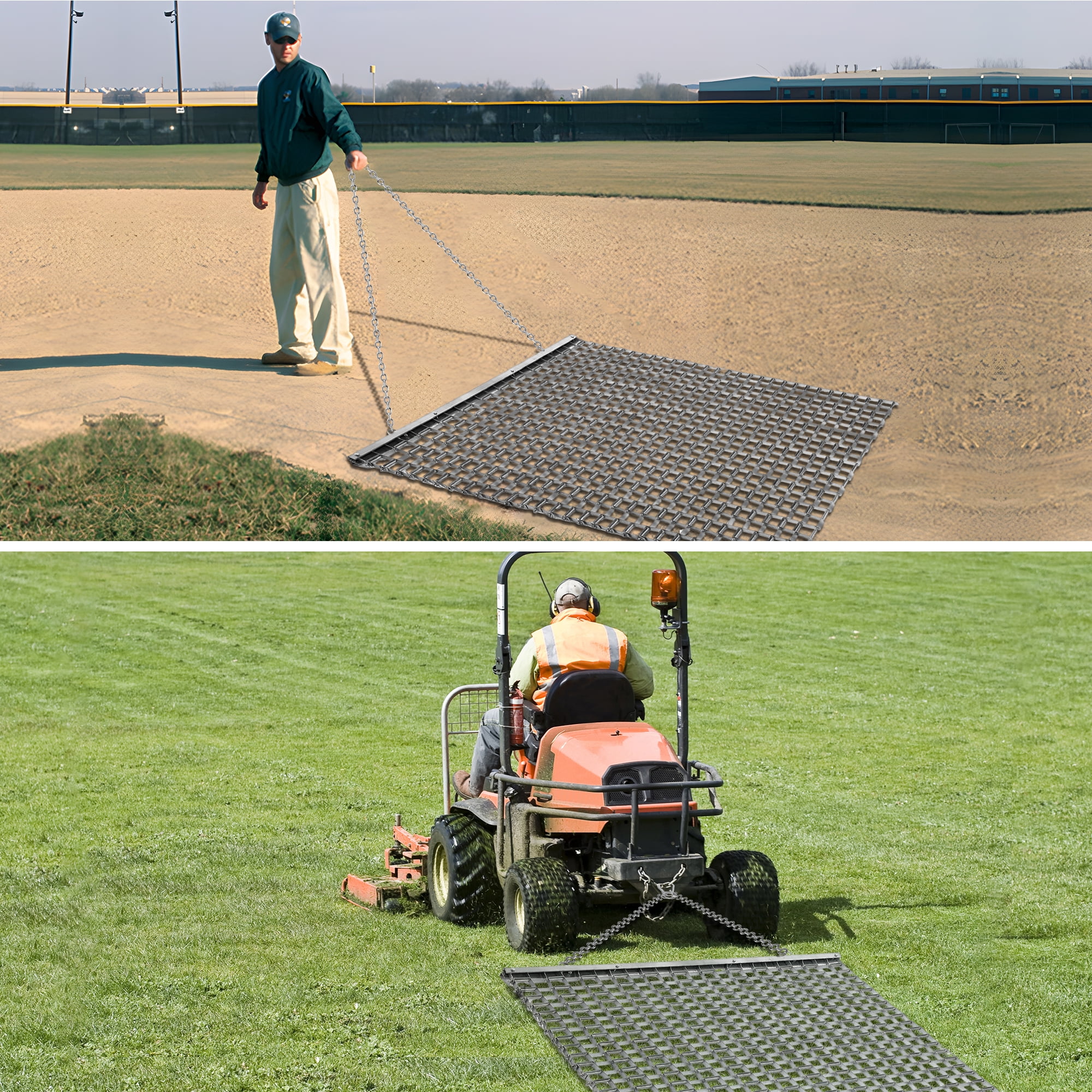 DURABLE STEEL CONSTRUCTION: Our drag mat is made from premium-grade heavy-duty galvanised steel construction, the field drag combines unrivalled performance with excellent longevity, as it is fully rust and corrosion resistant. SUITABLE AS TRACTOR ATTACHMENTS: This 4 x 4 foot baseball field drag comes with chain and plug which easily attaches on to any style of tractor ATV, UTV, even can drag the mat manually by hand. MULTI SURFACE LAWN LEVELING TOOL: This lawn drag is perfect for levelling the playing field, can be used on a wide variety of surfaces, such as driveways, baseball diamonds, golf fairways, grading fine soil, clay tennis courts, soccer pitches and more. SIMPLE TRANSPORTATION & STORAGE: 4×4 drag mats, efficient and ideal for clearing a large area, such as a baseball field, without excessive struggle and exhaustion. You can roll up the product for easy portability when you are not using it or transferring it. The product uses galvanized materials and will not rust even if it is stored for a long time. According to needs, no more than 50 pounds of heavy objects such as tire stones can be added to the mat to make the mat work more efficiently.