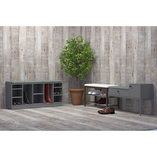 The Basicwise Wooden Shoe Cubicle Storage Entryway Bench with Soft Cushion for Seating combines the comfort of a cushioned bench and cubby shoe storage for efficient use of the entryway. The storage bench has 10 cubbies of various sizes, useful for storing both shoes and boots. Features Can be used as a shoe organizer, bedroom and hall Bench base provides superior stability compared to bench legs or feet Large top has a comfy cushion when you need a seat 2 large cubbies provide storage for tall bootsSpecifications Color: Gray Material: Wood Number of Compartments: 10 Style: Modern Dimension: 22″ H x 47.25″ W x 12″ D Weight: 52 lbs – SKU: QKWY1482
