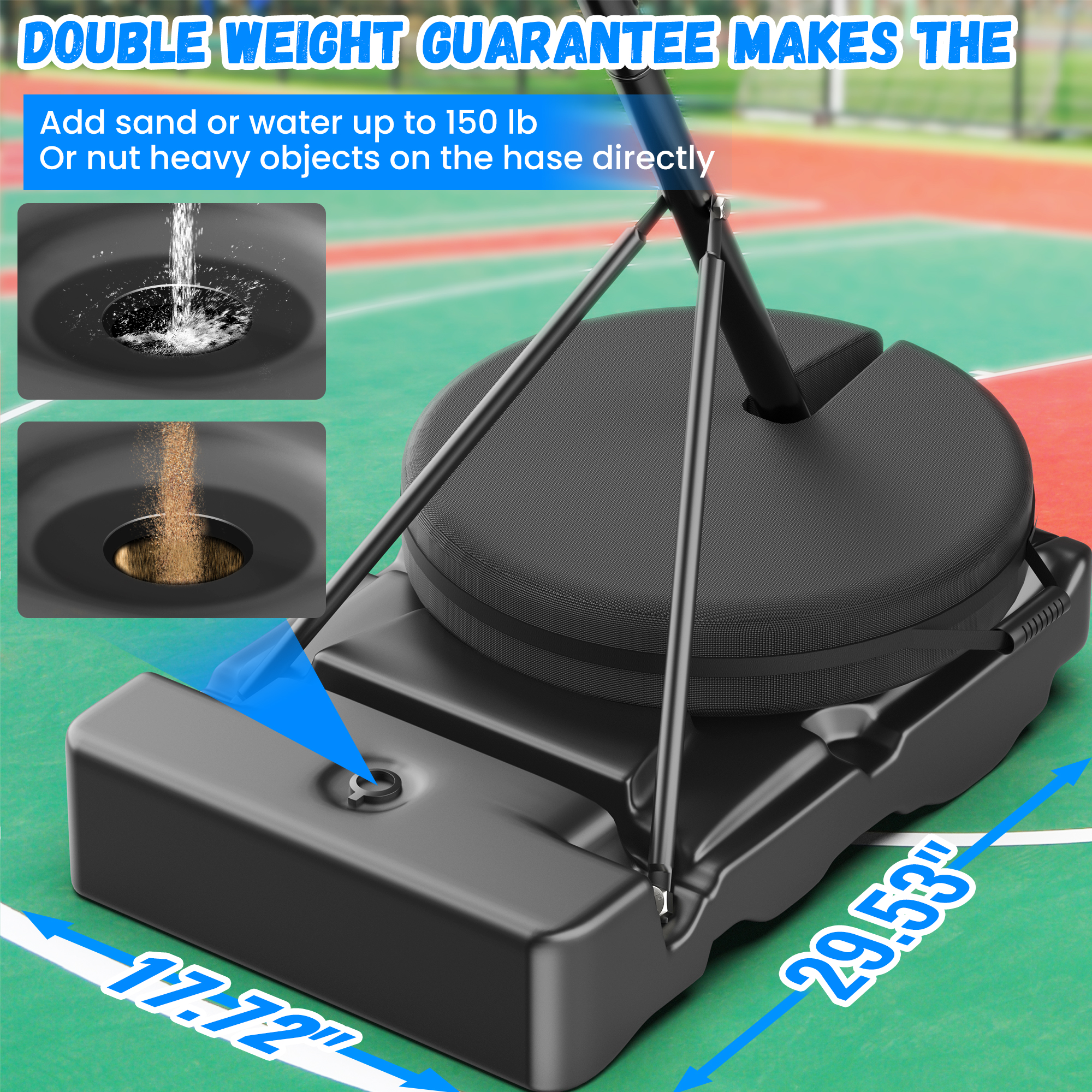 🏀 Ultimate Strength and Stability: The Vecukty outdoor basketball hoop features a 33″ shatterproof backboard made from high-strength PVC. Its shock-absorbing design reduces impact, while the Q195 thick steel support rod ensures long-lasting durability. Plus, with the included sandbag that holds up to 20 gallons, you get even more stability for intense games. 🏀 Upgraded Height Adjustability: Vecukty’s lift system makes this basketball hoop adjustable for kids from ages 7 and up. With easy adjustments from 6.5 ft to 8.5 ft, and even up to 10 ft, this hoop offers the perfect basketball goal for kids age 7 and up and adults alike. Whether you’re playing indoors or outdoors, it’s designed to accommodate players of all skill levels. 🏀 Standard Basketball Goal System: The Vecukty kids basketball hoop features a 15″ standard basketball rim and a 10-foot adjustable support pole, giving you a professional-grade experience right in your backyard or home. Whether it’s your first shot or you’re already a pro, this system helps develop skills and makes every game fun. 🏀 High-Strength Base & Portable Design: The extra-large PE base can hold up to 30 gallons of water or sand, ensuring the hoop remains stable during play. And with the added free sandbag, stability is maxi With Vecukty’s durable basketball goal system, you can enjoy the perfect mix of quality time and fitness. Whether it’s shooting hoops with friends or practicing your skills, this basketball hoop for kids brings excitement to any game. From family gatherings to friendly competitions, Vecukty’s portable basketball hoop is here to deliver. Specifications: Backboard Size: 33″ durable PVC backboard, perfect for all outdoor settings. Basketball Hoop Height Adjustment: Adjustable from 5′ to 7′, making it great for players of all ages. Overall Height Adjustment: The height can be adjusted from 6.5′ to 8.5′, allowing for flexibility in various play styles. Backboard Material: High-strength PVC, built to withstand impact and outdoor conditions. Basketball Stand Material: Steel frame with reinforced steel pole weldment and extension arm for extra durability. Basketball Rim: Pro-style slam breakaway rim, great for dunking and high-energy play. Base: Stability base holds 30 gallons of water or sand to keep the hoop secure. Sand Bag: Comes with an extra sandbag that holds up to 20 gallons for added stability. Base Dimensions: 29.53″ x 17.72″, providing a solid and wide support area. Application: Designed for outdoor residential use, perfect for home or HOA areas. Includes: 1 basketball hoop, 2 basketball nets, and 1 basketball.