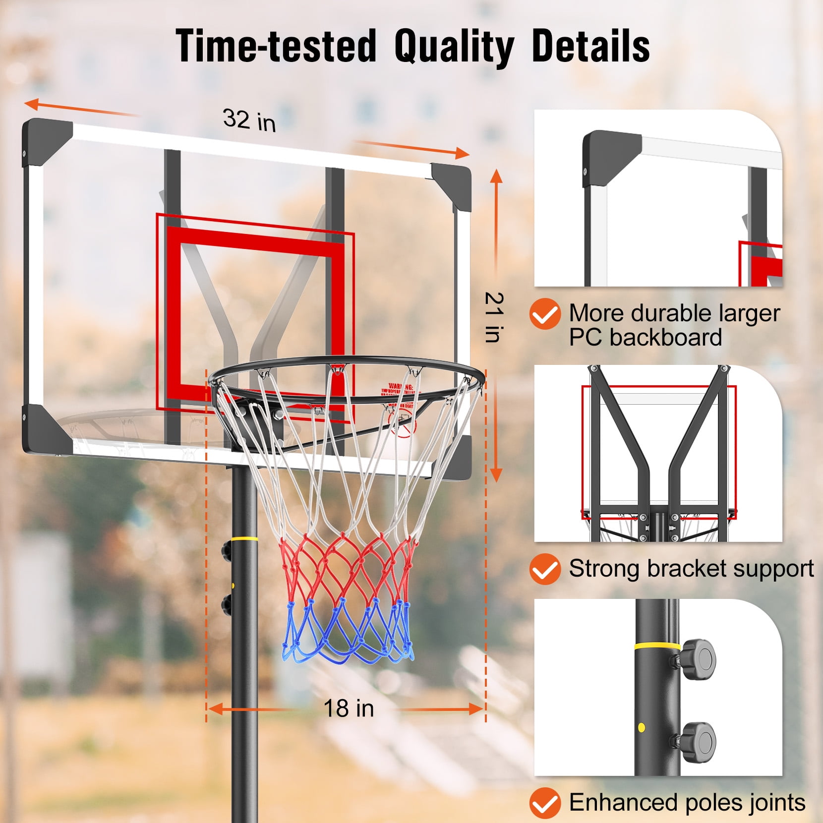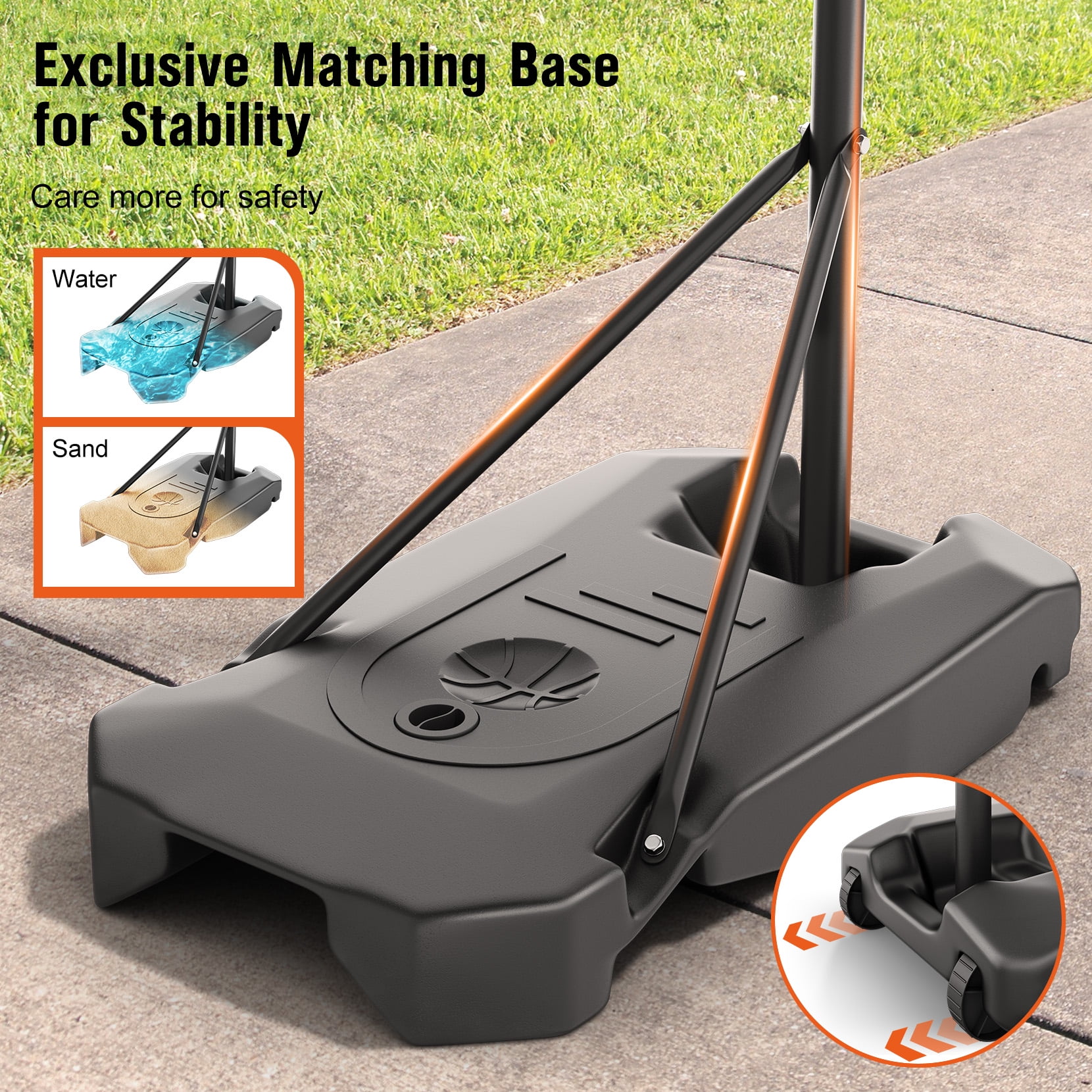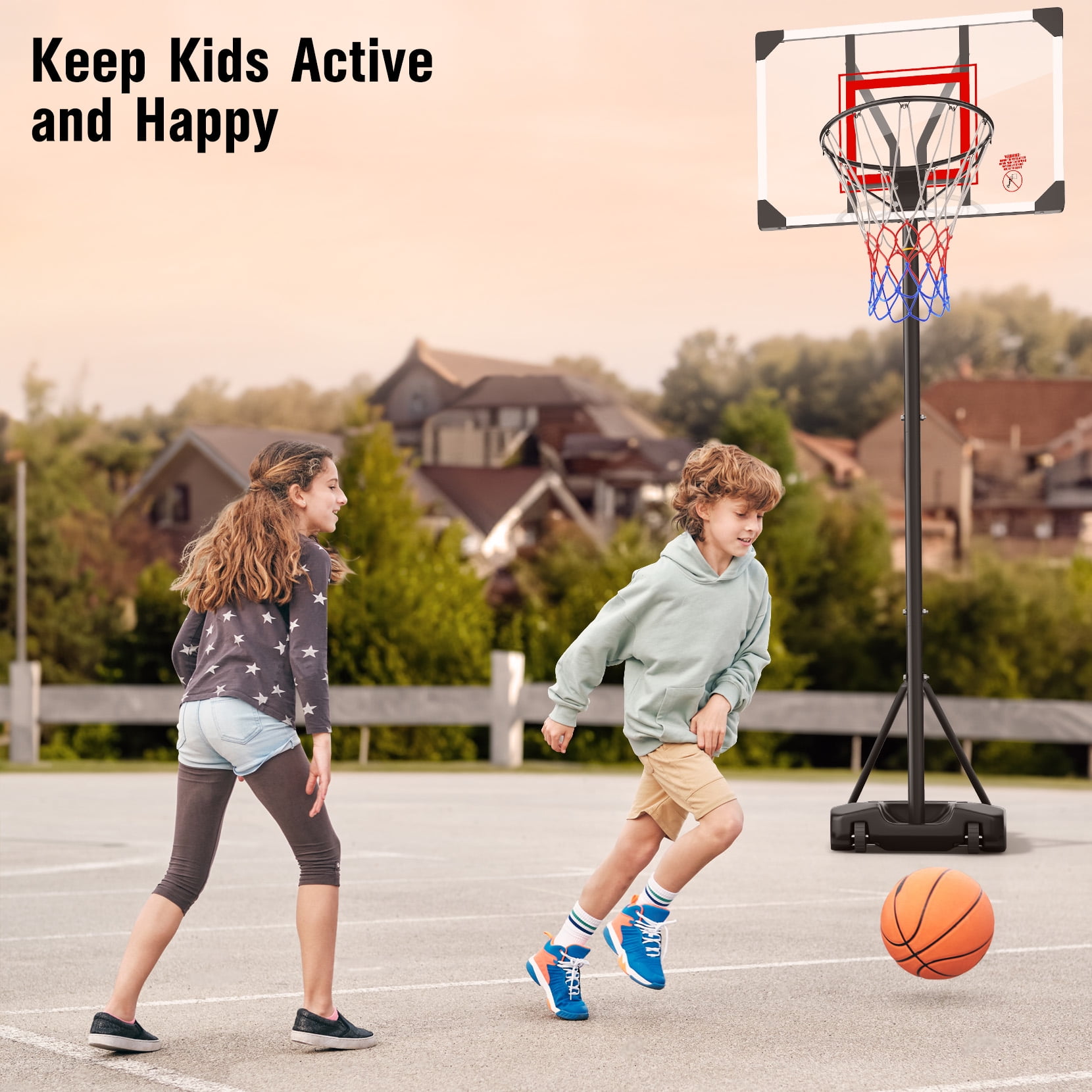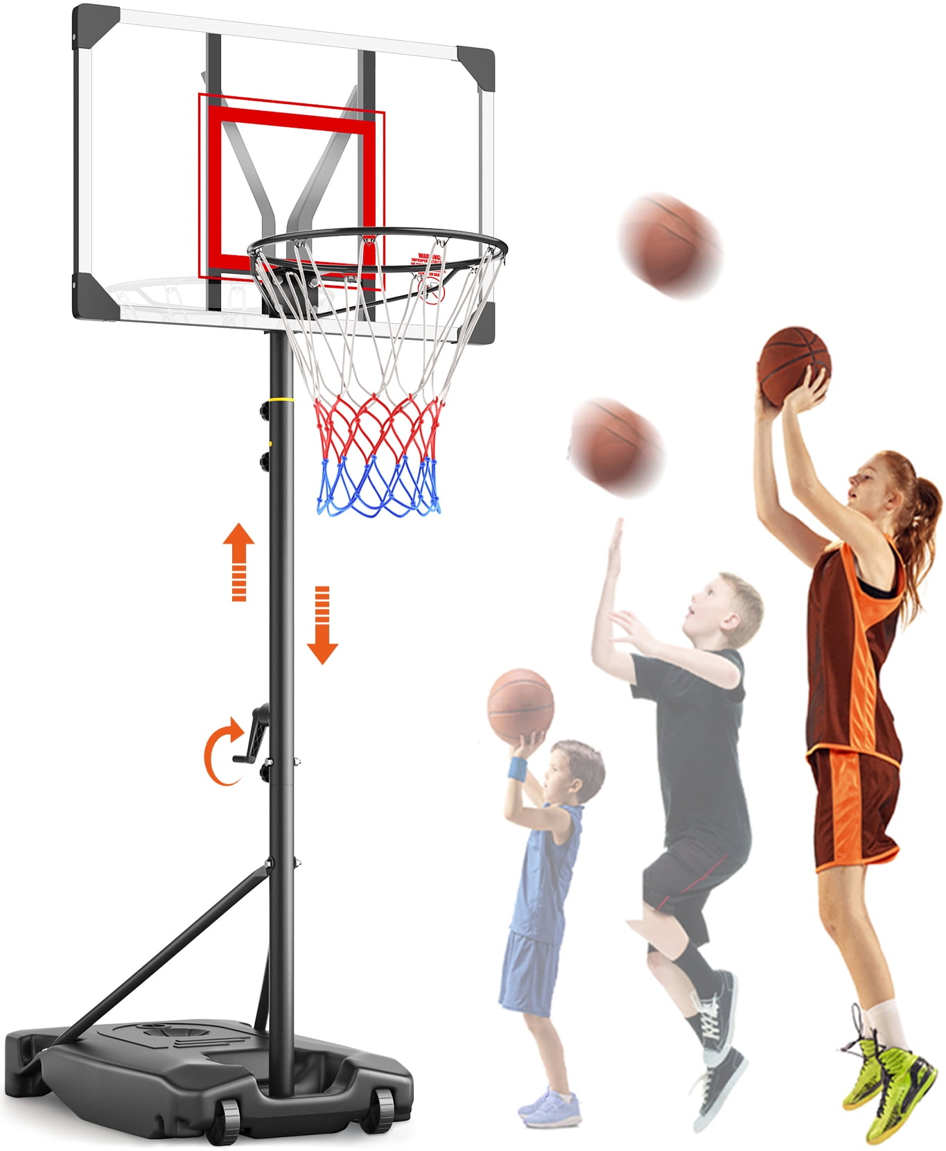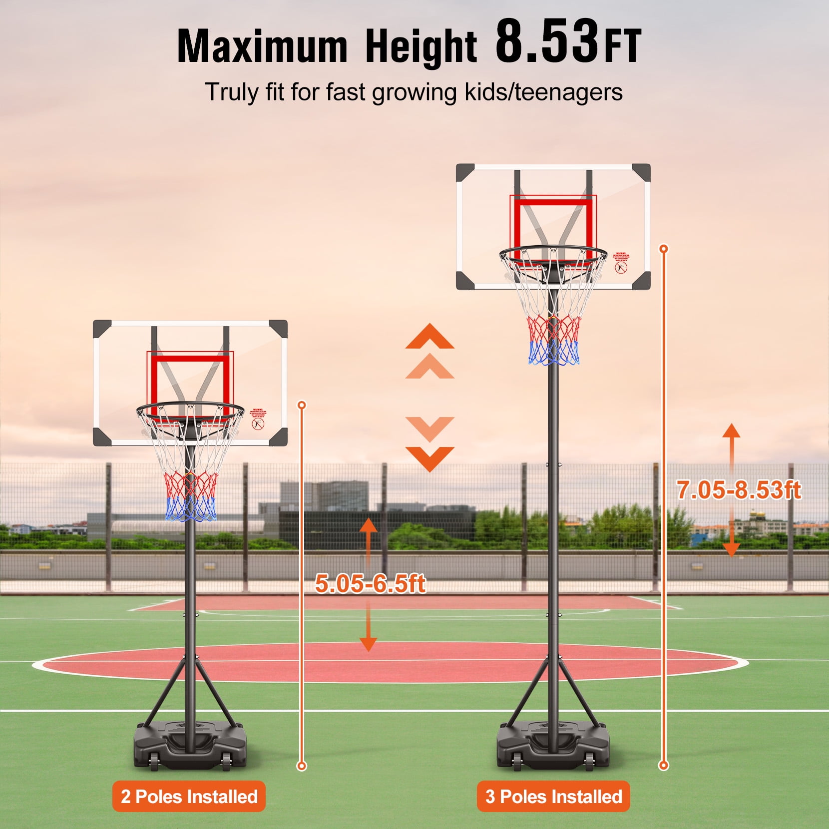 ⛹[CONVENIENT QUICK ADJUSTMENT HEIGHT ROCKER 5.05FT-8.53FT]: With with quick-adjust rocker and raised maximum height 8.53ft, The kids basketball hoop outdoor is truly fit for growing kids. 5.05ft to 6.5ft with two poles installed, 7.05ft to 8.53ft with three poles installed. ⛹[ENLARGED BASE & PC BACKBOARD FOR STABILITY&DURABILITY]: In order to provide enough support to match the raised maximum height, we enlarged the base which could be filled with water or sand up to 93lbs. Plus, we also enlarged the PC backboard for better durability and shooting the ball. ⛹[CUSTOMIZED FOR KIDS]: The basketball goal provides entertainment for kids after school and distraction from technology for more exercise. Kids will enjoy shooting and learning the basketball game easily. Designed with sturdy construction and vivid colors to make kids’ life full of fun. ⛹[USE AT OUTDOOR/INDOOR]: The built-in wheels at the front of the base make this hoop easy to move to any area like driveway, backyard, front yard, park, playground, garage, gym, inside the house, etc. ⛹[PERFECT GIFT FOR KIDS]: The Neche basketball hoop outdoor is a wonderful gift for kids to enjoy leisure time, go outside to play with friends!