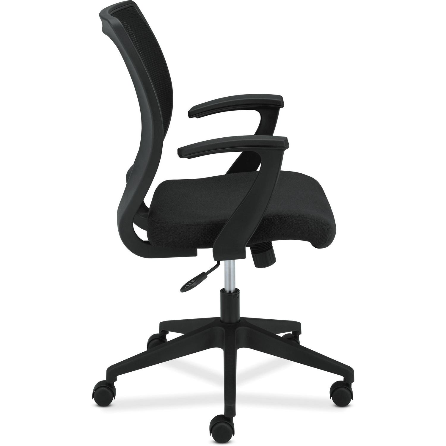 Mid-back work chair offers a supportive mesh back and mesh seat for responsive seating. Fixed-position T-arms provide straight-forward support for forearms in nondemanding applications. Distance between arms is 18-1/2″, and the height from the seat is 9-1/8″. Functions include 360-degree swivel, pneumatic seat-height adjustment from 17-1/2″ to 22″, tilt, tilt tension, and tilt lock. Tilt allows a comfortable rocking/reclining motion. Tilt tension adjusts the amount of resistance when reclining to accommodate individual weight and work styles. Tilt lock secures the chair in an upright position for constant back support when not reclining. Five-star base features 2″ diameter dual black wheels and injection-molded plastic. Arms are also made with black injection-molded plastic and built-in polyurethane arm pads for comfort.