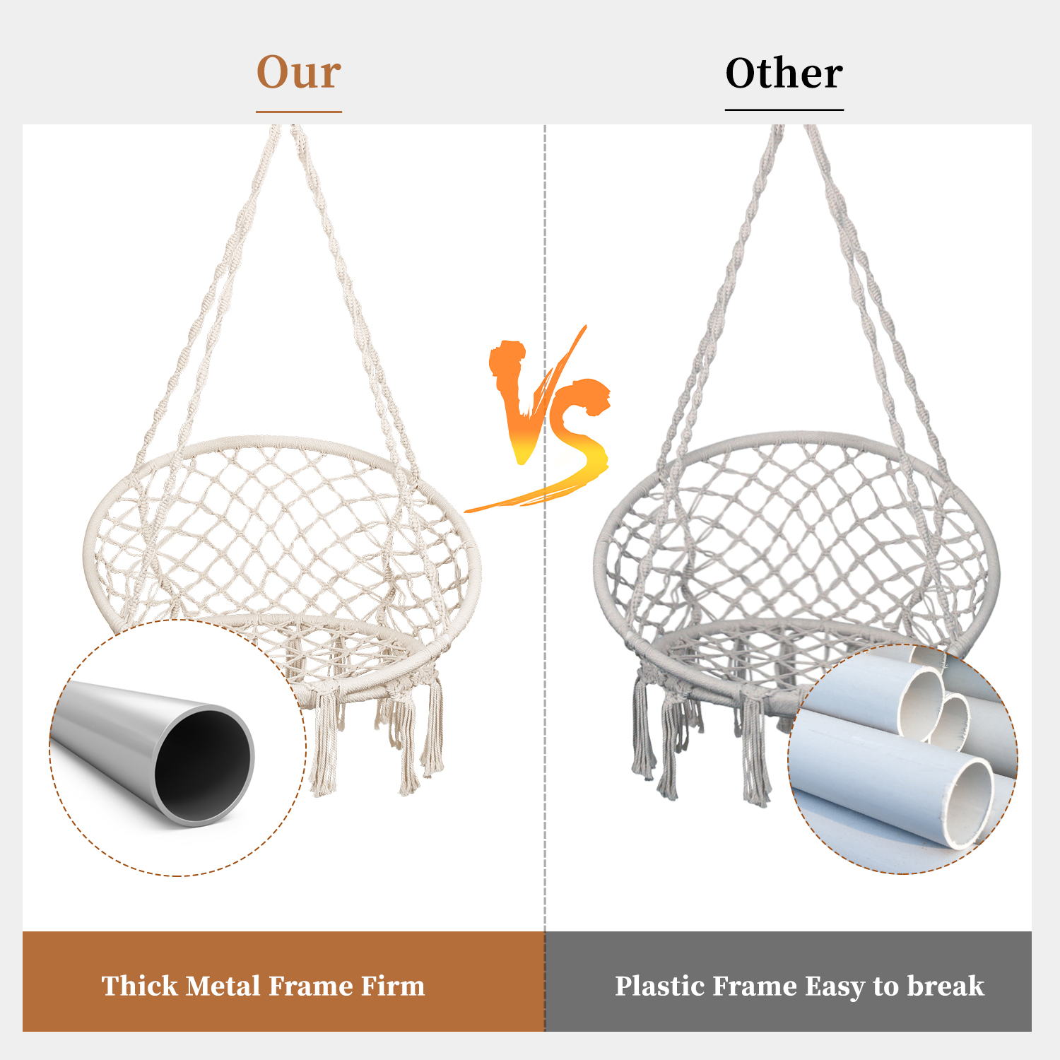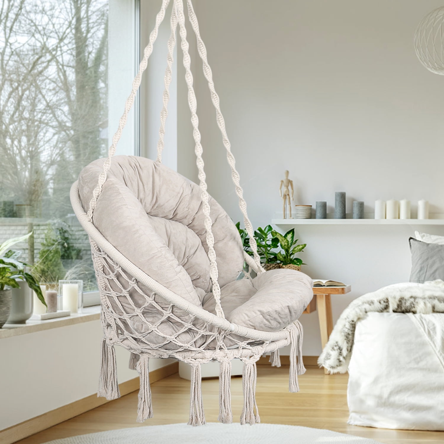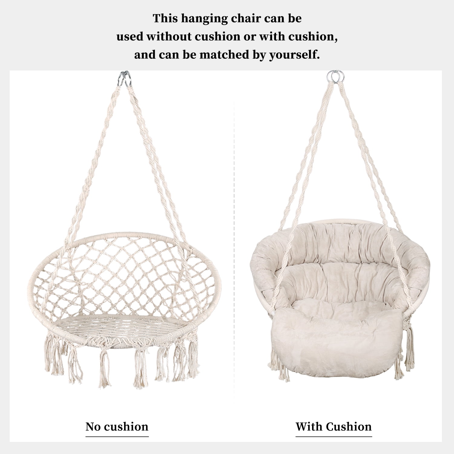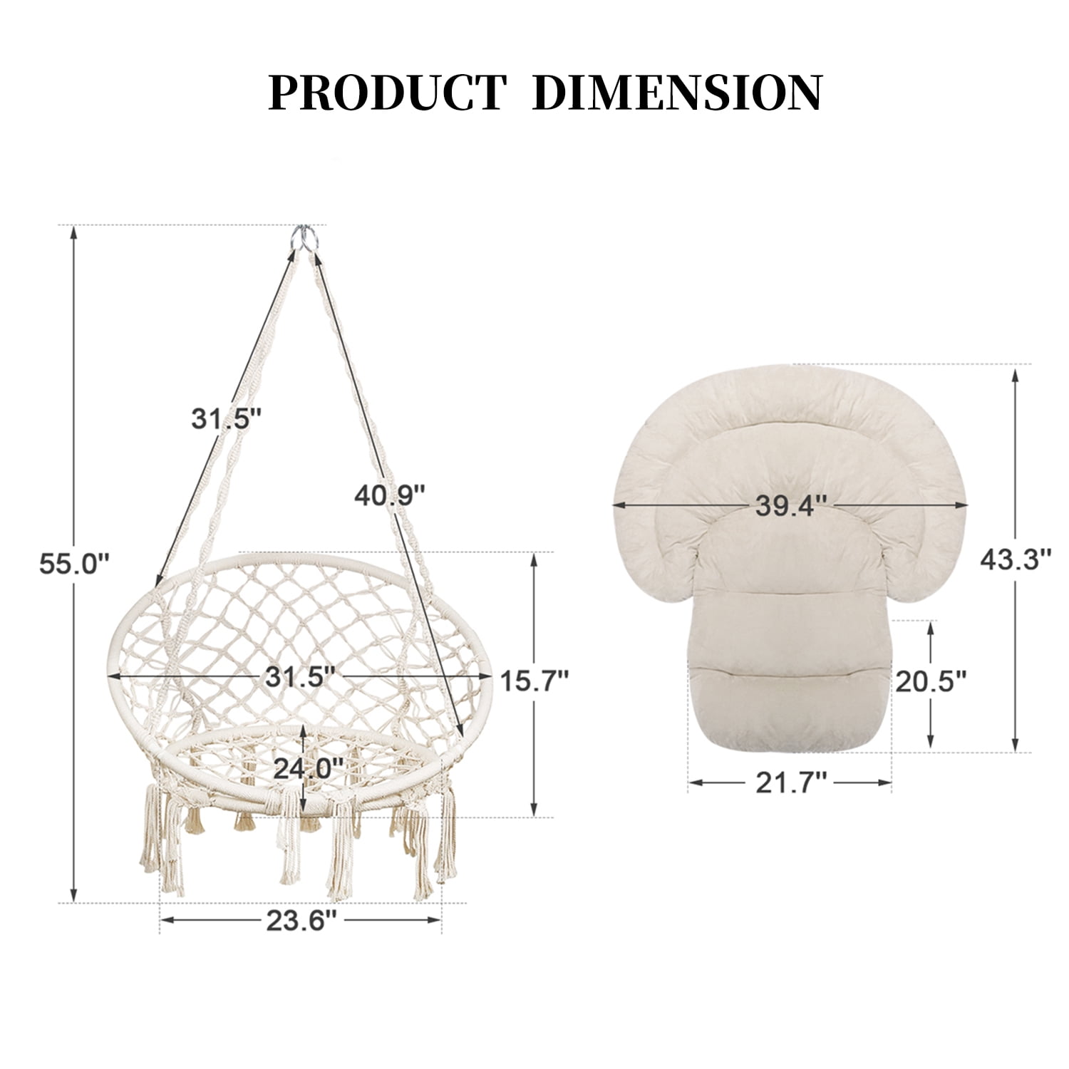 ▶ KEY FEATURES: 【Extra Large & Thick Cushion】 The extra plumped siting cushion provides your lower back, hips, thighs, knees with ultimate comfort. Faux suede Fabric with polypropylene cotton filled in, which is smooth to touch and bouncy to sit. 【Durable Material】 Our Bathonly macrame hammock chair is consist of strong polyester-cotton braids and heavy duty metal frame that holds up to 330 Pounds. 【Bohemian Craftsmanship】 This Bathonly Handmade tassel-covered hammock chair can be used as a light cradle and swing reading chair. With the tassel and grid decoration, this net chair adds fresh and natural style for your home. 【Easy to Hang】 With all hanging kits included, our hanging swing can be mounted on the ceiling or hung from trees, L/C shape hammock chair stands or any sturdy beams. It is the best gift idea for her to enjoy a relaxing indoor time of holidays! 【Warranty & Customer Service】 We support 90 days free return for any quality issues. We are committed to providing our customers with excellent Pre & After-Sales customer service. Please contact us if you have any questions or concerns. Specifications: Size:31.5 “L X 23.6” W X 47.2 “H Color: Beige Material: Cotton and Iron Hoops Weight: 6.95lb Weight Capacity: Max.330 Lb. Portable: Lightweight and easily portable Store After Use: Yes (in wet conditions) Package Includes: 1* Hammock Chair 1*Cushion Note: To extend the service life of the hammock chair, extend the color of the hammock chair, please store it in a cool dry place when not in use. In real life, due to the color difference between the computer monitor and the naked eye, the color may not be exactly the same as the photo.