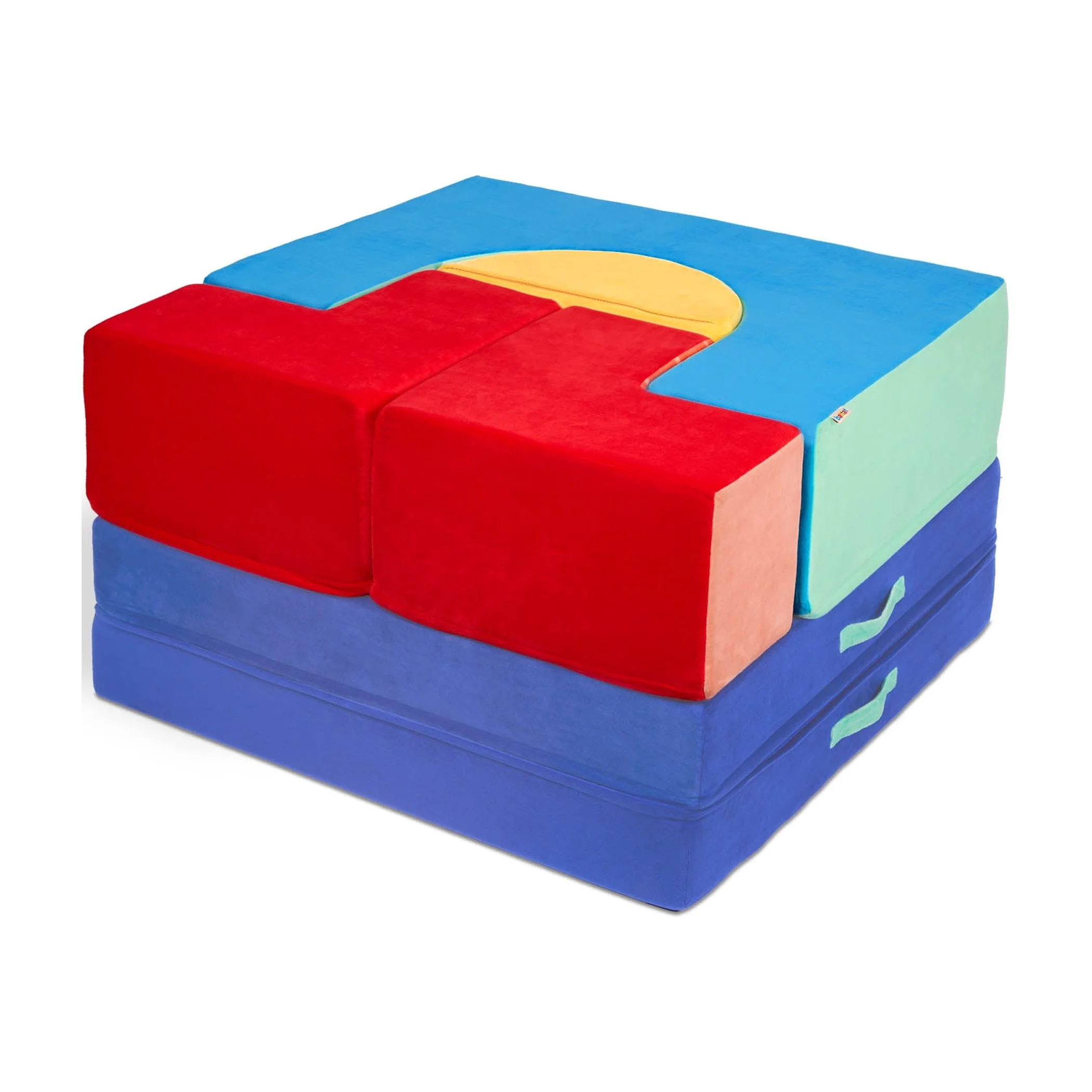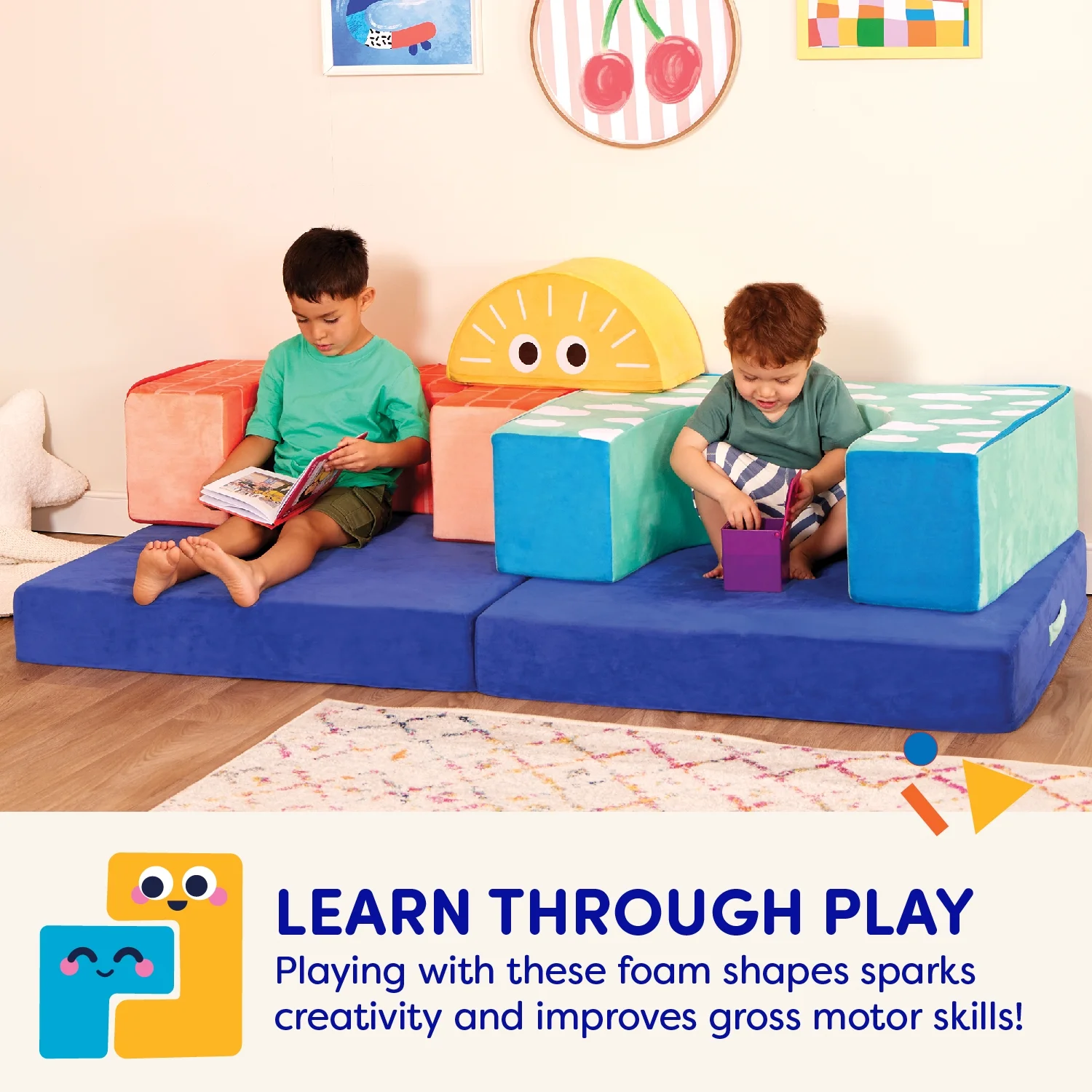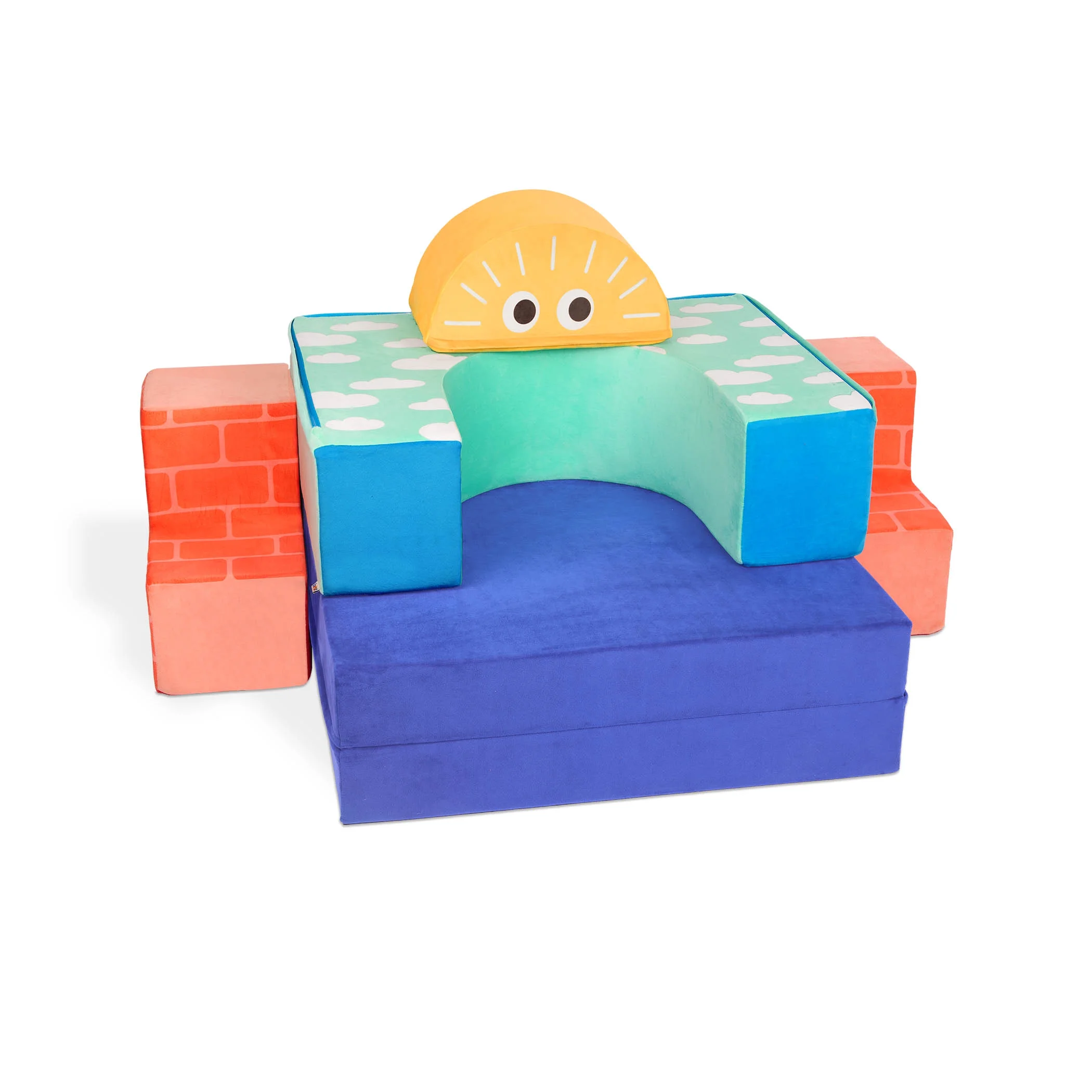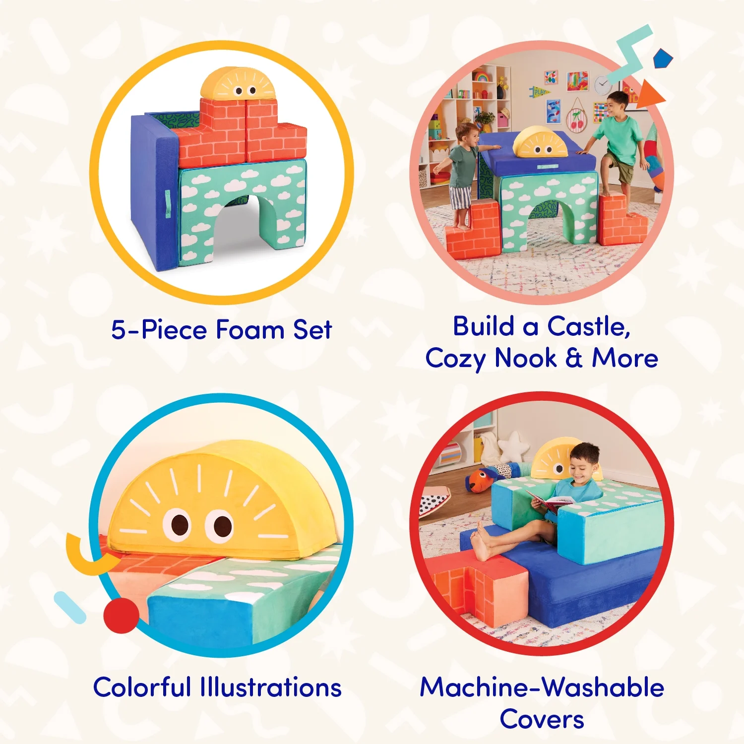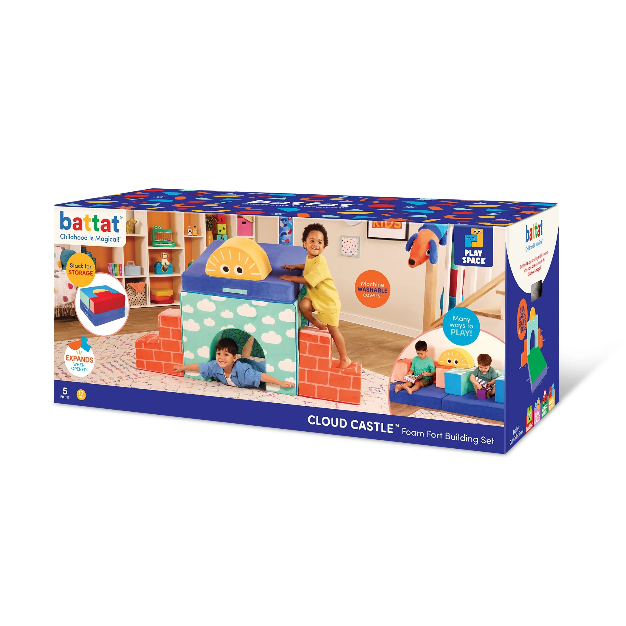 Build forts, build fun, and build memories with a colorful set of modular foam shapes Battat’s set includes 5 foam shapes – a foldable base, an arch, a half-sun, and 2 stairs The illustrated fabric covers help kids build fun forts, a couch, or anything else they dream up – and they’re even machine-washable Playing with these foam shapes sparks creativity, keeps kids active, and improves gross motor skills The Battat Cloud Castle set is recommended for kids 12 months and over