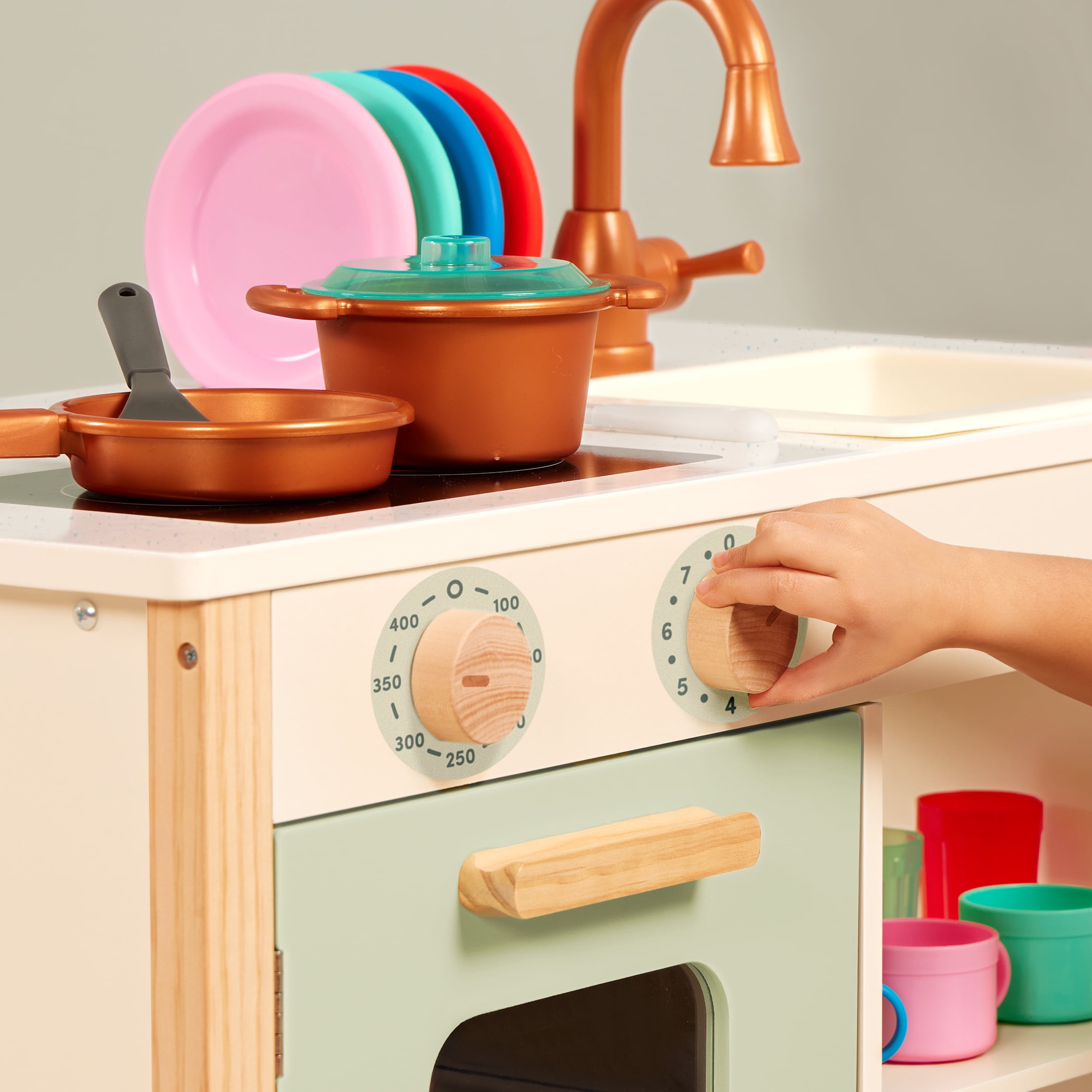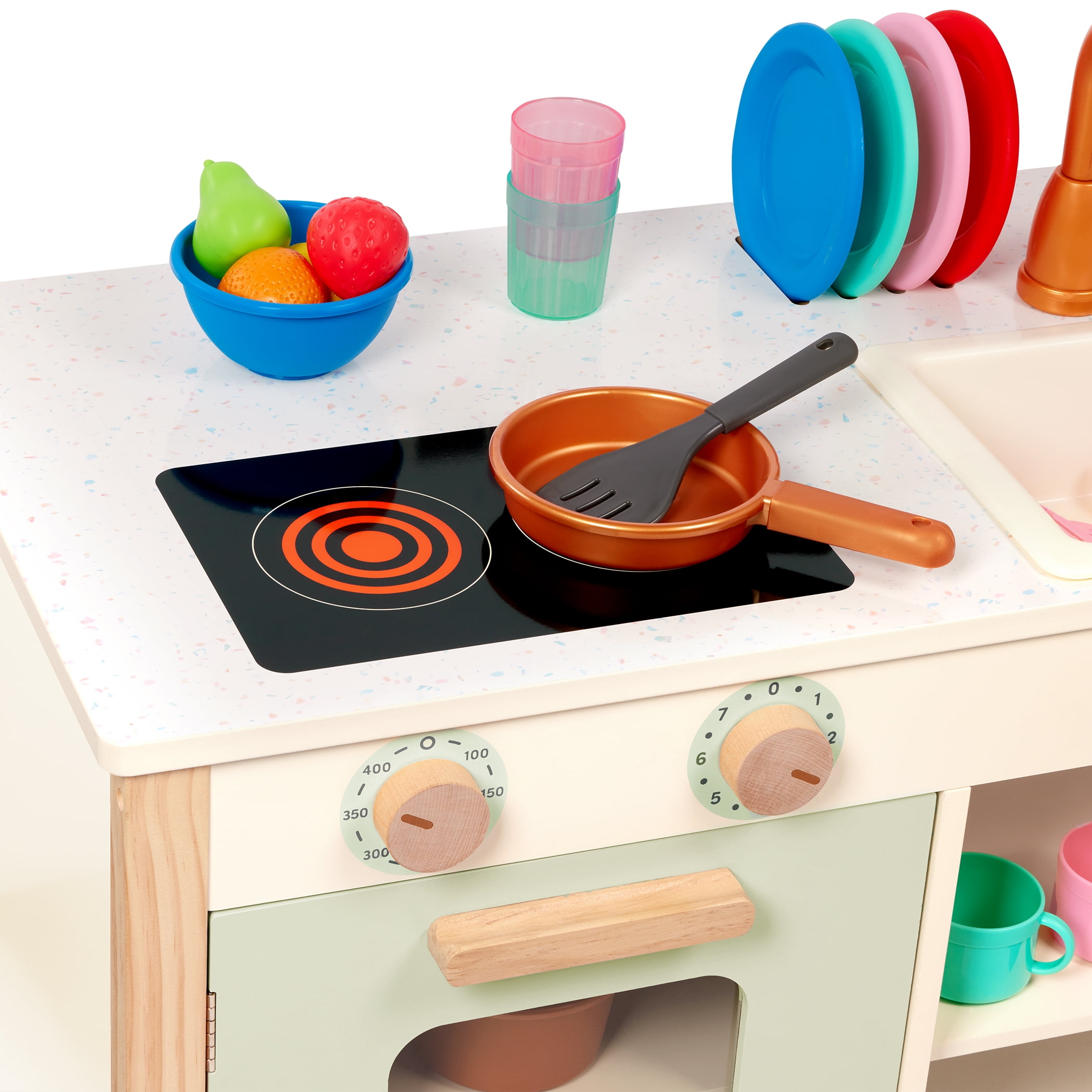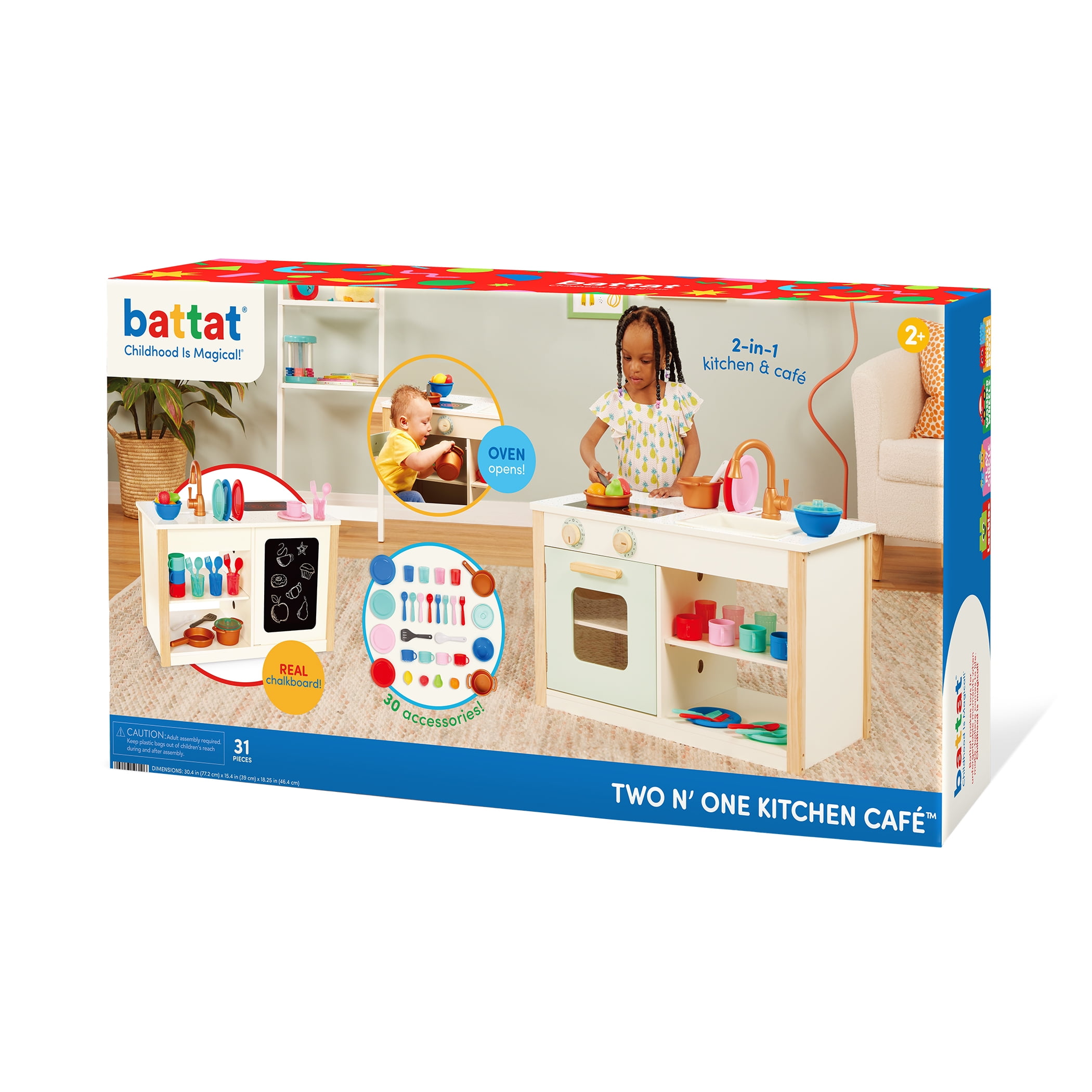 Prep, cook, and serve up smiles with the Two n’ One Kitchen Café from Battat! This 2-in-1 wooden play kitchen does double duty as a cozy kitchen and a bustling Café for lots of pretend play opportunities. The 31-piece set includes play food, dishes, cutlery, cooking utensils, and a real chalkboard for writing the day’s menu. Open the oven, turn the dials, and whip up pretend meals and treats. With two play areas in one, little chefs can go from cooking to running their little Café. Not to mention, the modern wooden design looks great in any room! Packed with accessories to spark creativity, this playset helps kids build social and language skills through endless role-playing fun. Recommended for toddlers, kids 2 years and over.