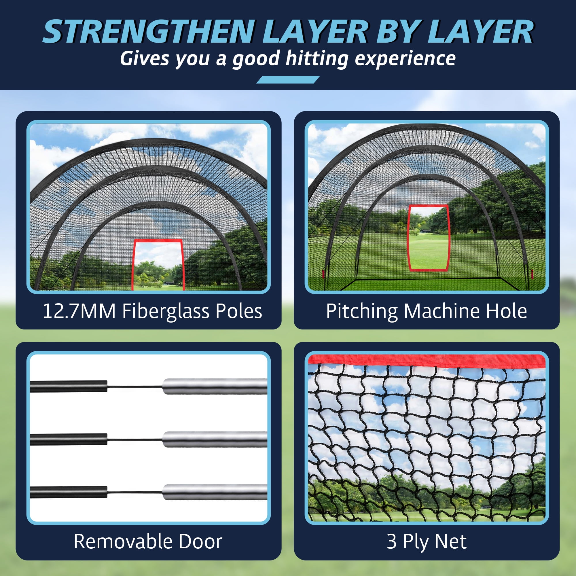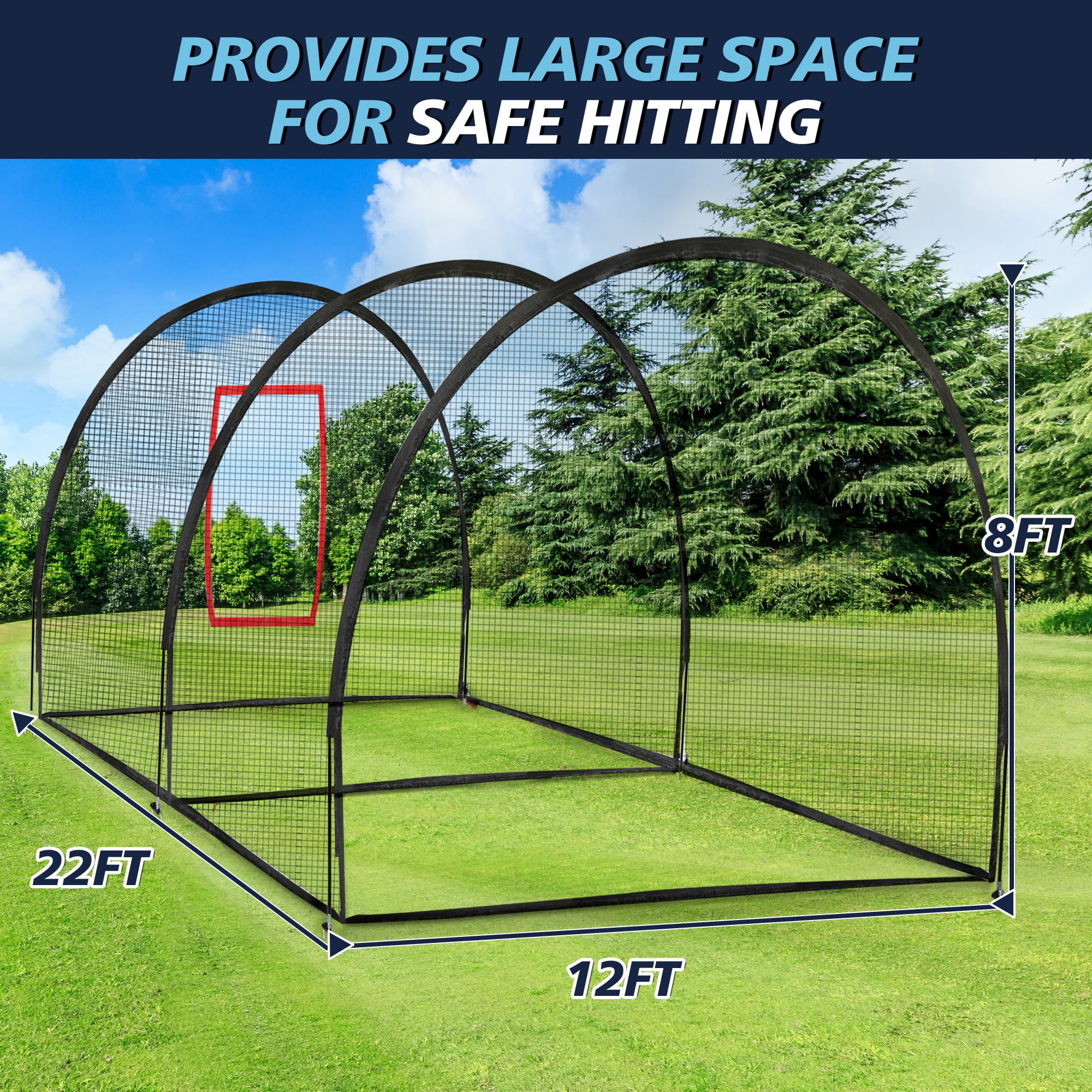 LARGE SIZE & COMPREHENSIVE PROTECTION – The cage measures 22x12x8FT, providing a large hitting space and extensive range for practice. With this batting cage at your home, you can now bid goodbye to chasing balls and enjoy a hassle-free training routine. IDEAL FOR OUTDOOR & HOME USE – This batting cage setup is great for your backyard, garden, or playground. With this heavy-duty cage, you can practice your baseball or softball skills anytime without schedule restraints. EXCELLENT QUALITY & DURABILITY – Our baseball batting cage is made of heavy duty materials for maximum durability. It can withstand the impact of baseballs or softballs, providing you with a long-lasting training tool for your backyard.