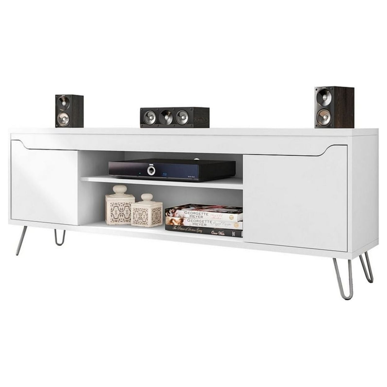 Baxter Mid-Century – Modern 62.99″ TV Stand with 4 Shelves in White Finish off your space with the TV stand Mid-Century Modern fans will appreciate and create the perfect living room entertainment mainstay for loved ones. Two center rectangular shelves store all your media accessories and essentials, while two concealed storage compartments keep things like books, magazines, or DVDs safely stashed away. With its clean lines, splayed metal feet, and sleek design, this piece will impress all your guests and become your best purchase. Specifications: Free Standing Modern TV Stand for Living Room and Bedroom use. Upon Assembly, Measures: 62.99 in. Length, 23.03 in. Height, 14.17 in. Depth. Recommended for a 46″ -60″ TV. Includes 2 Concealed Storage Compartments with Soft Close Door Features. Features Splayed Wire Metal Legs for Fashion and Durability. 6 Center Display and Media Shelves with 2 Side Concealed Storage Compartments. Includes 1 Media Hole for Wire Management. Home Assembly Required. All Hardware Included.