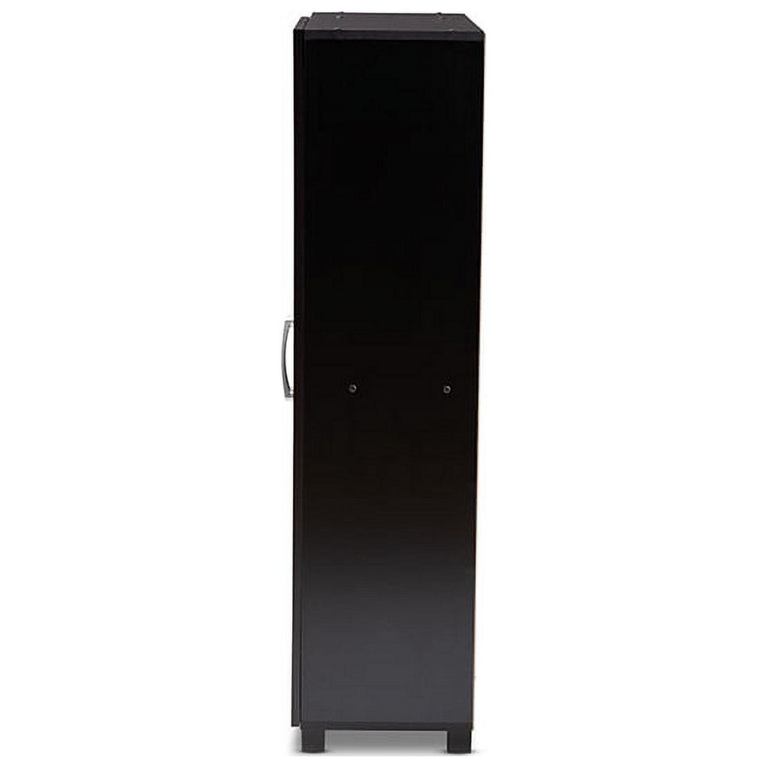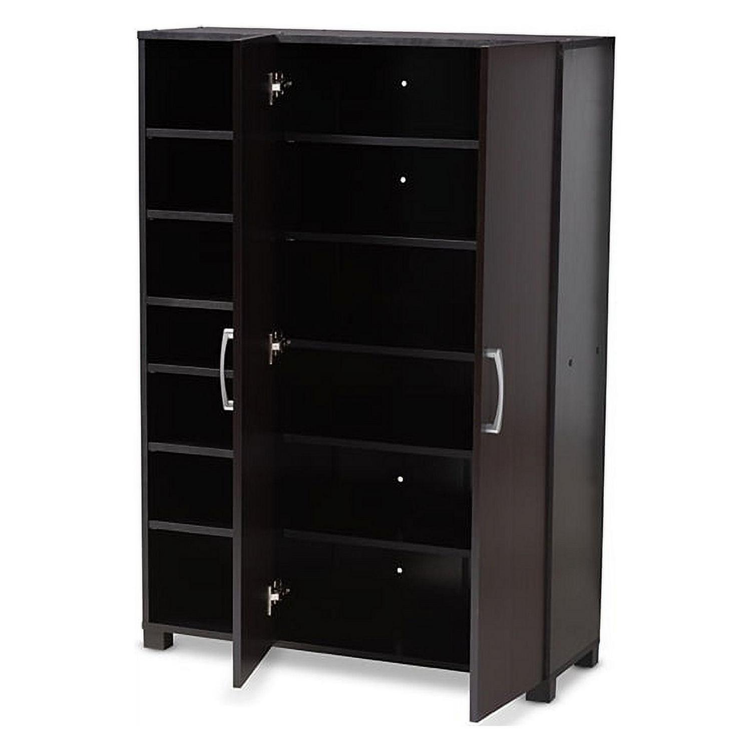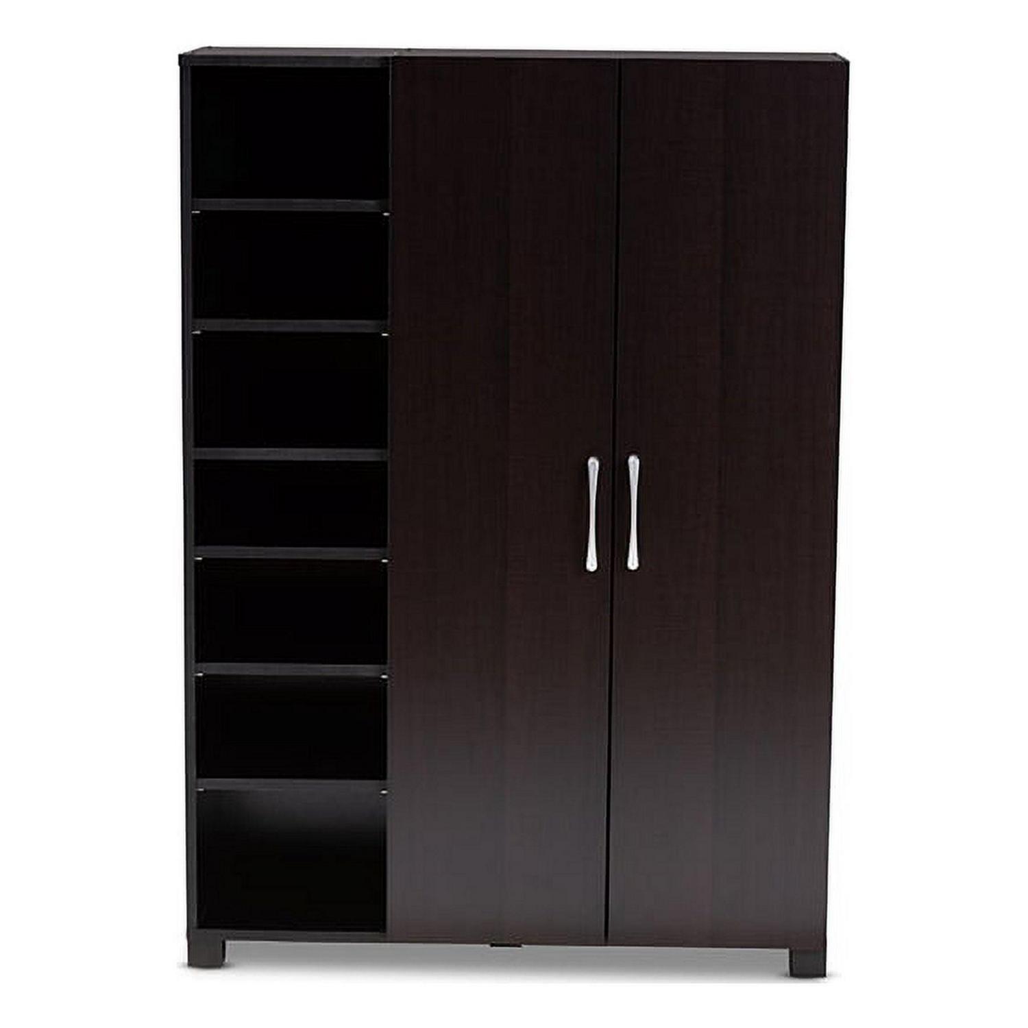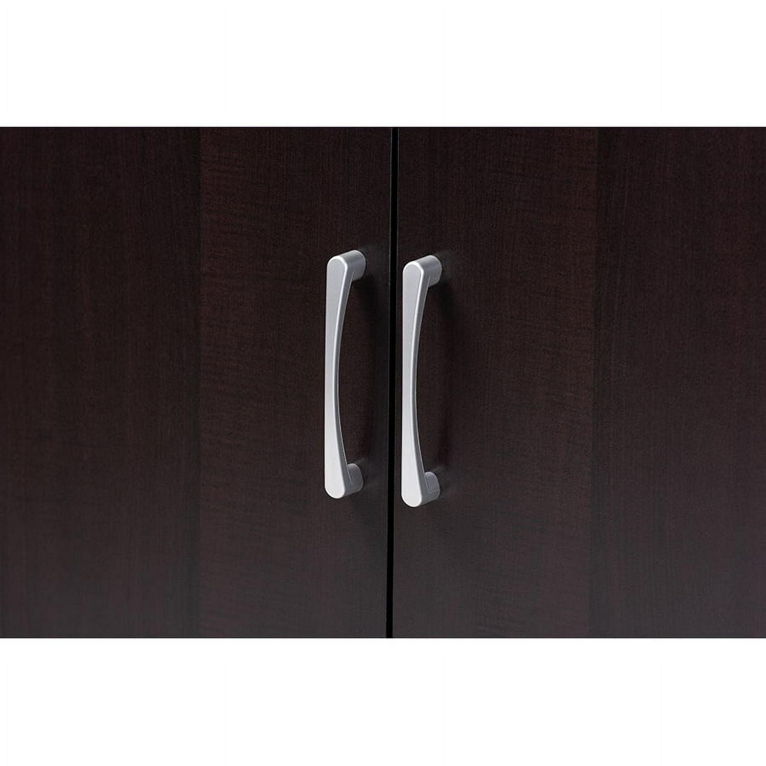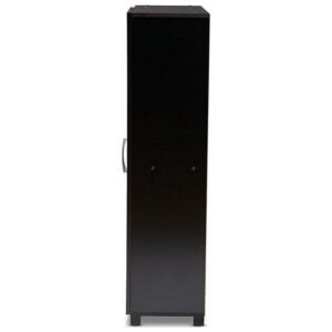 Neaten your foyer with theBaxton Studio Marine 2 Door Entryway Shoe Storage Cabinet with Open Shelves. This engineered wood cabinet has thirteen shelves to store nineteen pairs of shoes. Keep your family’s most used shoes in the seven open shelves for easy access. The other six shelves are concealed by two cabinet doors with silver PVC handles. Done in a dark brown finish, this cabinet is chic enough to use in your living room or entryway. Some assembly required.