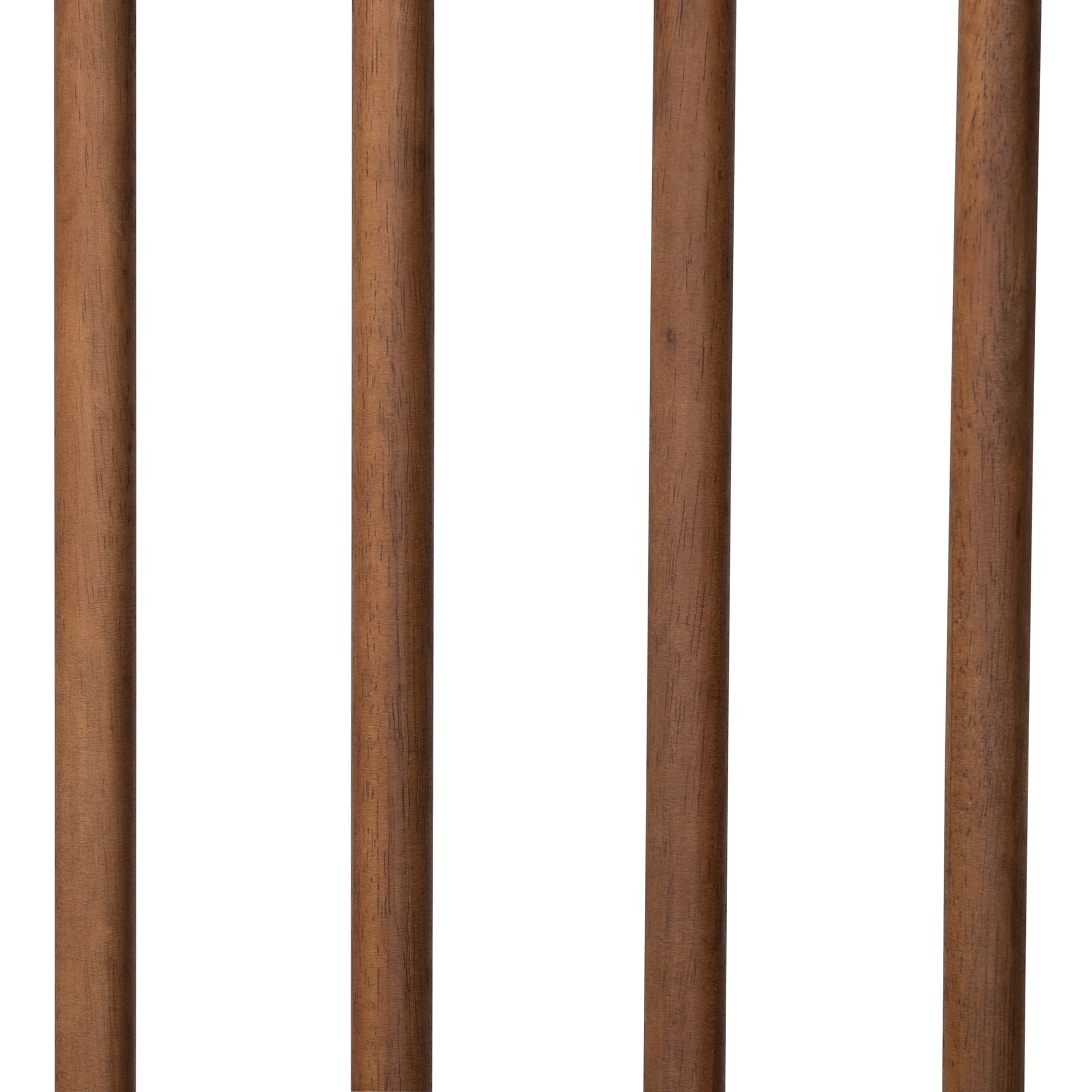 Constructed from rubberwood and engineered wood Walnut brown finish Spindle headboard Wood slats eliminate the need for a box spring Assembly required Product Weight: 100.6 Pound Package Weight: 111.6 Pound Overall Dimensions: 43.30″ High x 82.30″ Wide x 86.50″ Deep Inside Dimensions (mattress size): 78.00″ Wide x 81.10″ Deep Headboard Dimensions: 58.00″ Wide x 43.30″ High x 0.8″ Thick Distance from top of slat to bottom of headboard: 8.70″ Distance between each slat: 3.50″ Height from Floor to Top of Slat: 11.20″ High Legs: 9.60″ High Product Color: Walnut Brown Product Composition: Rubberwood/MDF