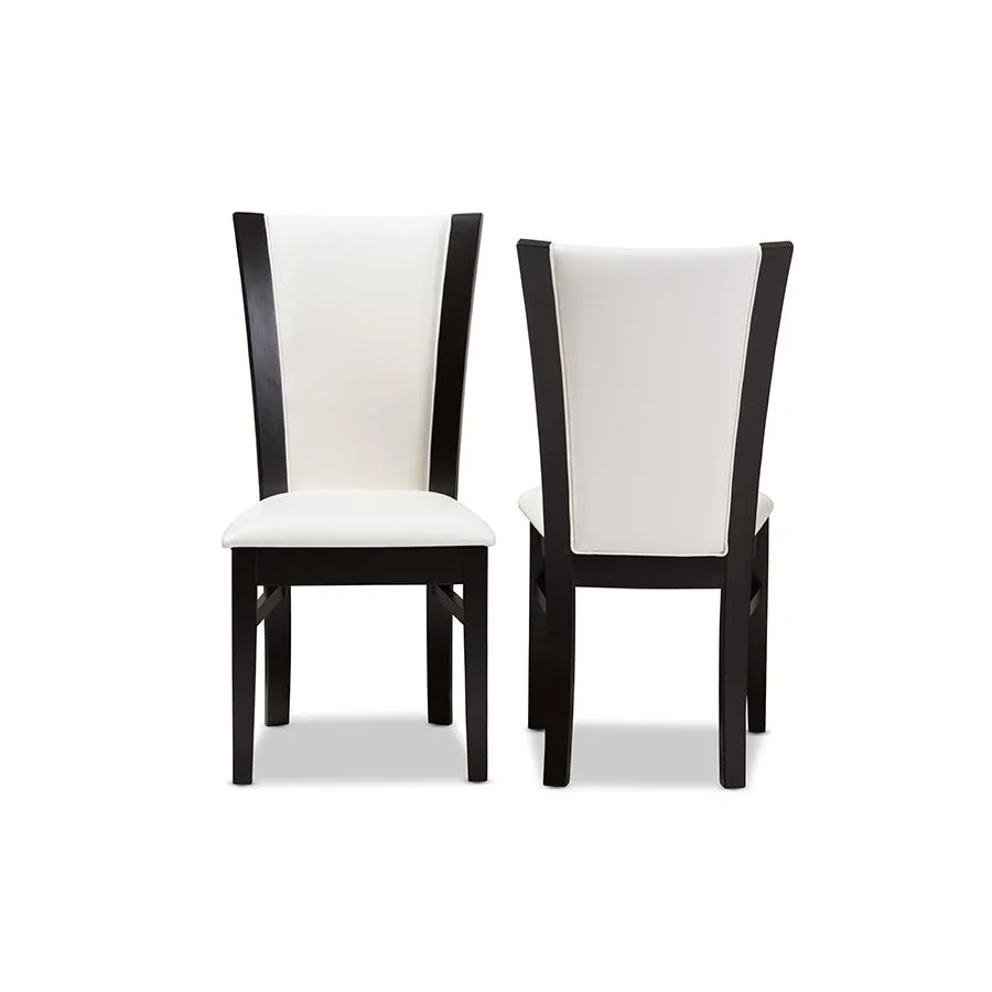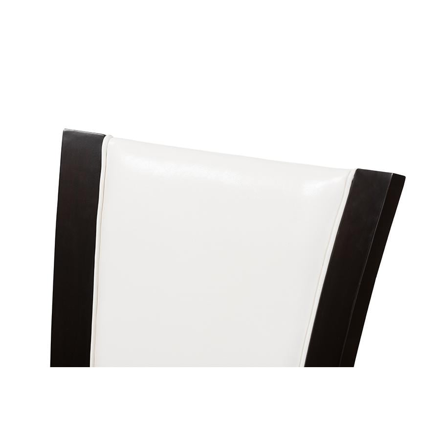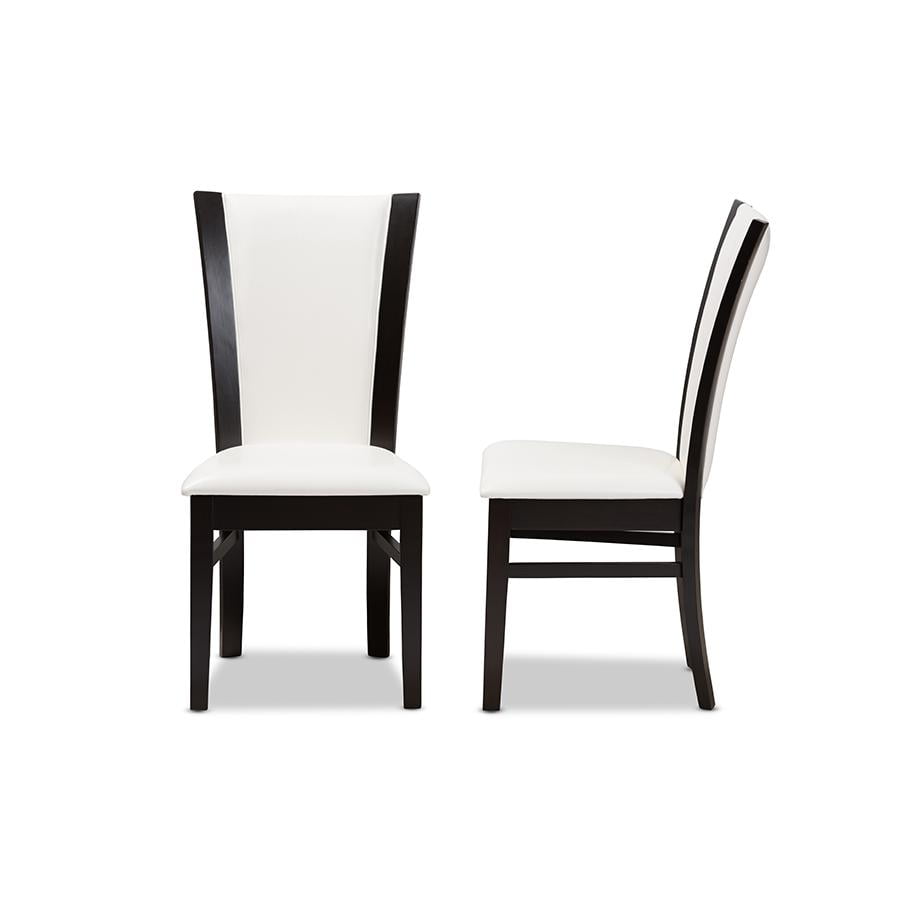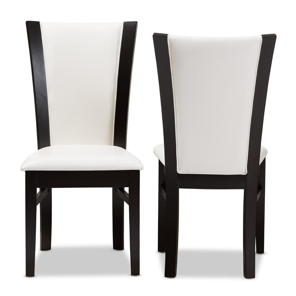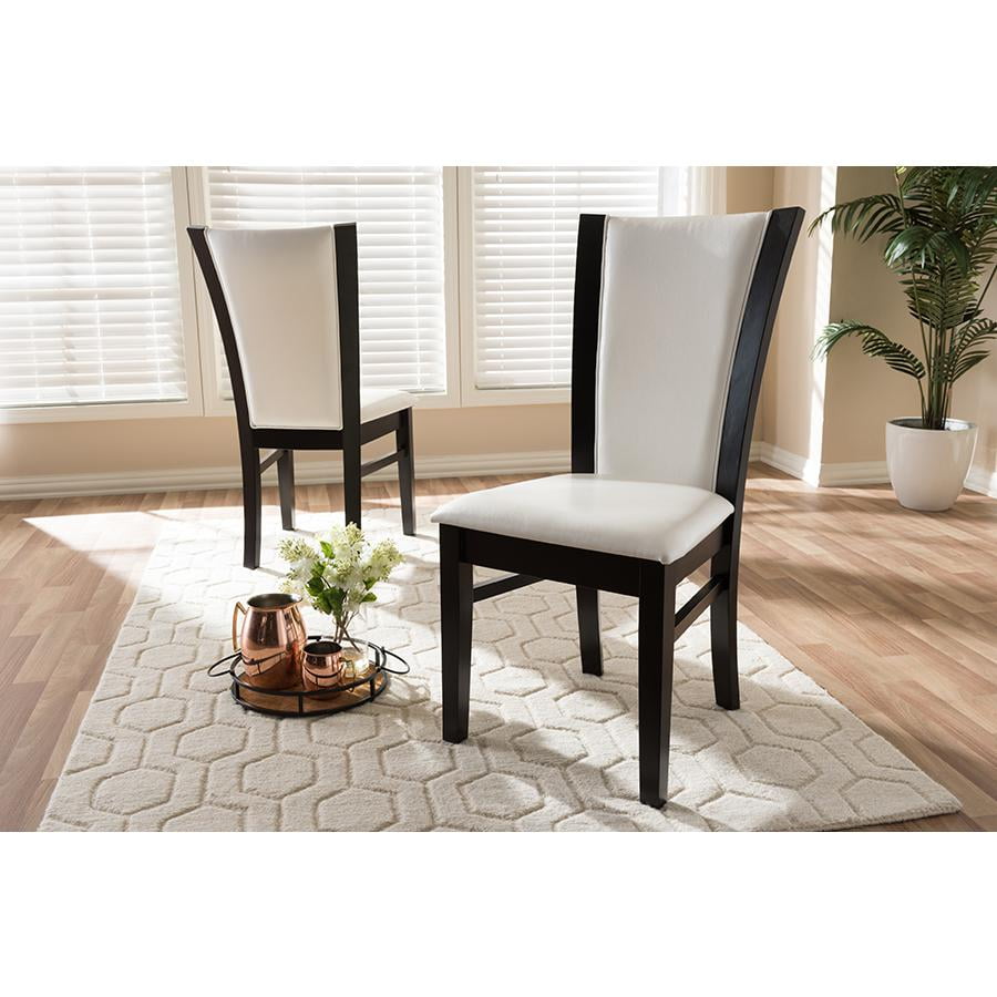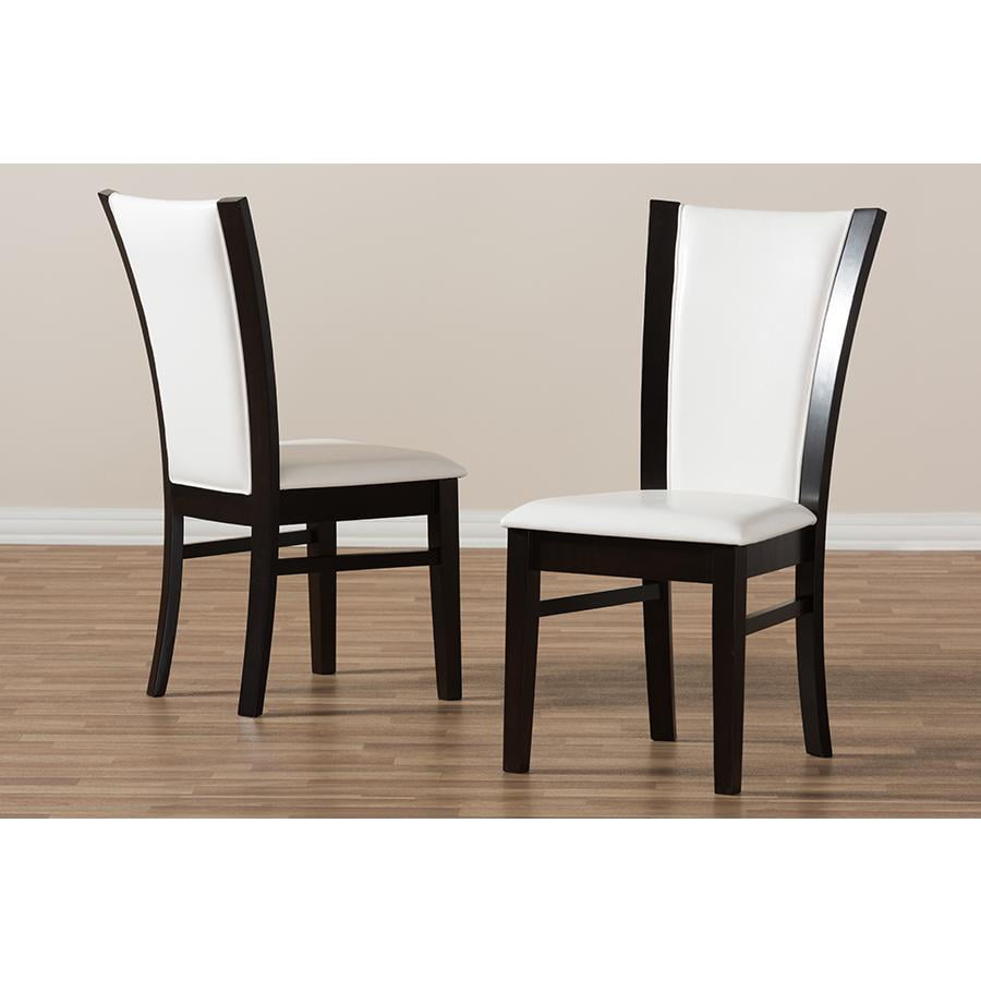 Modern and contemporary dining chair Set includes two chairs Solid rubberwood construction Dark brown finishing Tapered legs Upholstered seat in white faux leather Assembly required