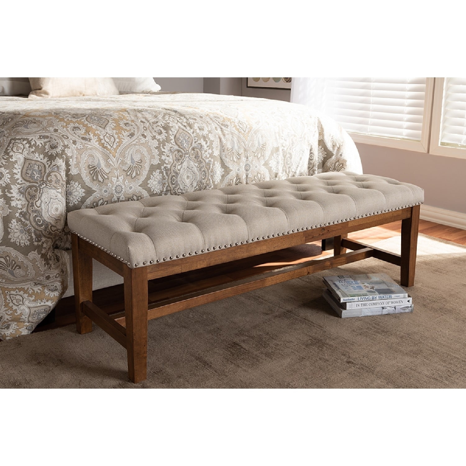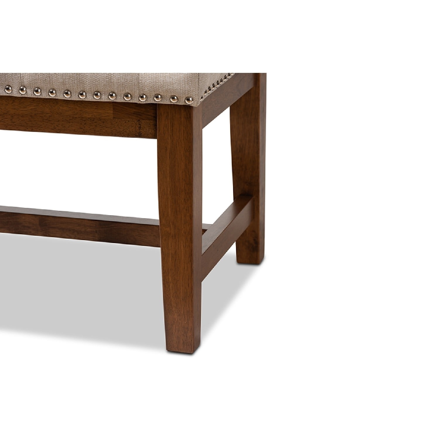 Baxton Studio Ainsley Modern and Contemporary Light Beige Fabric Upholstered Walnut Finished Solid Rubberwood Bench The Ainsley bench is that last essential piece of furniture that will bring your space together. The modern and contemporary-inspired design is versatile, and easy to coordinate with a wide range of dcor. The sturdy, solid rubberwood frame is inviting with its walnut brown finishing. The Ainsley features a foam padded seat, upholstered in a chic light beige fabric. The seat is button-tufted for a sophisticated and lasting style. Add extra seating to your entryway, livingroom, or even your guest room and bed room with the Ainsley. Made in Malaysia, the bench requires assembly. Specifications: Modern and contemporary bench Light beige fabric upholstery Walnut finished solid rubberwood frame Button-tufted seat Foam padding Assembly required Made in Malaysia