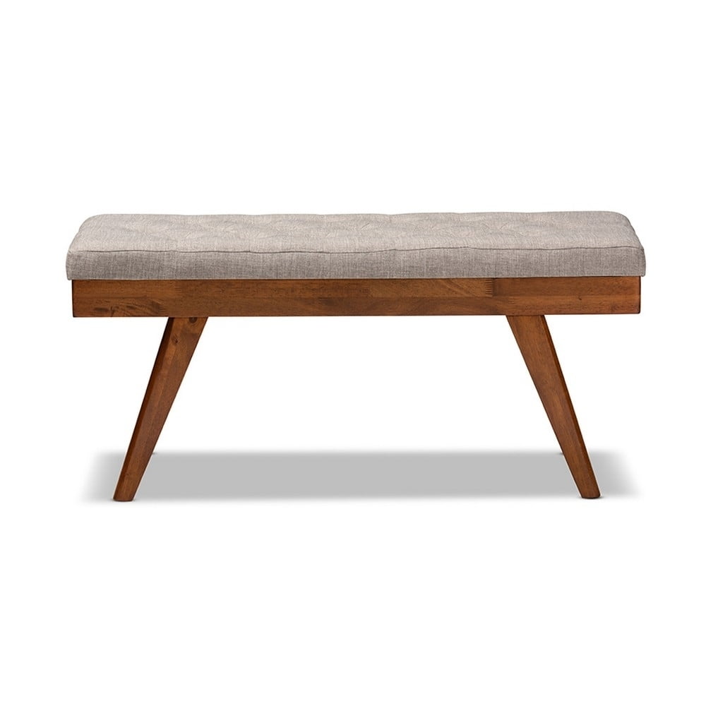 Baxton Studio Alona Mid-Century Modern Light Grey Fabric Upholstered Wood Dining Bench Add some visual interest to your dining room setup with the Alona dining bench. This wood bench is upholstered in a soft, grey polyester fabric that is complimentary to the walnut brown finish on the wood. Influenced by elements of mid-century modern design, the Alona features angled, tapered legs. This versatile piece works well as seating at a dining table, or is equally suitable for use as an accent piece in the entryway. The Alona dining bench is made in Malaysia and requires assembly. Specifications: Mid-century modern dining bench Constructed from solid rubberwood Walnut brown finish Polyester fabric upholstery Button tufted Assembly required Made in Malaysia
