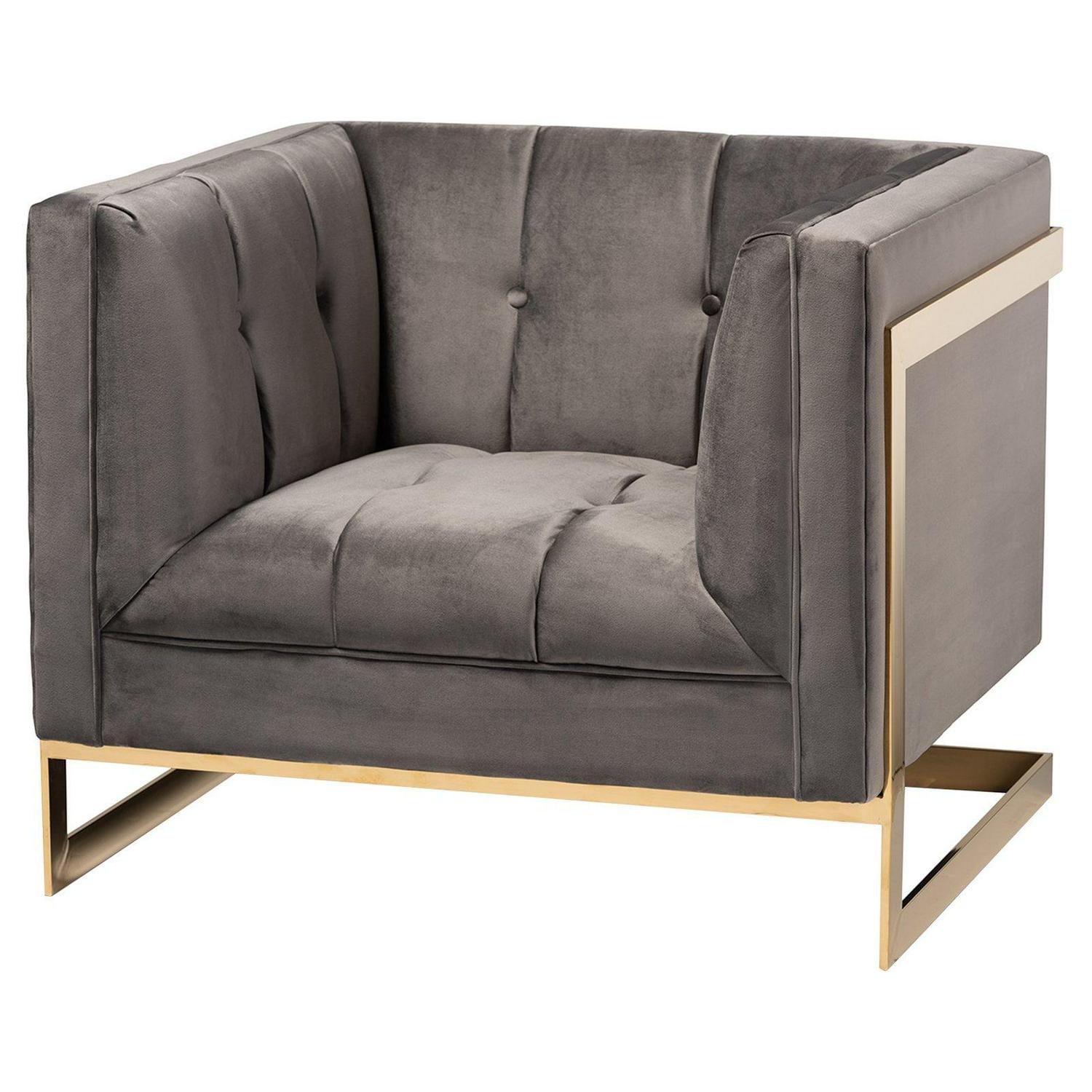 Elevate your living space with the striking glamour of the Ambra armchair. This tailored armchair features rows of channel tufting that accentuate the subtle sheen in the soft velvet fabric upholstery. Button tufting and piping add a touch of refinement. The armchair rests on a stunning gold-tone stainless steel frame, providing an open, airy ambiance. Designed for both style and comfort, the Ambra is generously padded with foam to provide a truly luxurious feel. Pair this armchair with the Ambra sofa to complete the look. The Ambra armchair is made in China and will arrive Yes.