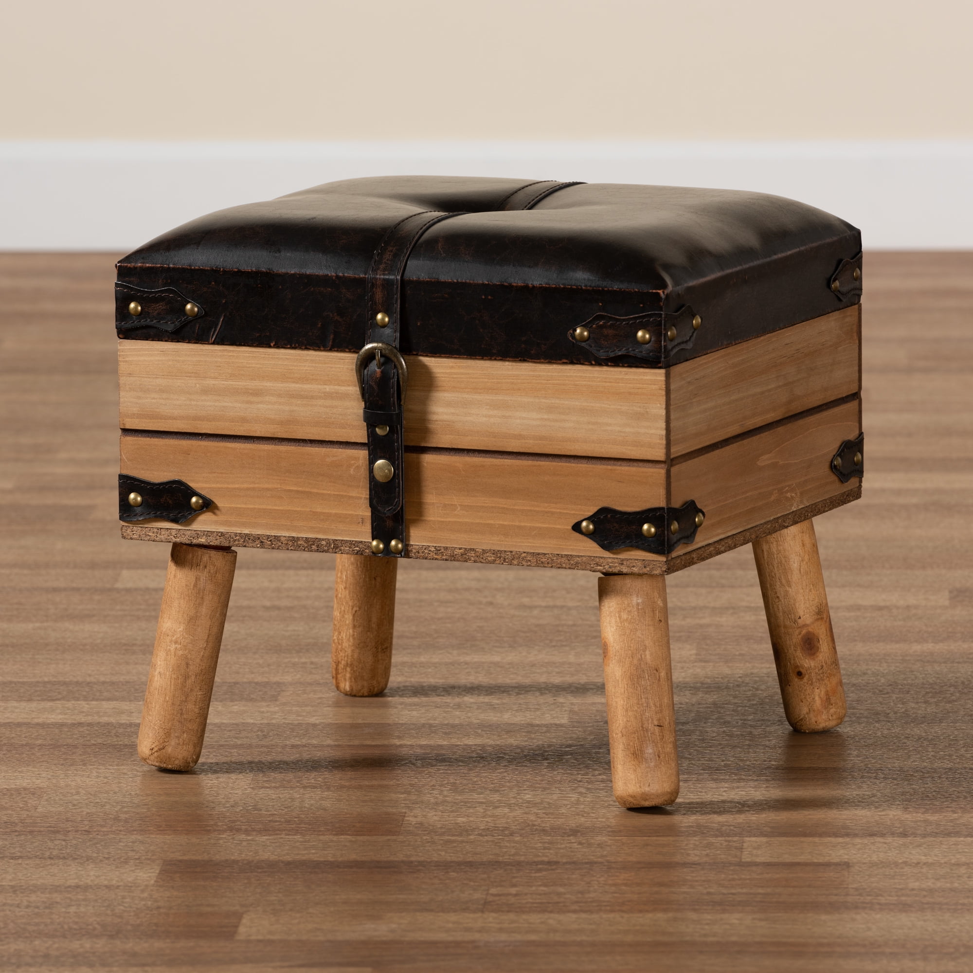 Baxton Studio Amena Rustic Transitional Dark Brown PU Leather Upholstered and Oak Finished Wood Small Storage Ottoman