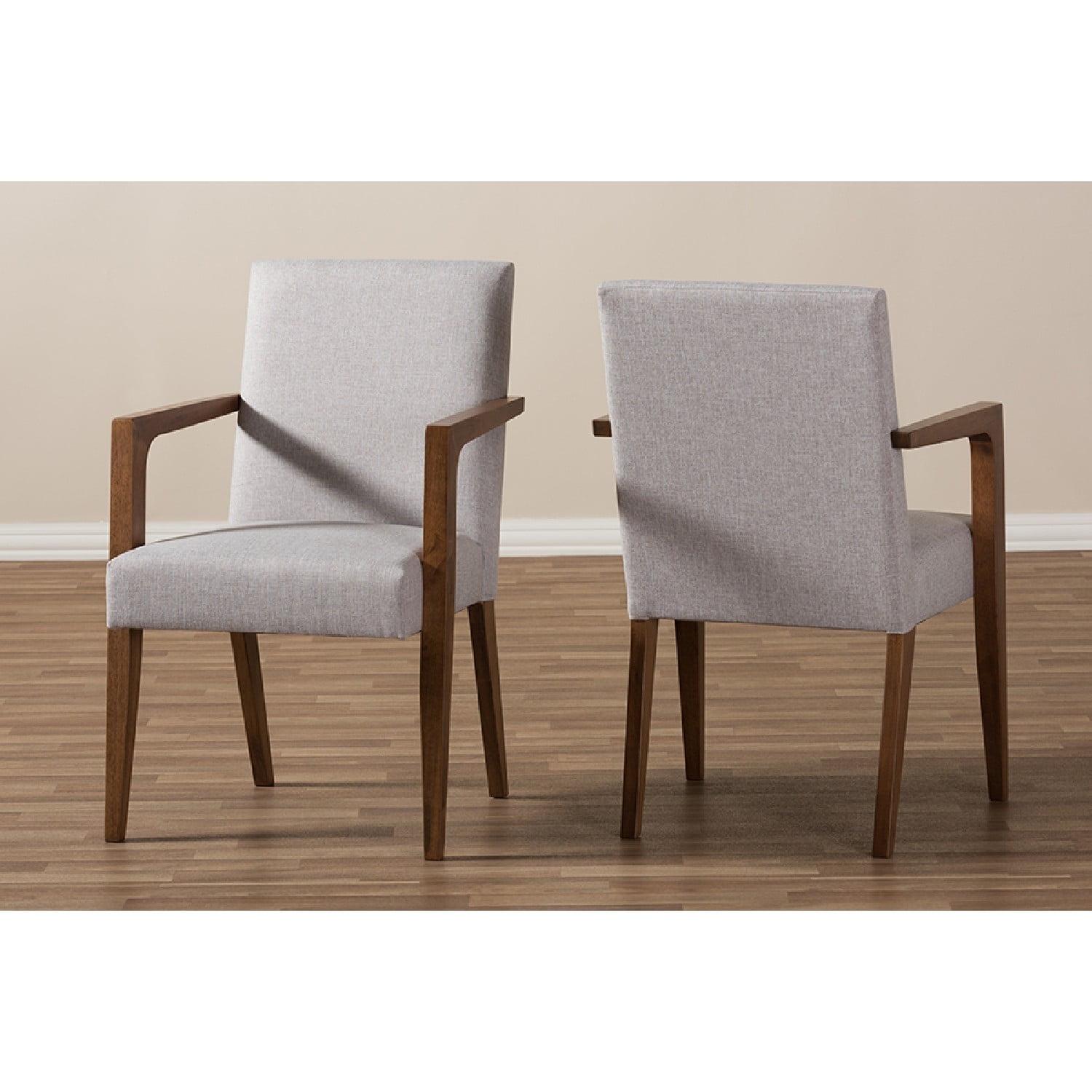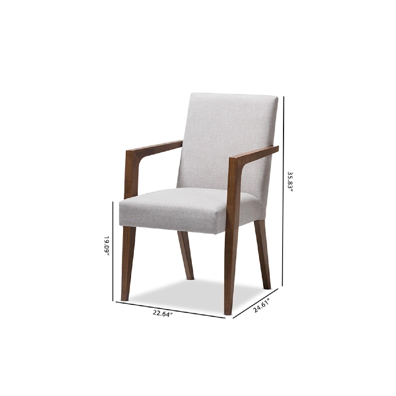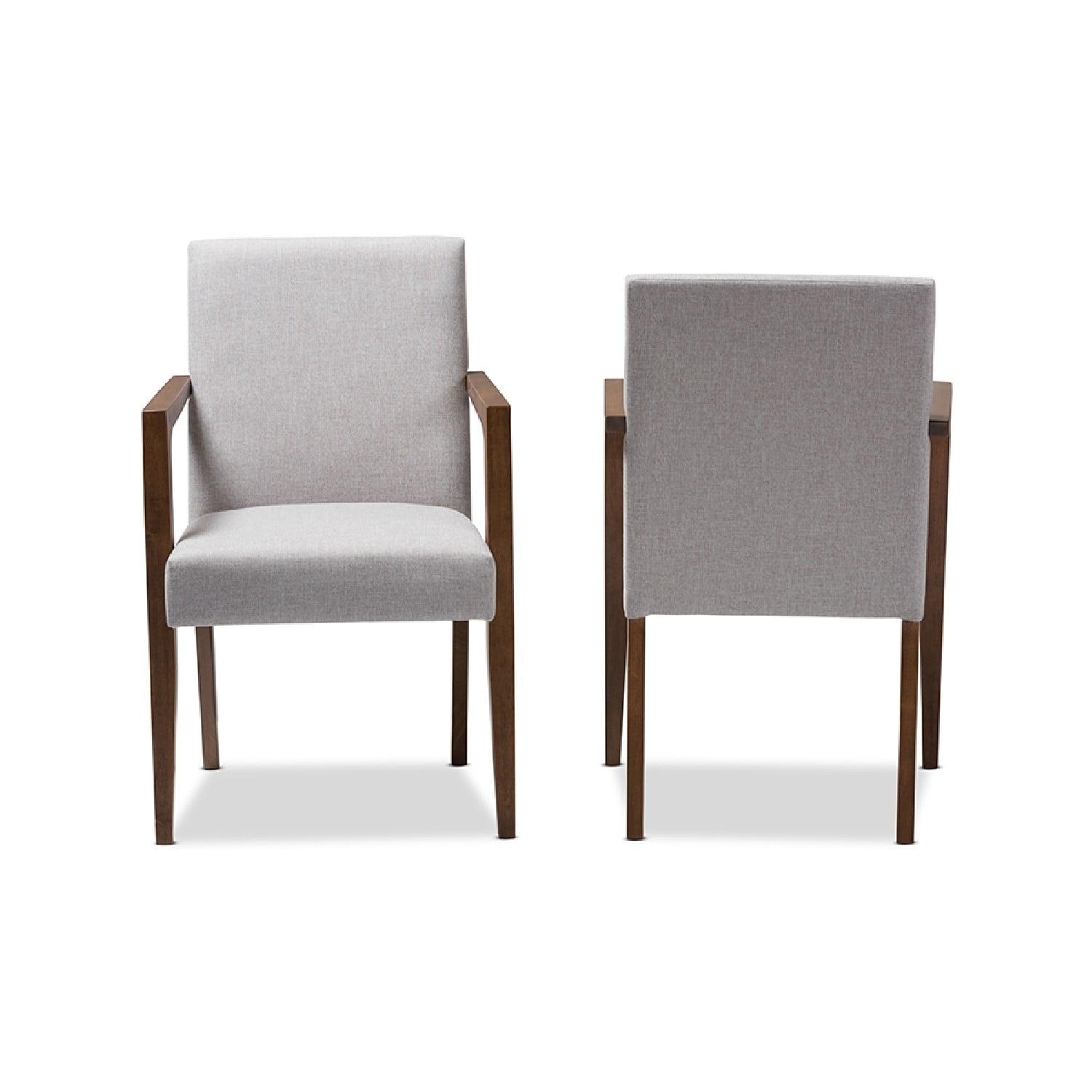 Baxton Studio Andrea Mid-Century Modern Greyish Beige Upholstered Wooden Armchair (Set of 2) With character and style, the Andrea wooden armchair brings distinct edges to the modern home. Featuring classically timeless and intuitively versatile, the Andrea is constructed of solid wood frame for durability. Upholstered in greyish beige polyester fabric, the back and seat cushions are foam-filled to provide comfort and support. The legs and armrests in walnut finishing, built geometrically, blending in aesthetic while lending support and comfort. Sturdily constructed, the Andrea armchair looks great from all angles, whether in a lounge arrangement, public waiting area or private office. Made in Malaysia, the Andrea accent chair will be a standout piece in any modern interior.