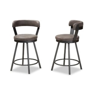Baxton Studio Arcene Rustic and Industrial Grey Fabric Upholstered Counter Stool Set of 2 Achieve lasting style with the Arcene swivel counter stool. The sturdy metal composition and neutral coloring are indicative of the stools rustic and industrial-inspired design. The metal frame is finished in a matte antique silver, complemented by suede-like fabric upholstered seats. The seats of the Arcene are foam padded, and the open work chair backs are curved to encourage hours of comfortable seating. A 360-degree spin element keeps you in the flow of conversation. These stools can be easily coordinated with the existing decor in your kitchen, dining room, or breakfast nook. Made in China, the Arcene requires assembly.