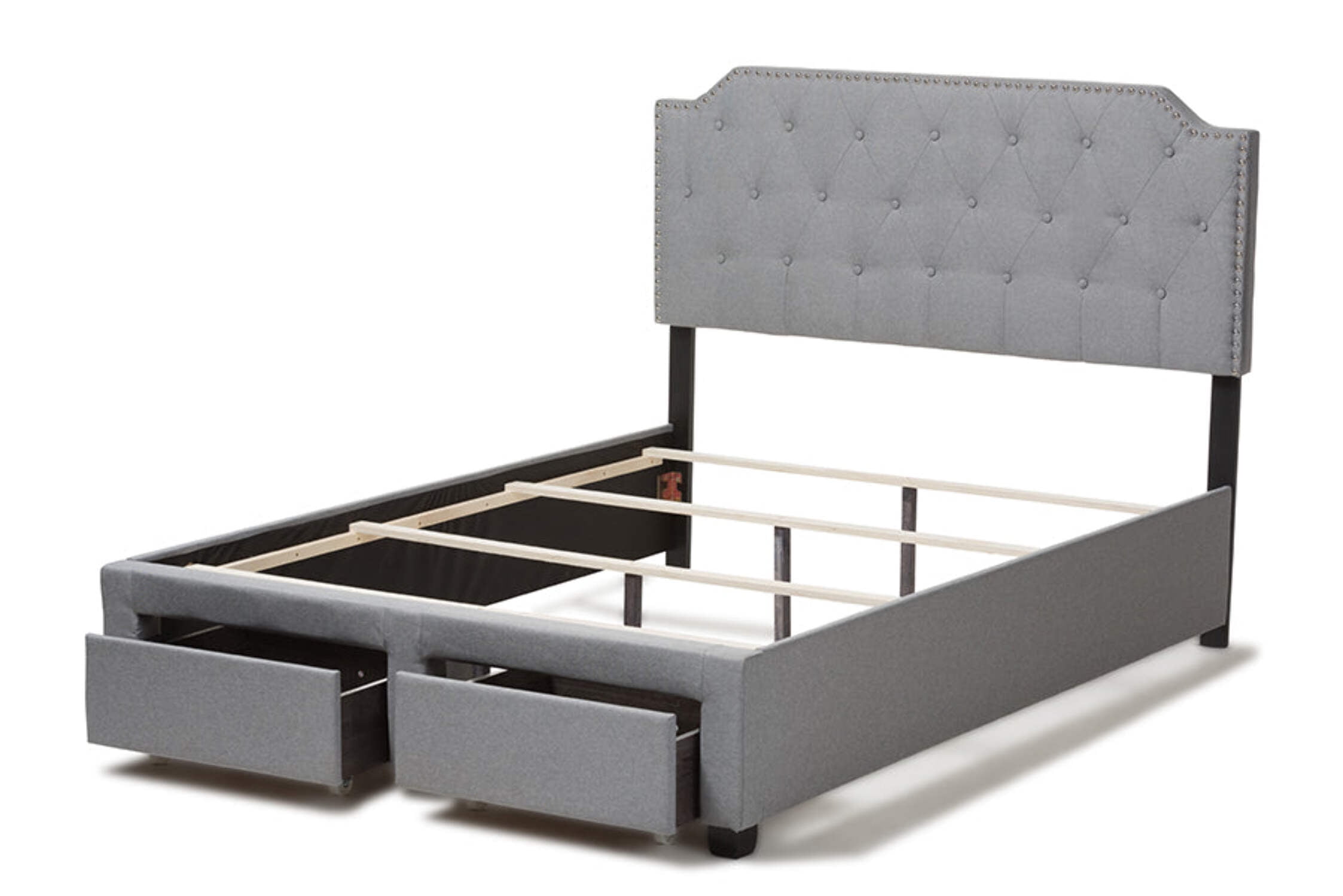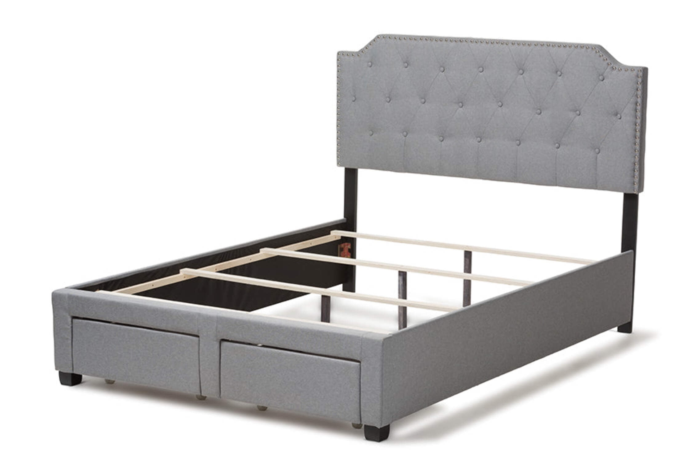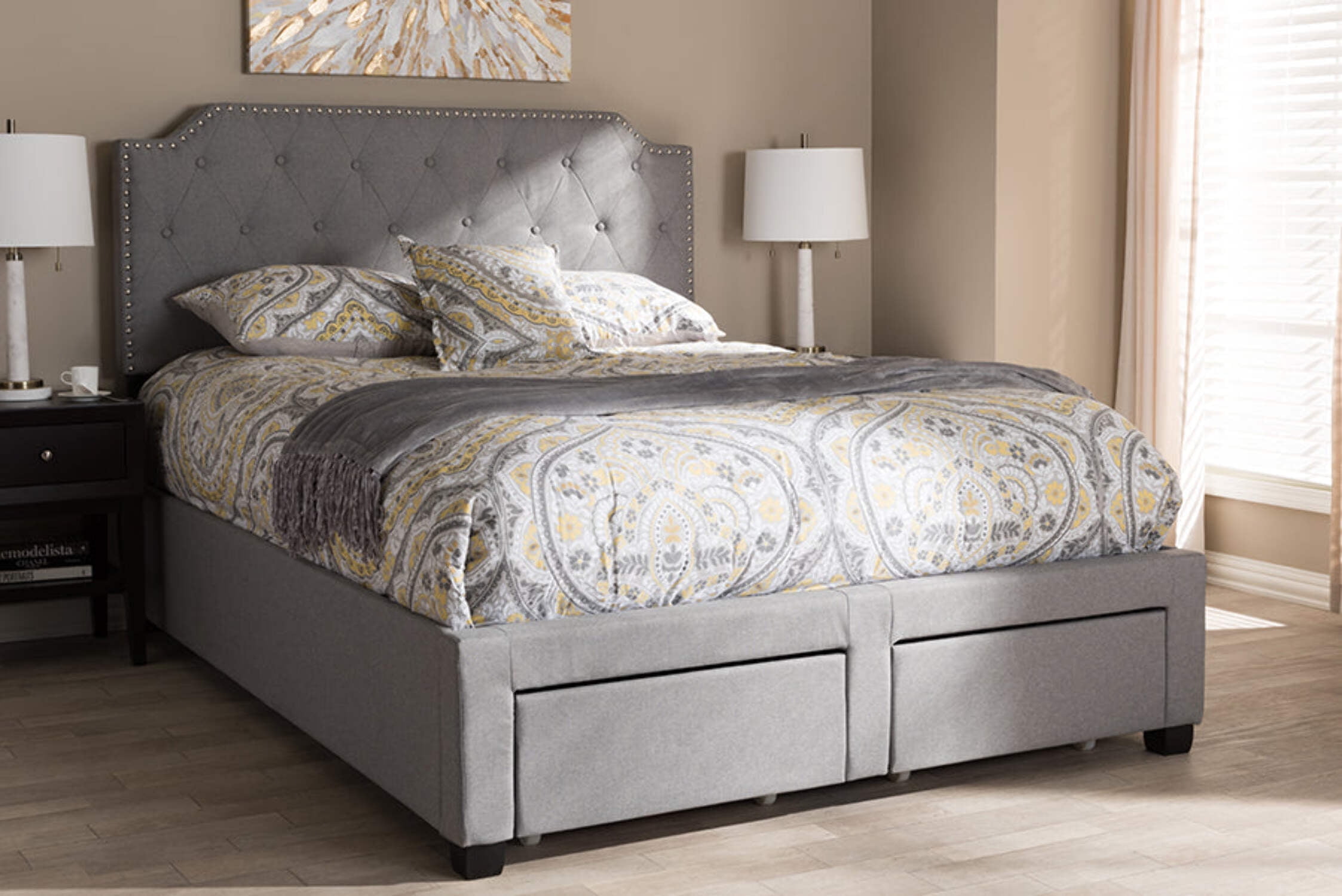 Come home to the stylish yet practical Aubrianne king size storage bed. This modern and contemporary-inspired bed is upholstered in a delightful gray fabric. The Aubrianne is detailed with button-tufting and a nail head trim on the headboard for a touch of glamour. Offering more than just luxe style, the bed also features two drawers at the foot of the bed for practical and discreet storage, perfect for extra linens, pillows, or even shoes. The inclusion of the drawers make the Aubrianne a perfect addition to your bedroom and guest rooms. This storage bed is designed for use with a mattress only. Available in king and queen sizes, this storage bed is made in Malaysia. Assembly required.