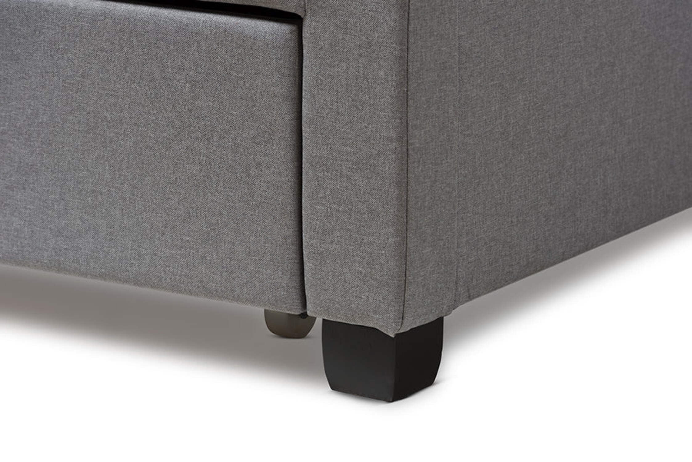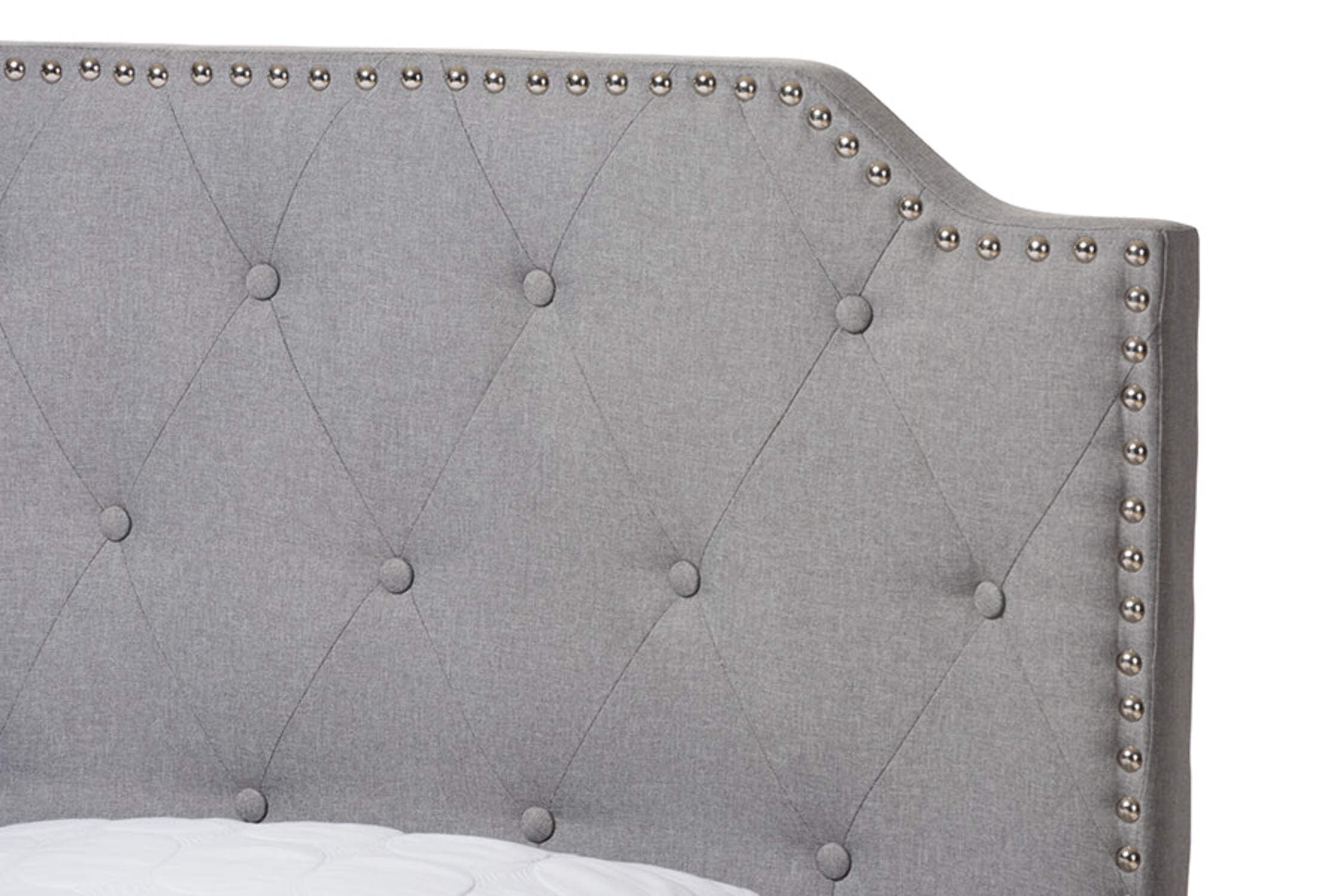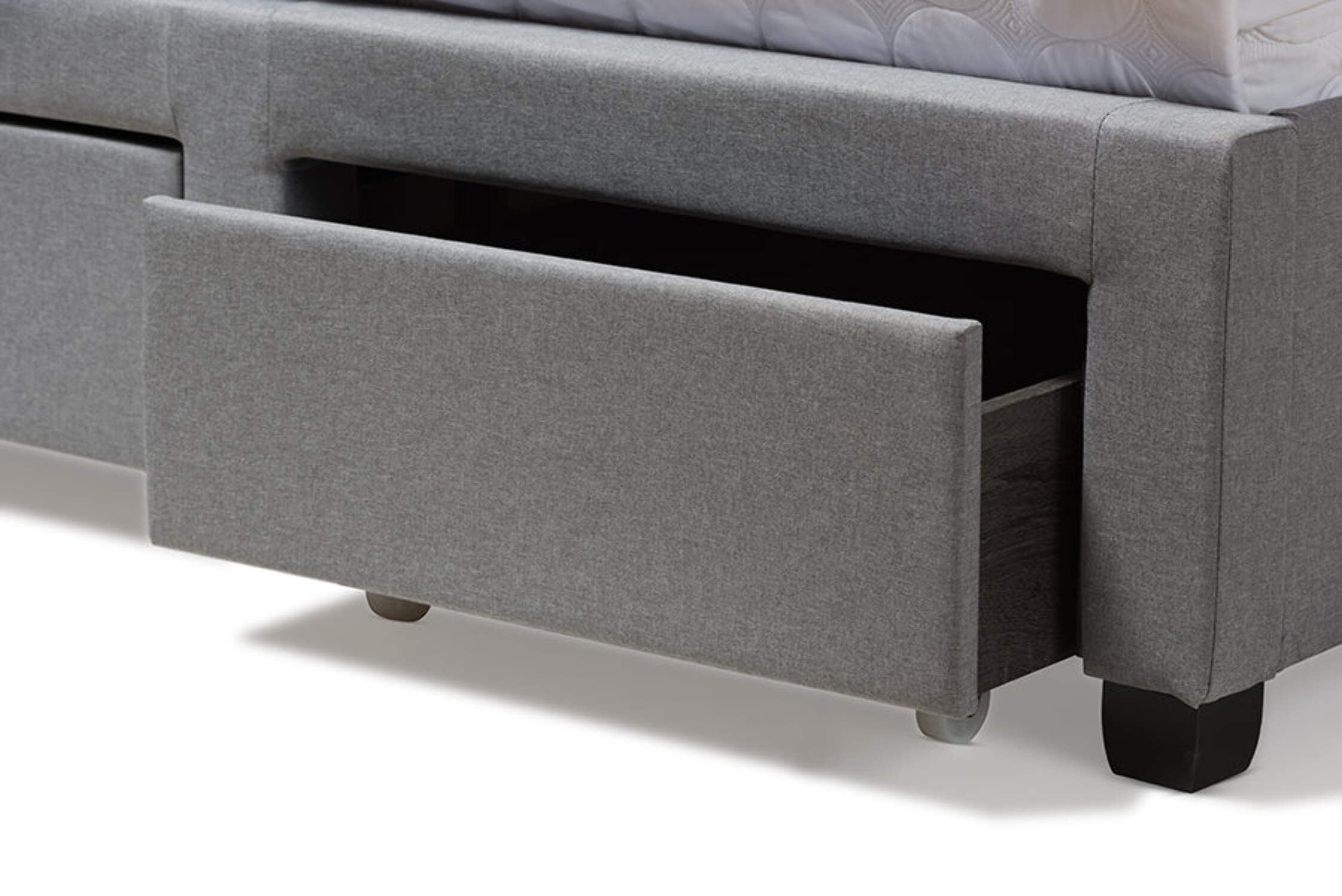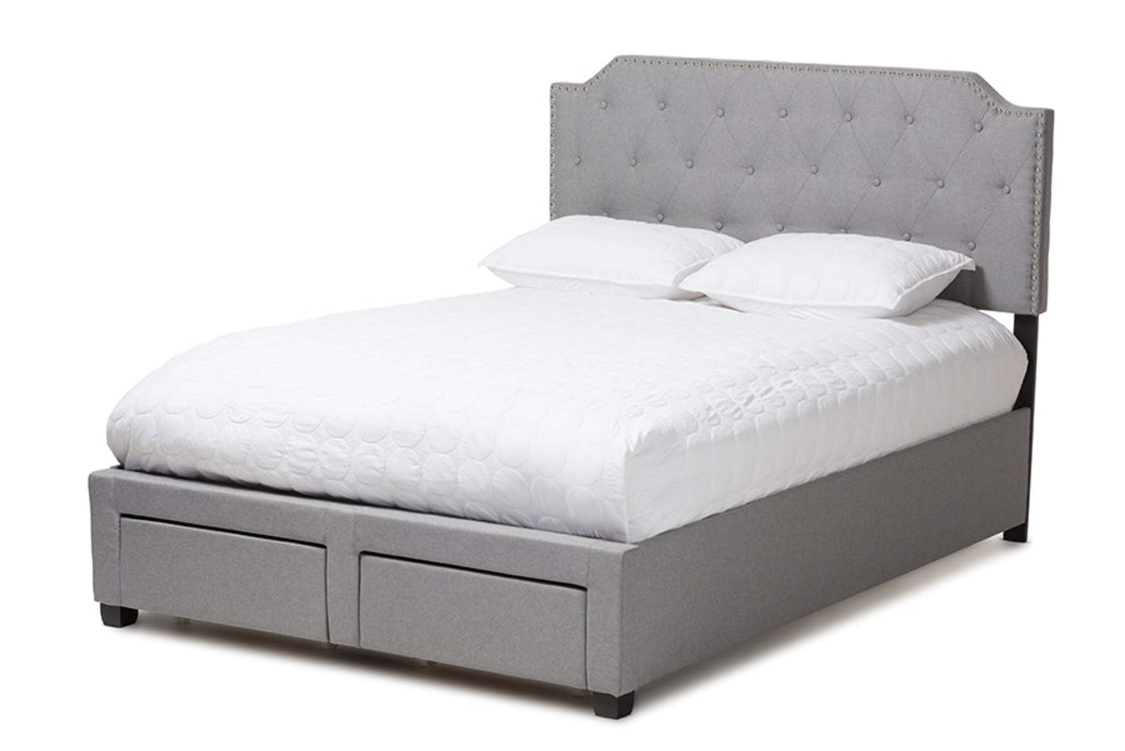 Come home to the stylish yet practical Aubrianne king size storage bed. This modern and contemporary-inspired bed is upholstered in a delightful gray fabric. The Aubrianne is detailed with button-tufting and a nail head trim on the headboard for a touch of glamour. Offering more than just luxe style, the bed also features two drawers at the foot of the bed for practical and discreet storage, perfect for extra linens, pillows, or even shoes. The inclusion of the drawers make the Aubrianne a perfect addition to your bedroom and guest rooms. This storage bed is designed for use with a mattress only. Available in king and queen sizes, this storage bed is made in Malaysia. Assembly required.