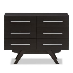 Baxton Studio Auburn Mid-Century Modern Espresso Brown Finished Wood 6-Drawer Dresser Sleek design with angular legs for sculptural design balancing, the Auburn 6-drawer dresser presents your everyday space with ample storage. Constructed of engineered wood and MDF boards for sturdiness, the dresser features six drawers, on pre-install drawer slides for your clothes and linens. Powder-coated handle offers a sleek and modern aesthetic in your space. Solid rubberwood legs provide strong structural supports. Walnut or espresso brown veneered finishing complements a range of interior palettes and styles, from retro and Scandinavian to coastal and urban styles. Made in Malaysia, the Auburn requires assembly.