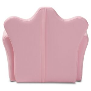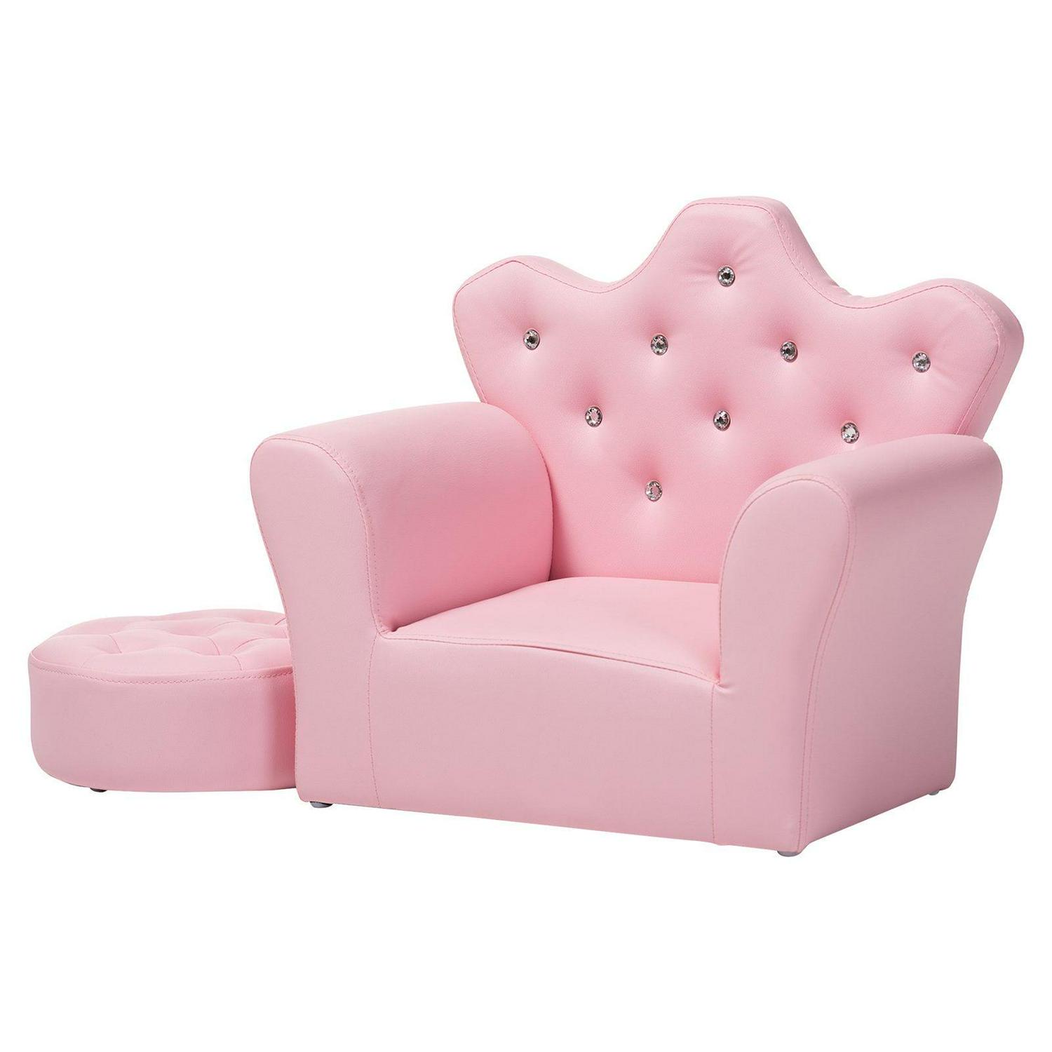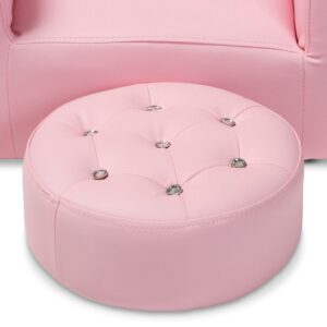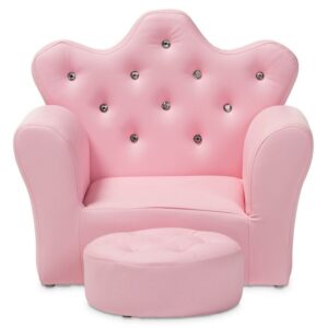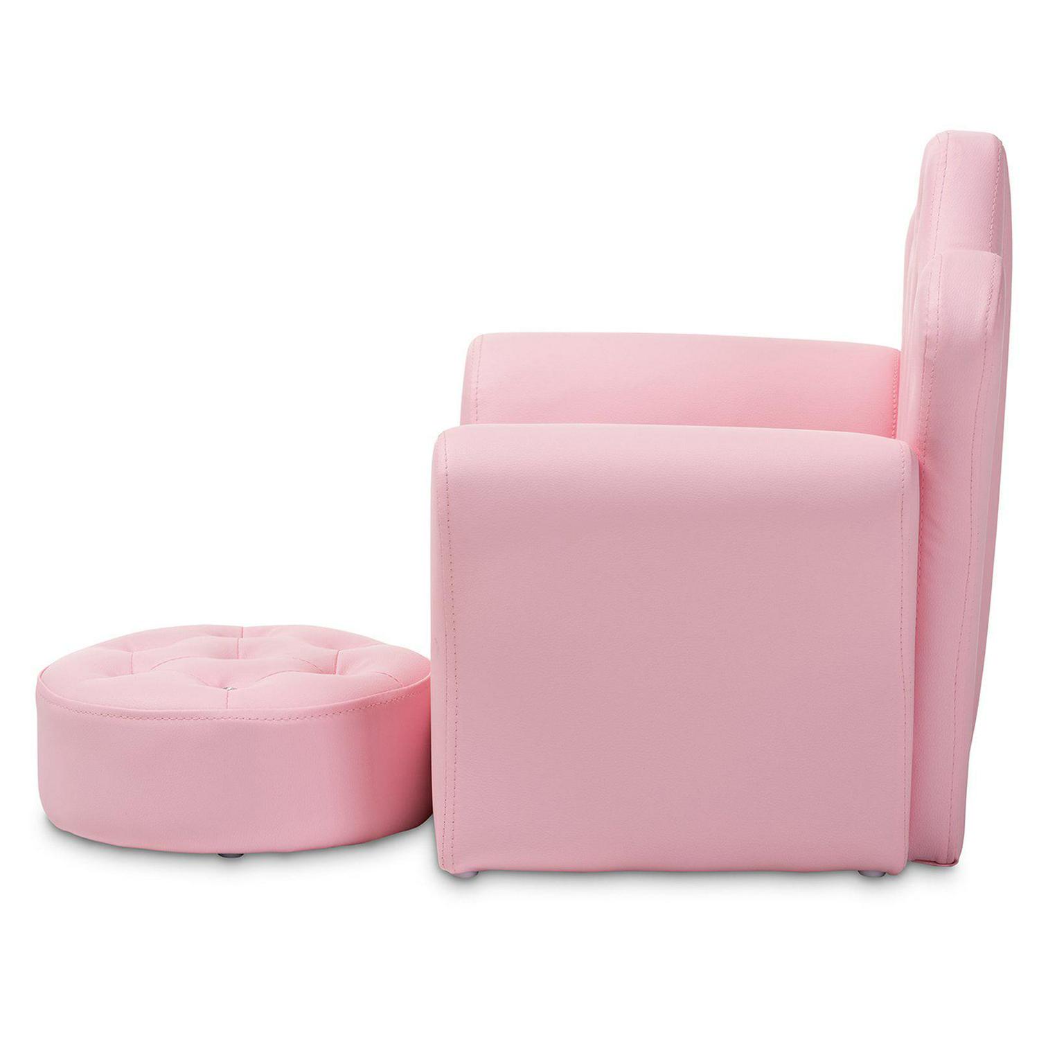 Baxton Studio Ava Modern and Contemporary Pink Faux Leather 2-Piece Kids Armchair and Footrest Set Combine comfort and style with the clever and stylish Ava armchair and footrest set. Constructed from rubberwood for durability, the Ava armchair is upholstered in pink faux leather for luxe appeal. High-density foam padding and a wide back ensure a high level of comfort during those Disney movie marathons. A matching footrest provides additional relaxation, allowing your little one to put their feet up as they lounge. Faux crystal accents give the pieces a touch of glamour. This set is sure to become your little one s favorite spot as they read books, watch TV, and relax with friends. The Ava armchair and footrest set is made in China and will arrive fully assembled.