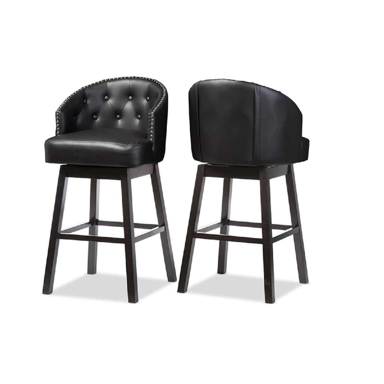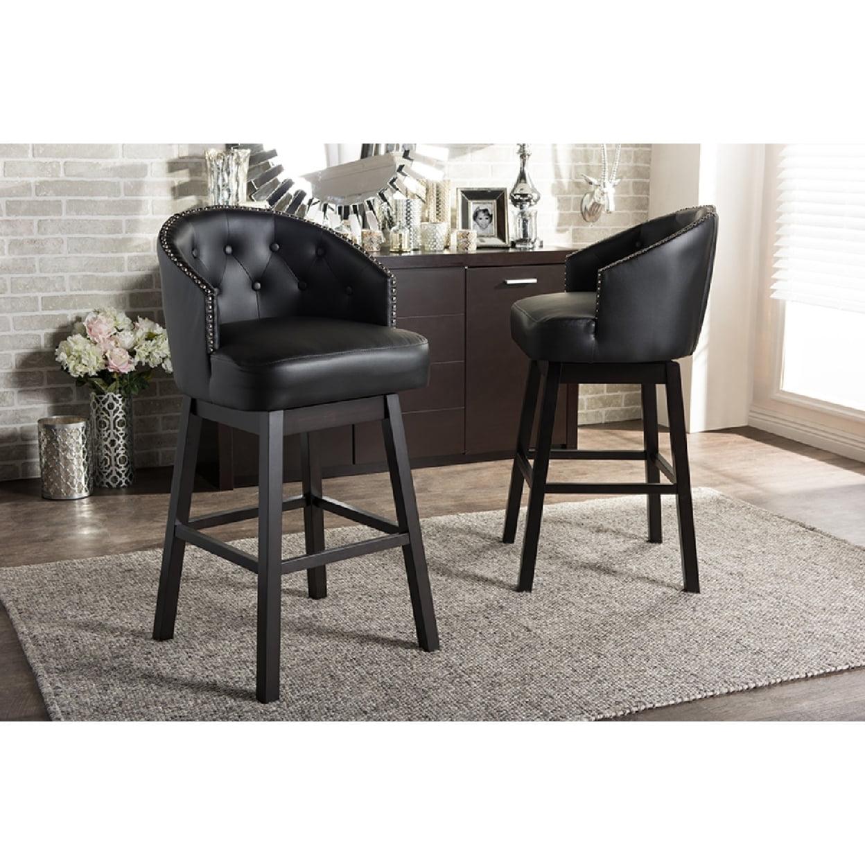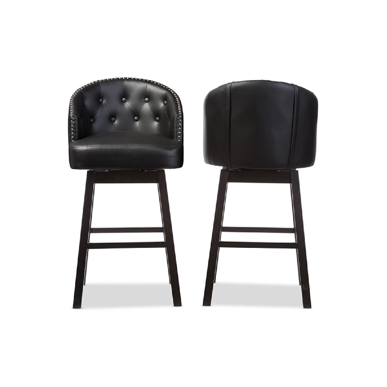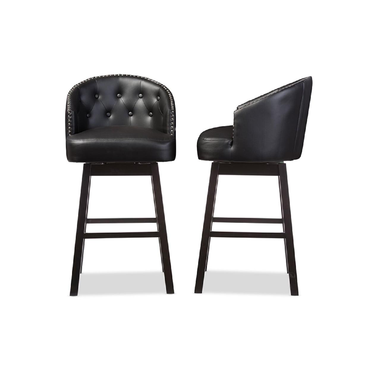 Baxton Studio Avril Modern and Contemporary Black Faux Leather Tufted Swivel Barstool with Nail heads Trim (Set of 2) Featuring elegant and sophisticated design, the Avril Swivel Barstool is another piece of our modern and contemporary collection. The barstool has a wide curved button-tufted seat back. Underneath the seat, it has a metal plate supporting the swivel mechanism. Four straight legs finished in dark espresso brown and built with solid rubberwood supporting the seat sturdily. Fully upholstered in faux leather, the wide seating area is padded throughout for a comfortable reign. There is visible showed stitchings on the back and seat to enhance the class and elegance of this barstool. The button-tufting and nail heads trim on the edges reconfirm the modern and contemporary design. This piece would fit extremely well in a hotel bar or restaurant bar environment with it swivel function. Made in Malaysia, the barstool is offered in set of two and it requires assembly.