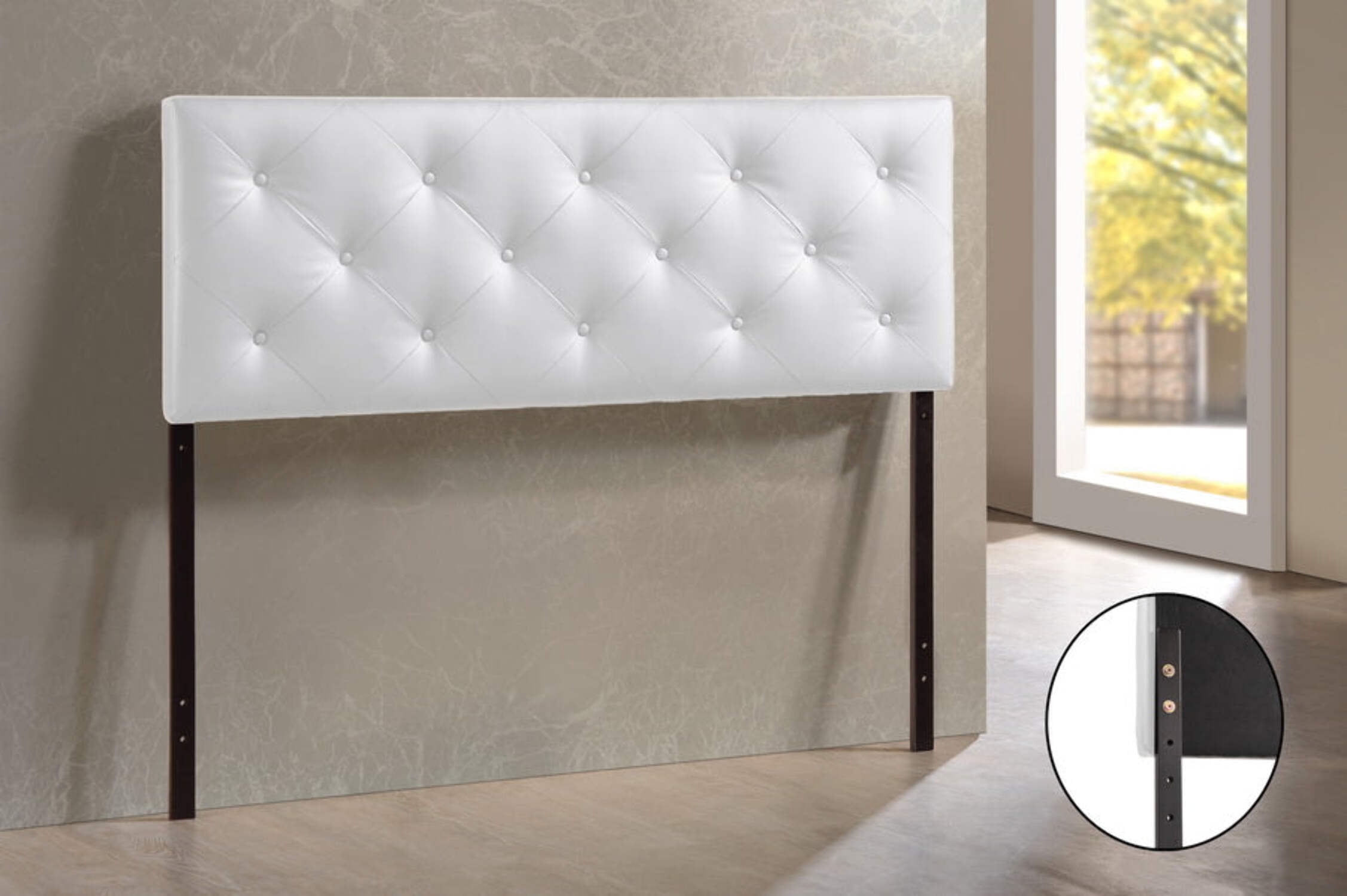 Bored with your bedroom? Need to perk up that platform bed? Add the look of leather. Our white faux leather Bedford Headboard boasts button-tufted distinction that contrasts sharply with just about any wall. Rubberwood frame with foam padding provides added comfort. Features: Full-sized headboard White faux leather Rubberwood frame with foam padding Button-tufted