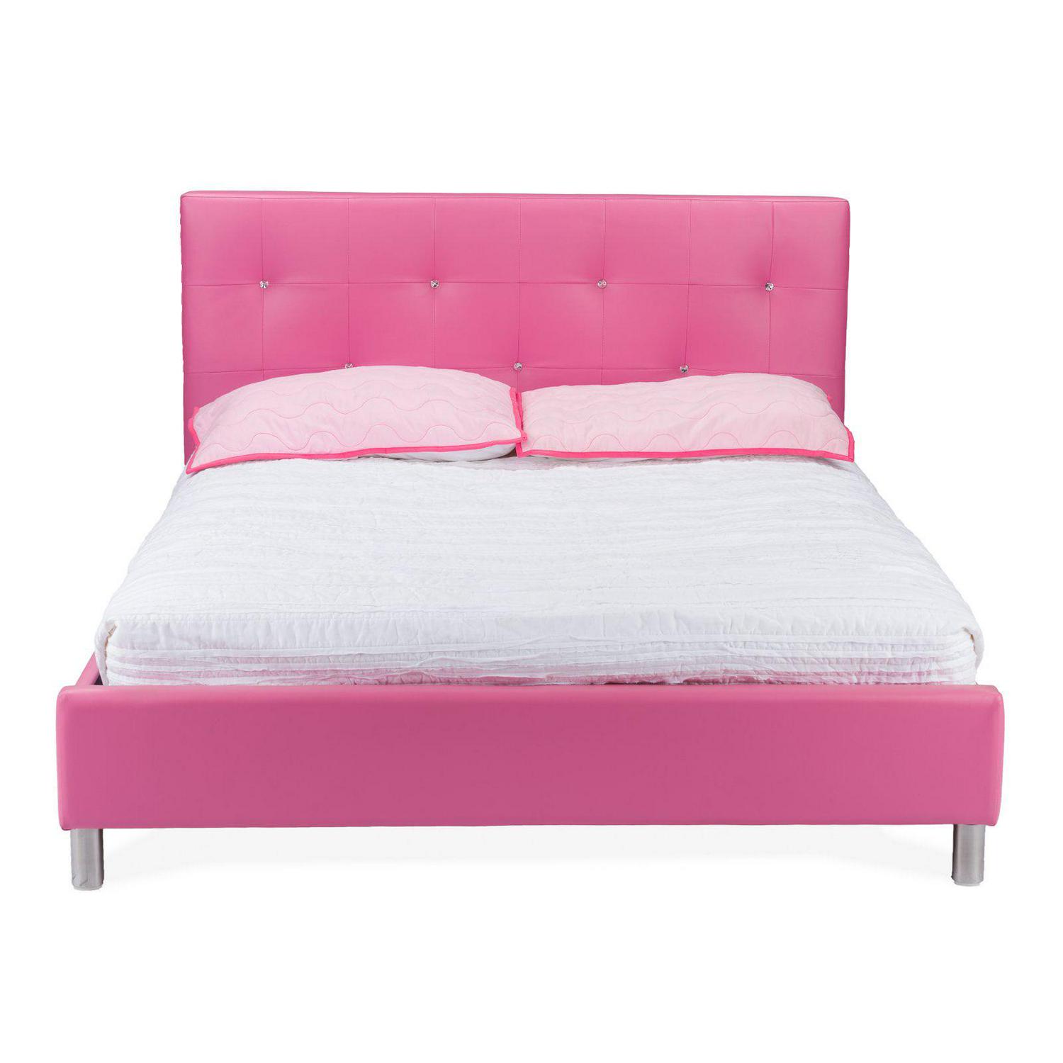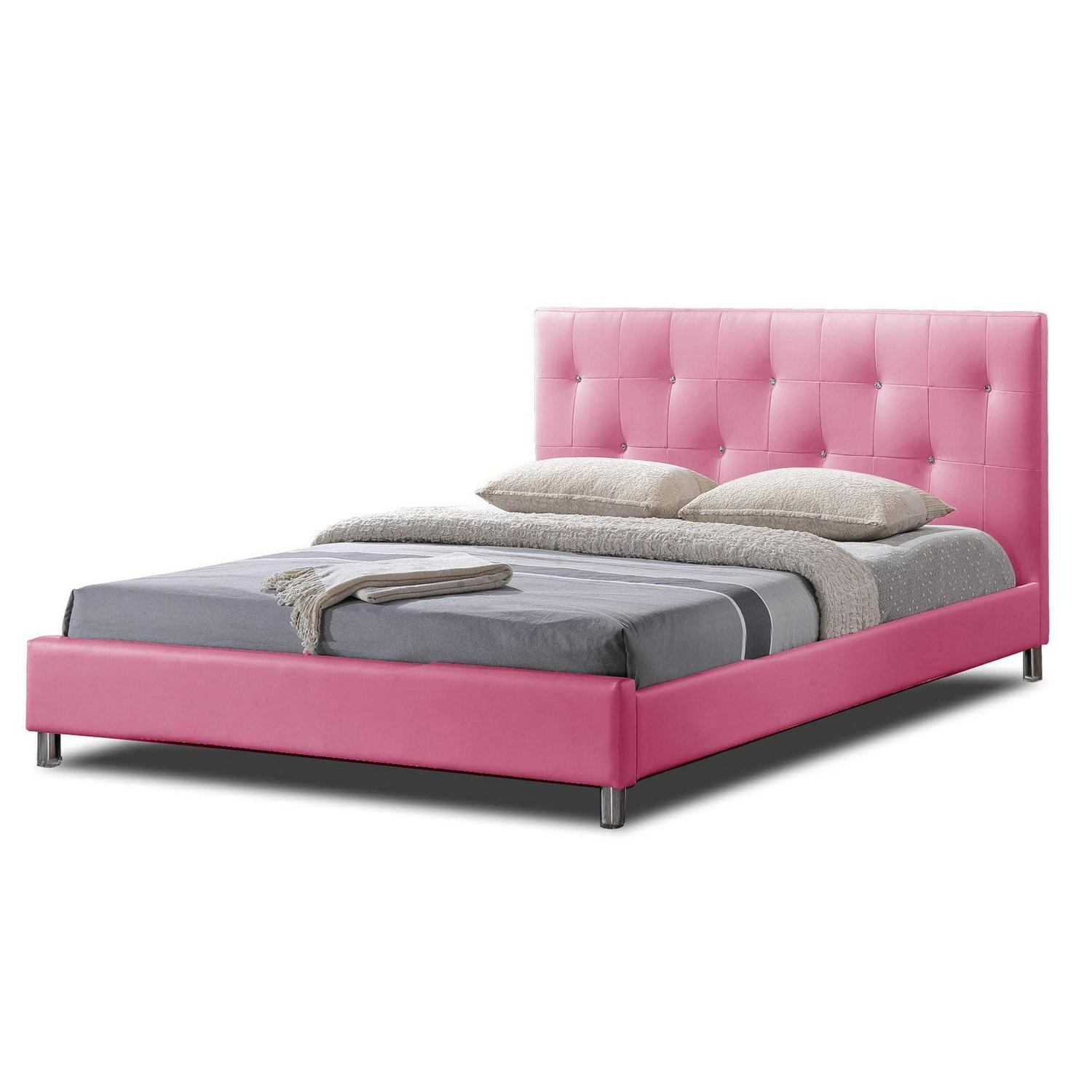 The sparkling gleam of the multi-faceted faux crystal buttons that regally stud the tufted headboard of our Barbara Modern Platform Bed thoroughly befits a stylish, trendy bedroom. Made with soft pink faux leather overlapping a foam-padded frame with hardwood, plywood, and MDF, this Malaysian-built creation sleeps like a dream. The full-sized platform bed, which requires only a mattress, comes with wooden slats that serve the same function as a box spring would. Silver metal legs finish off this spectacular piece of modern bedroom furniture. To clean, wipe with a damp cloth. Assembly is required.