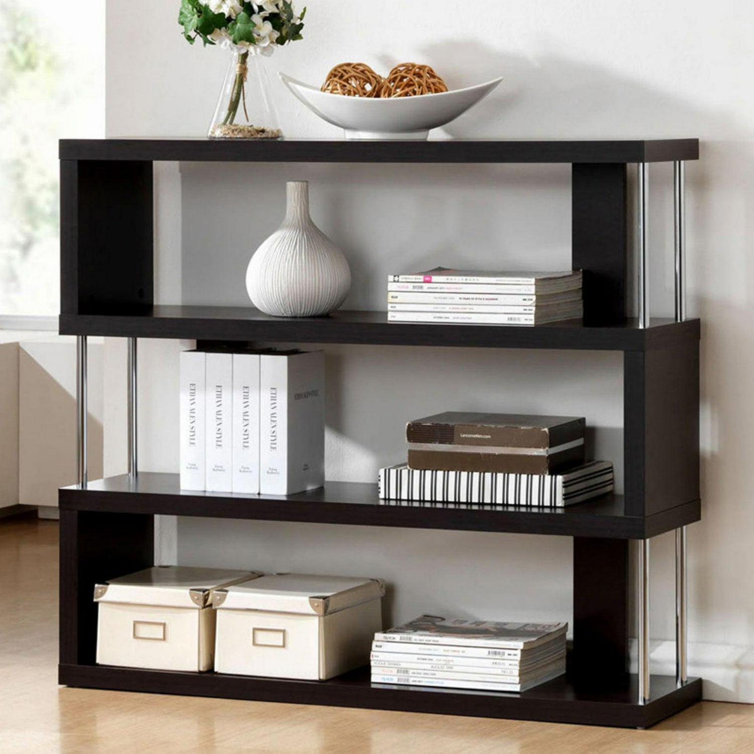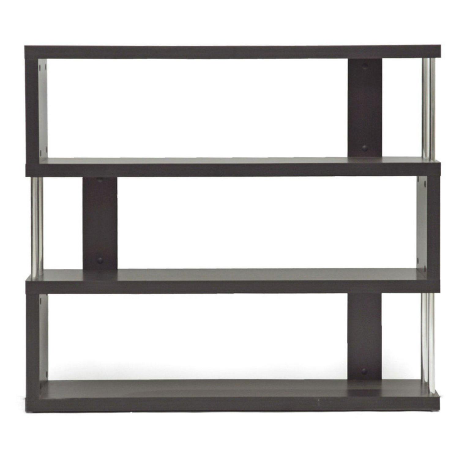 This artsy, modern bookcase gets you organized with style. Our Barnes Bookcase is made of dark brown faux wood grain paper veneer over and engineered wood frame and features chromed steel side supports. Not only does this modern display shelf house books, but it is also the perfect place to show off your prized vases, décor, and home accents. The Barnes Bookcase is Malaysian-made, requires assembly, and should be dry dusted. Separately offered is the Barnes Bookcase with six shelves. 38 inches high x 43 inches wide x 11 inches deep