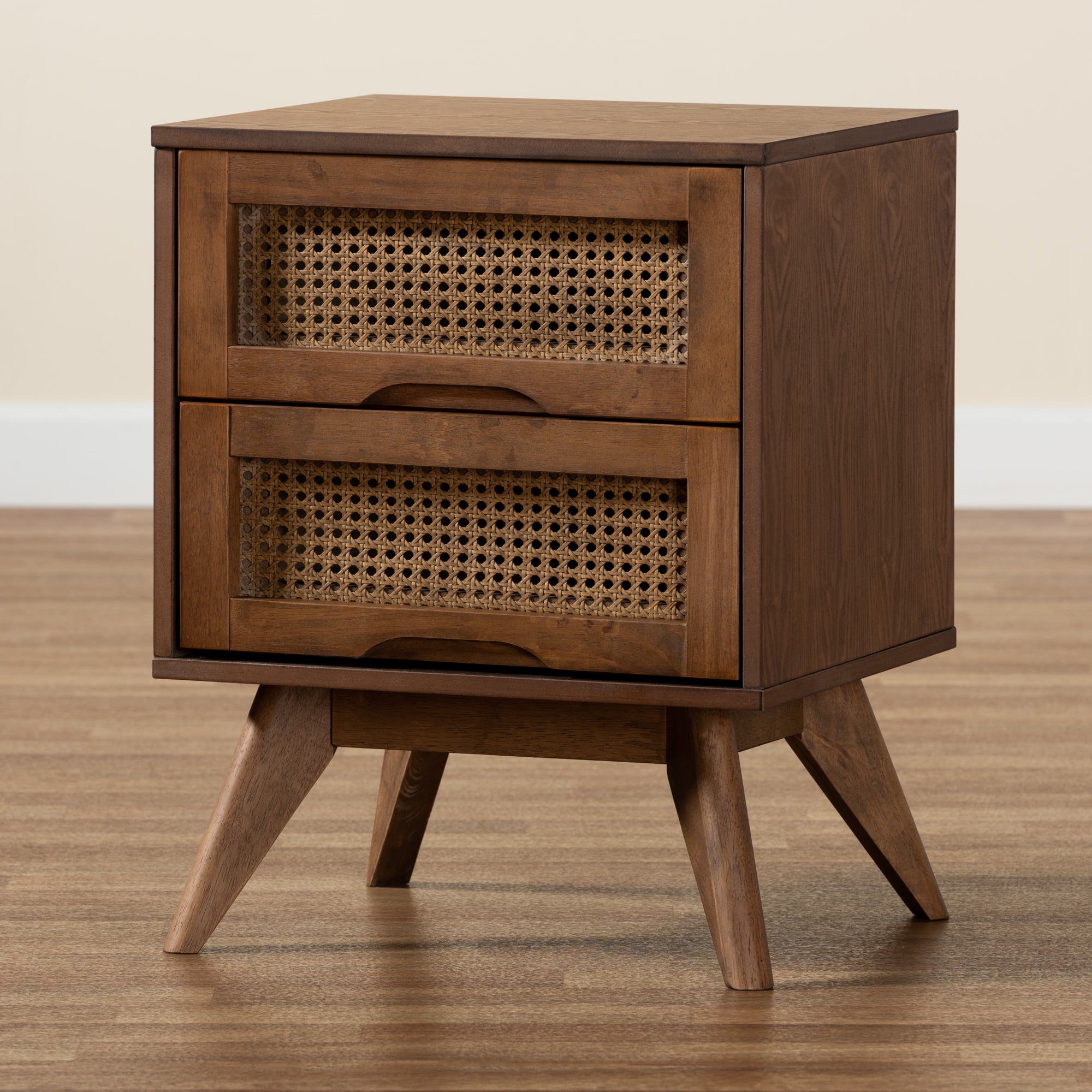 Baxton Studio Barrett Mid-Century Modern Walnut Brown Finished Wood and Synthetic Rattan 2-Drawer Nightstand