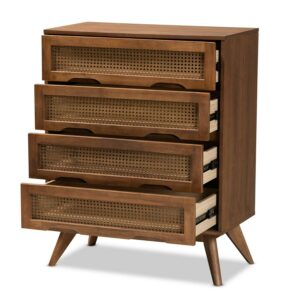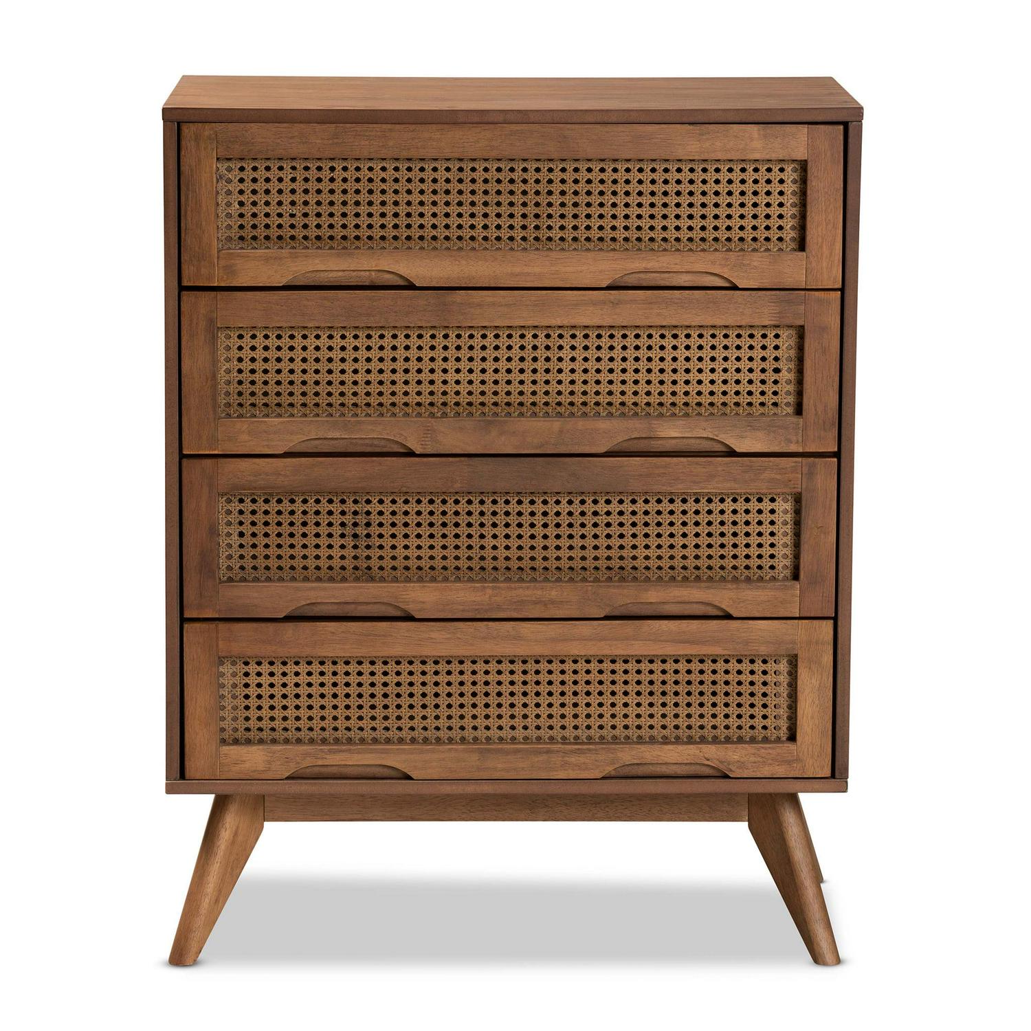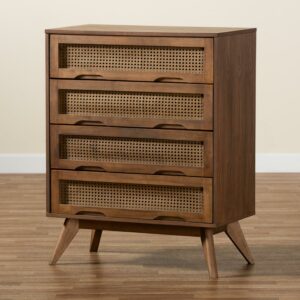 Baxton Studio Barrett Mid-Century Modern Walnut Brown Finished Wood and Synthetic Rattan 4-Drawer Chest