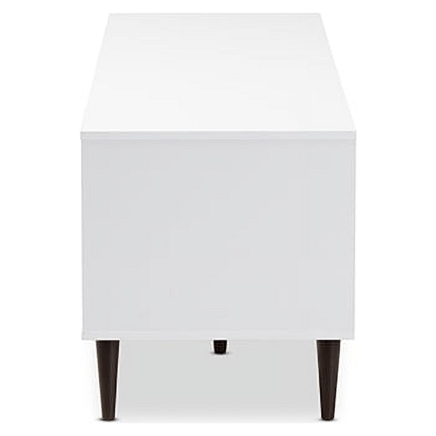Baxton Studio Bastien Mid-Century Modern White and Light Oak 6-Shelf TV Stand Make the focal point of your livingroom a stylish and organized one with the Bastien TV stand. The solid colors of the TV stand, coupled with the wood grain look of the doors and simple silhouette, are hallmarks of its mid-century modern-inspired design. The stands engineered wood frame is built to last. The Bastien features six convenient shelf spaces behind three light oak finished doors. The back panel of the television stand has circular cut-outs for wire management, should you use the shelves to store gaming consoles or media players. The knobs of the Bastien are delightful square knobs finished in a dark brown. The brown-finished legs of the TV stand are angled and tapered, further exemplifying its mid-century modern vibes. The Bastien makes it easy to keep your livingroom or rec room organized and tidy with its sleek look and storage options. Made in Malaysia, the TV stand requires assembly. Specifications: Mid-century modern TV stand Two-tone white and light oak finishing Six shelf spaces Three hinged doors with knobs Brown finished angled, tapered legs Assembly required Made in Malaysia