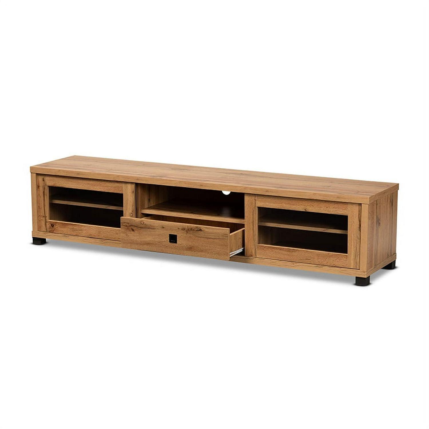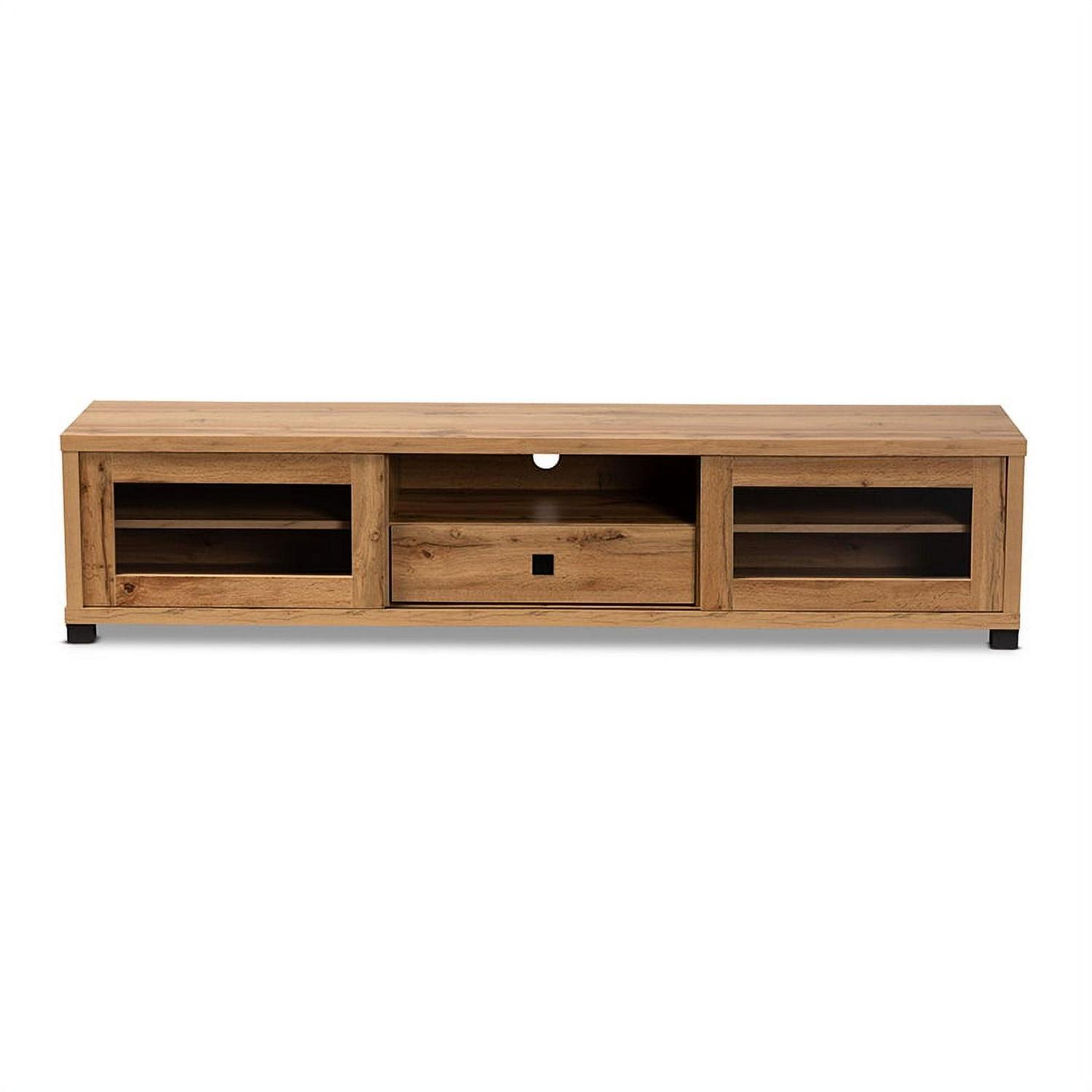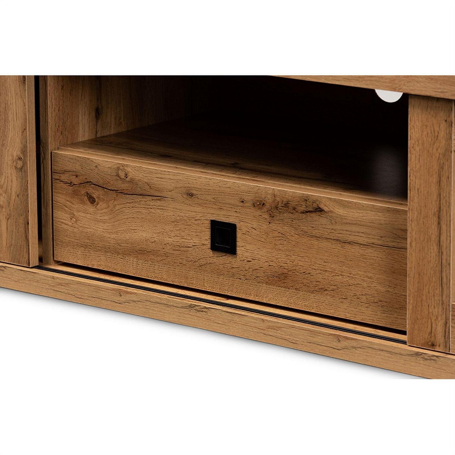 Baxton Studio Beasley Modern and Contemporary Oak Brown Finished Wood 1-Drawer TV Stand Meet the demands of your living room with the superb utility and sophisticated style of the Beasley TV stand. Made in Malaysia, this TV stand is crafted from oak brown finished wood that adds a natural touch to any interior space. The open shelf offers a convenient display for media devices, while one drawer and four additional shelves behind the doors provide secure storage options. Requiring assembly, the Beasley features a cord management hole on its back panel for quick and easy setup. Sliding glass doors allow for decorative customization, making the Beasley TV stand a versatile upgrade to any living room.