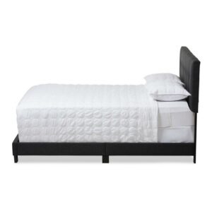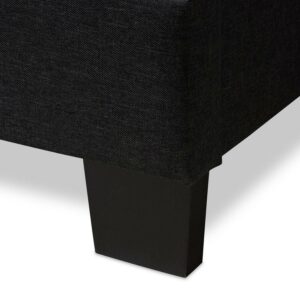 Dark charcoal upholstery gives this Baxton Studio Brookfield Low Profile Bed its contemporary-chic appeal. The upholstered, low profile footboard and rails plus solid wood legs in black complete the clean, modern profile of this bed. Choose from available size options.Bed Dimensions:Full: 78.94W x 58.66D x 47.05H in.Queen: 83.27W x 64.17D x 47.05H in.King: 83.27W x 80.31D x 47.05H in.