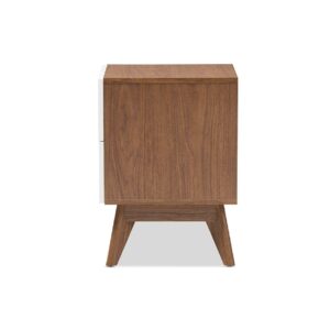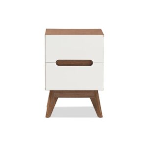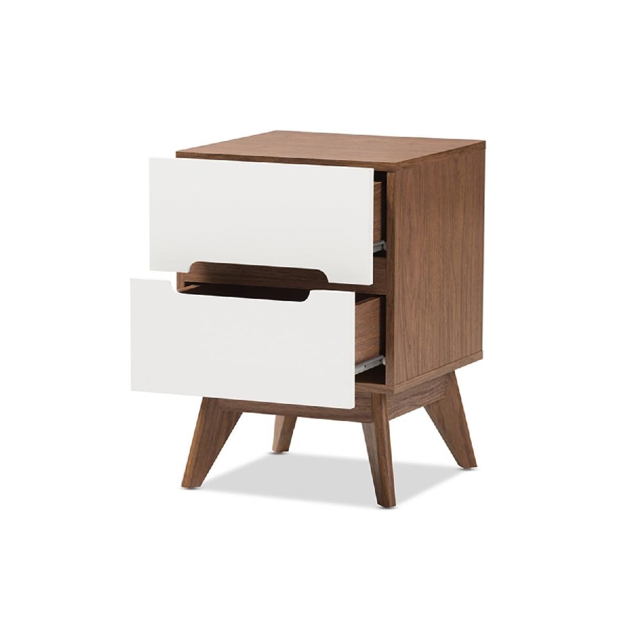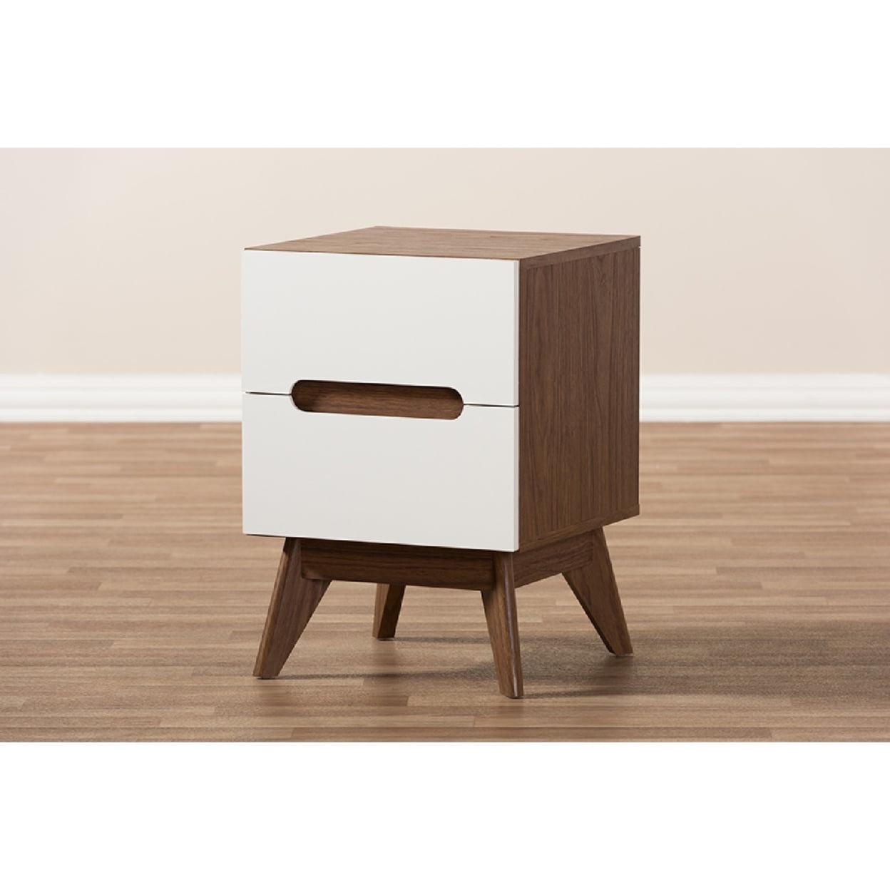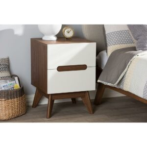Baxton Studio Calypso Mid-Century Modern White and Walnut Wood 3-Drawer Storage Nightstand Exude mid-century Scandinavian style in your home with Calypso two-tone 2-drawer nightstand. Showcasing a sleek and simple design with functionality in mind, the Calypso is constructed of engineered wood in walnut and white finishing for lasting good look. Featuring drawers with cut-out handles, contrasting with the walnut wood panel inlaid, the Calyso exudes laid-back luxury and casts a Scandinavian aesthetic over your space. Angular legs complete mid-century look. Two pull-out drawers open to reveal ample storage for small items and bedroom accessories for practicality. Made in Malaysia, the Calypso 2-drawer storage bedside table requires assembly.