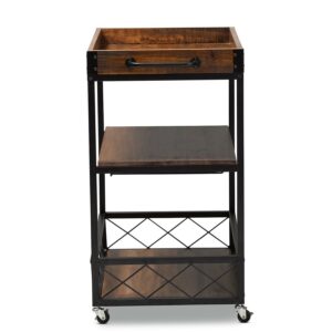 Vintage Rustic Industrial Oak Brown and Black Finished Mobile Metal Bar Cart