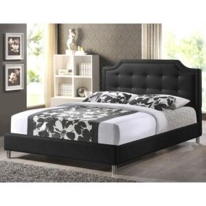 Clean, crisp, and contemporary is the Carlotta Designer Bed frame. Soft black faux leather outfits a scallop-cornered headboard with matching upholstered side rails and low footboard, making this a sleek style for sleeping. Malaysian-made, the king sized Carlotta Contemporary Bed features an inner frame of hardwood and plywood, which are padded with foam before being upholstered. Faux crystals stud the headboard, creating a trendy button tufted look. This is a platform bed: wooden slats (included) serve as a box spring so only a mattress and bed linens are needed (mattress and linens are not included). Tying everything together are silver metal legs with non-marking feet. Easily maintain the Carlotta Bed by wiping clean with a damp cloth as needed. This style requires assembly and is offered in black (full, queen, and king size) or white (full, queen, and king size); each sold separately.