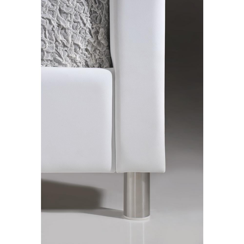 Contemporary full size platform bed (slats included) White faux leather Hardwood and plywood inner frame Silver metal legs with non-marking feet Faux crystal button tufted headboard Assembly required