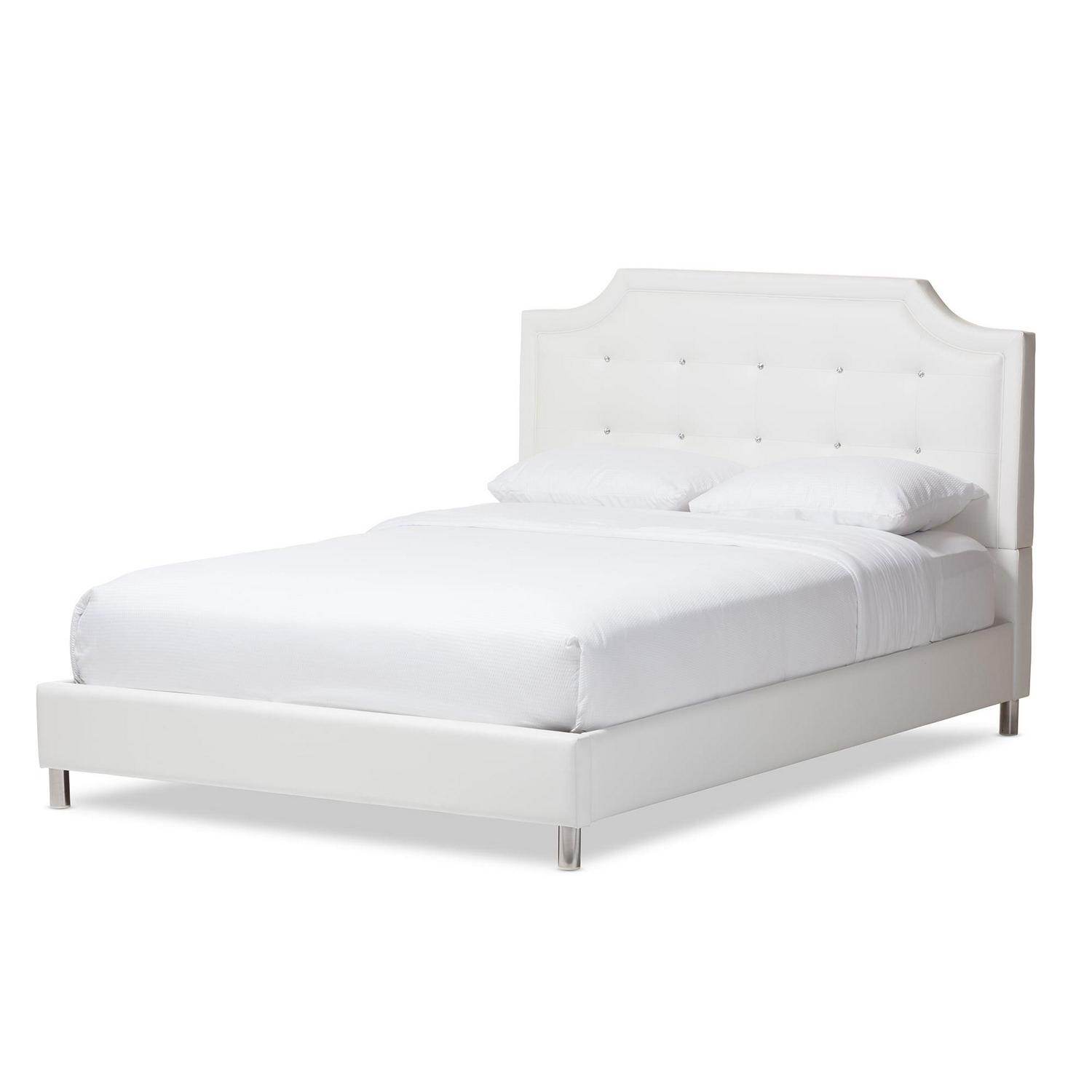 Clean, crisp, and contemporary is the Carlotta Designer Bed frame. Soft white faux leather outfits a scallop-cornered headboard with matching upholstered side rails and low footboard, making this a sleek style for sleeping. Malaysian-made, the queen-sized Carlotta Contemporary Bed features an inner frame of hardwood and plywood, which are padded with foam before being upholstered. Faux crystals stud the headboard, creating a trendy button-tufted look. This is a platform bed: Wooden slats (included) serve as a box spring so only a mattress and bed linens are needed (mattress and linens are not included). Tying everything together are silver metal legs with non-marking feet. Easily maintain the Carlotta Bed by wiping clean with a damp cloth as needed. This style requires assembly and is offered in black (full, queen, and king size) or white (full, queen, and king size); each sold separately.