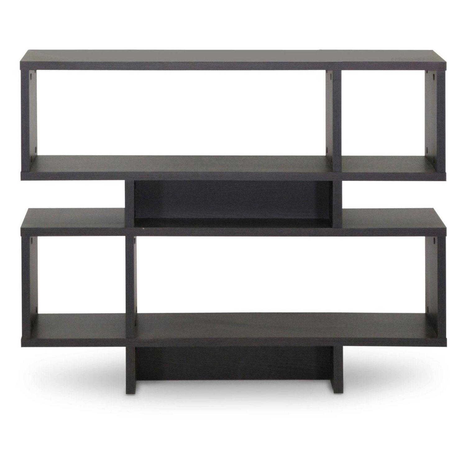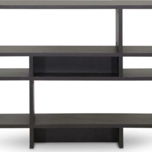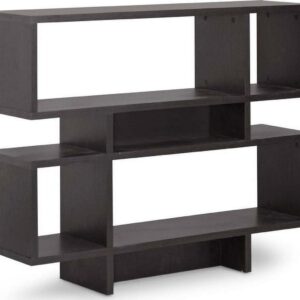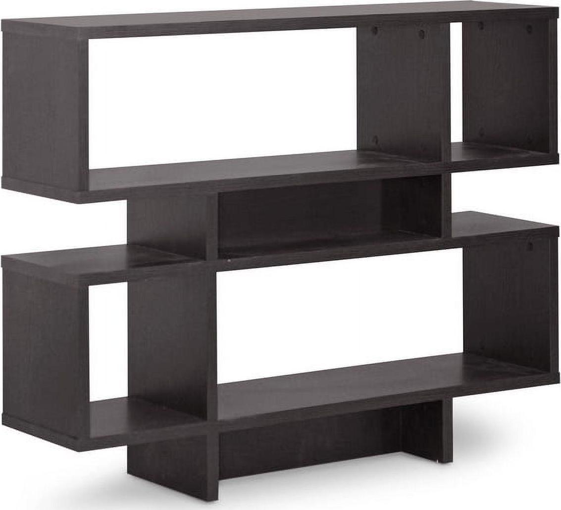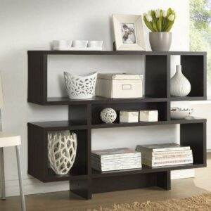 Inject a boost of dazzling contemporary interior fashion into your living space: our Cassidy Designer Bookshelf is a sculptural, eye-catching piece sourced from Malaysian craftsmen. Made with smooth dark brown(Espresso) faux wood grain paper veneer, the Cassidy Display Shelf features an engineered wood frame built with four levels, three of which can be used for display of your decor collection. Dusting with a dry cloth is recommended for cleaning of this unit. A 6-level and 8-level option of the Cassidy Shelf are also available (each sold separately). Assembly is required.44″W x 11.375″D x 35.25″H , shelf(bigger): 31.25″W x 11.375″D x 10.68″H, shelf (smaller): 9.875″W x 11.375″D x 10.68″H