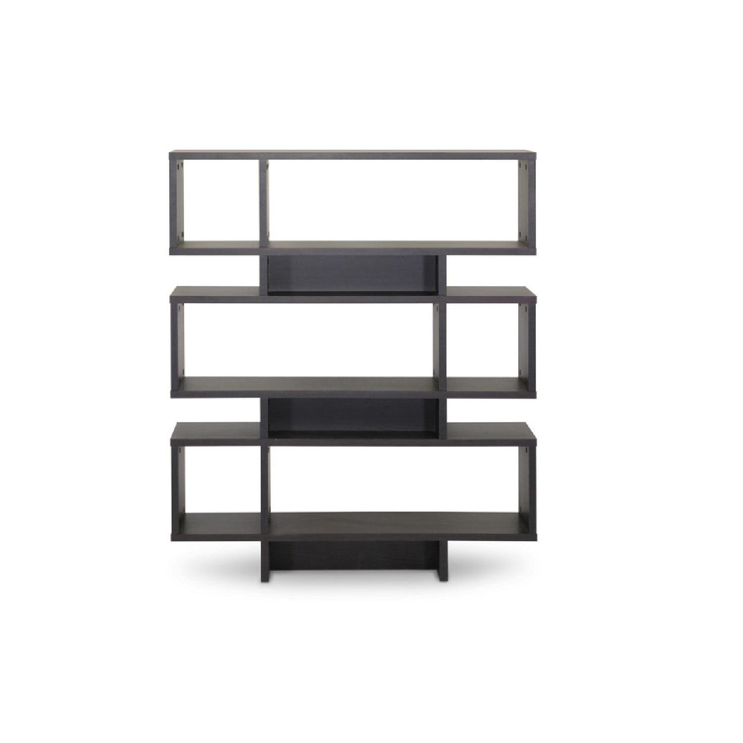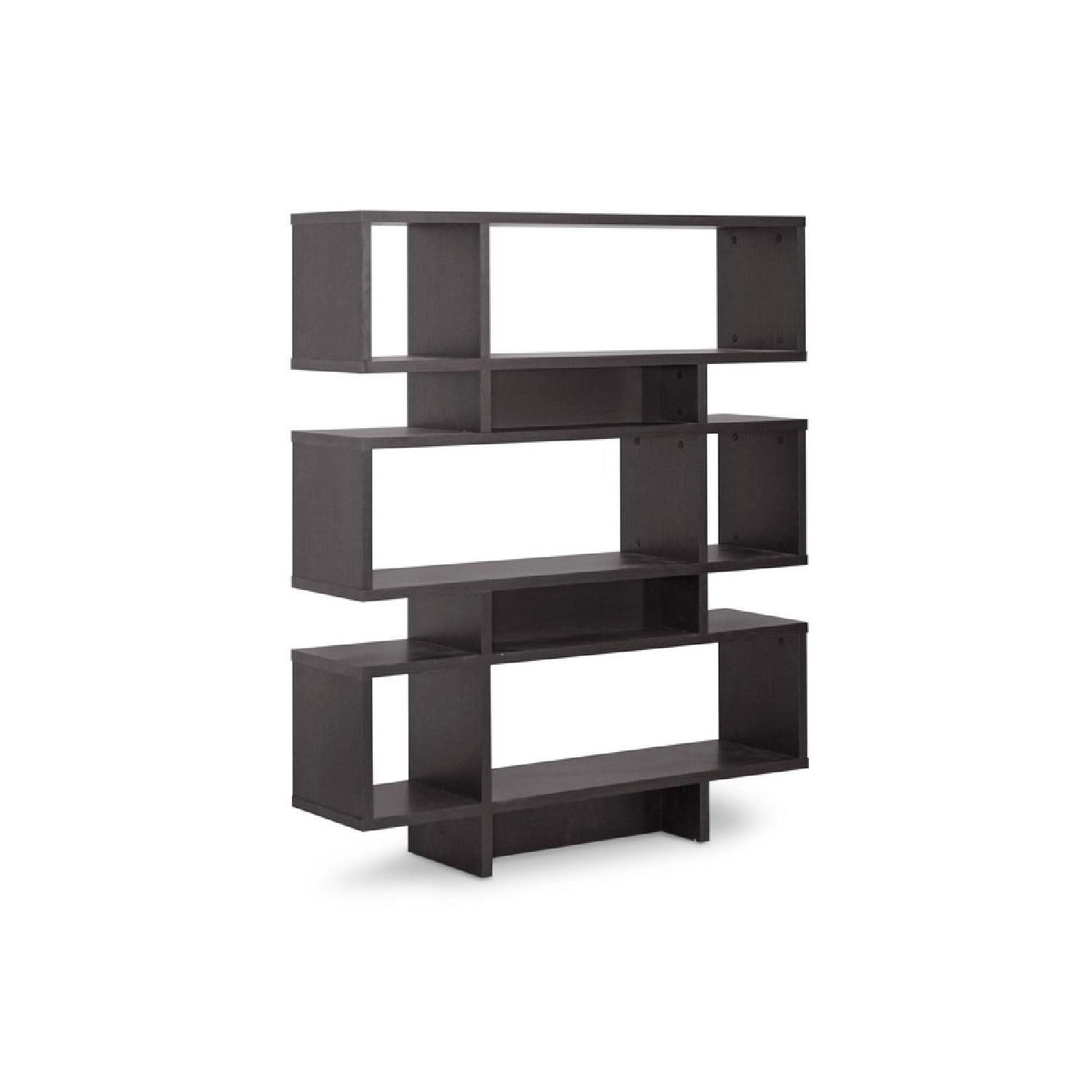 Baxton Studio Cassidy 6-Level Dark Brown Modern Bookshelf Inject a boost of dazzling contemporary interior fashion into your living space: our Cassidy Designer Bookshelf is a sculptural, eye-catching piece sourced from Malaysian craftsmen. Made with smooth dark brown faux(Espresso) wood grain paper veneer, the Cassidy Display Shelf features an engineered wood frame built with six levels, five of which can be used for display of your decor collection. Dusting with a dry cloth is recommended for cleaning of this unit. A 4-level and 8-level option of the Cassidy Shelf are also available (each sold separately). Assembly is required. 44″W x 11.375″D x 52.6″H, shelf(bigger): 31.25″W x 11.375″D x 10.68″H, shelf (smaller): 9.875″W x 11.375″D x 10.68″H