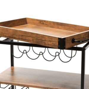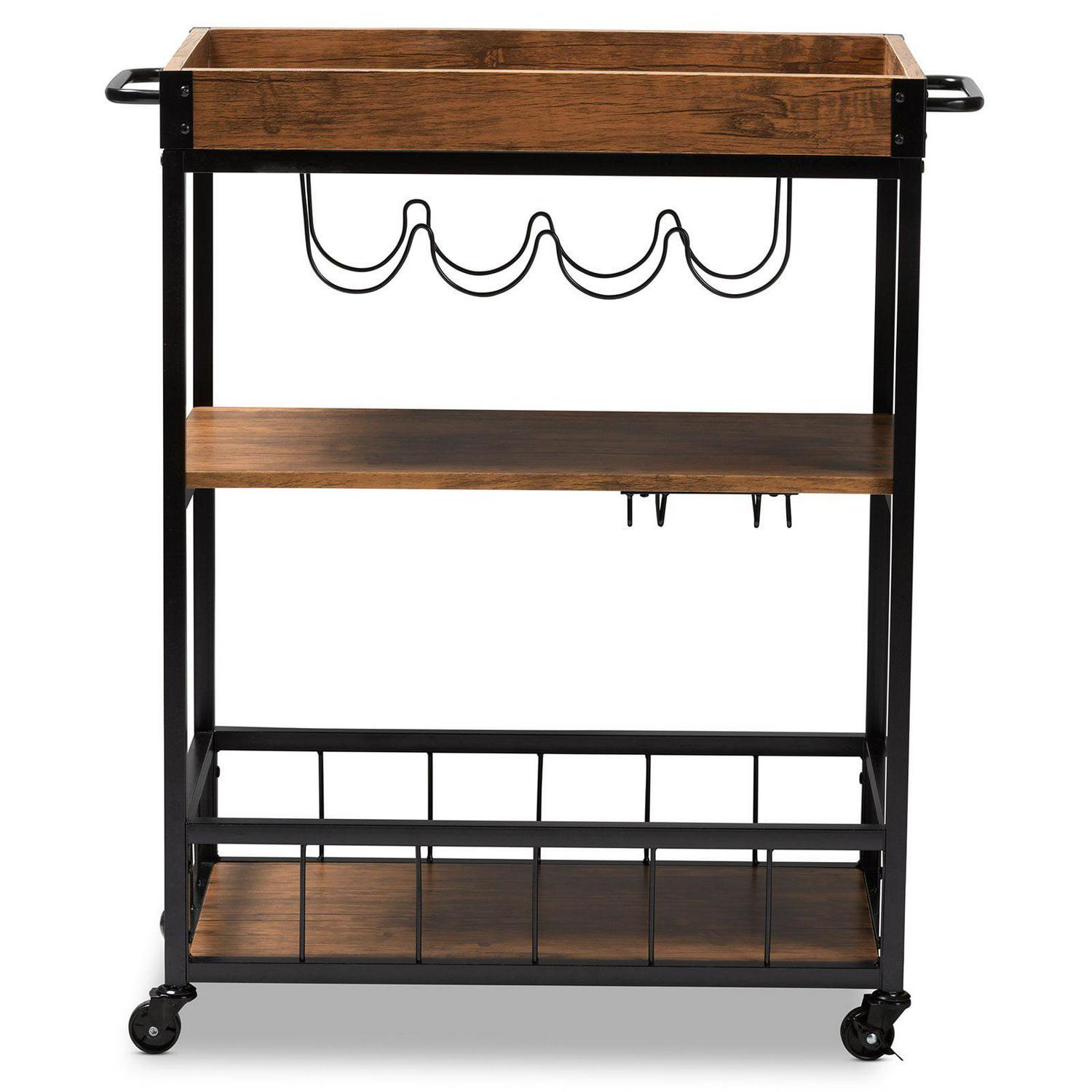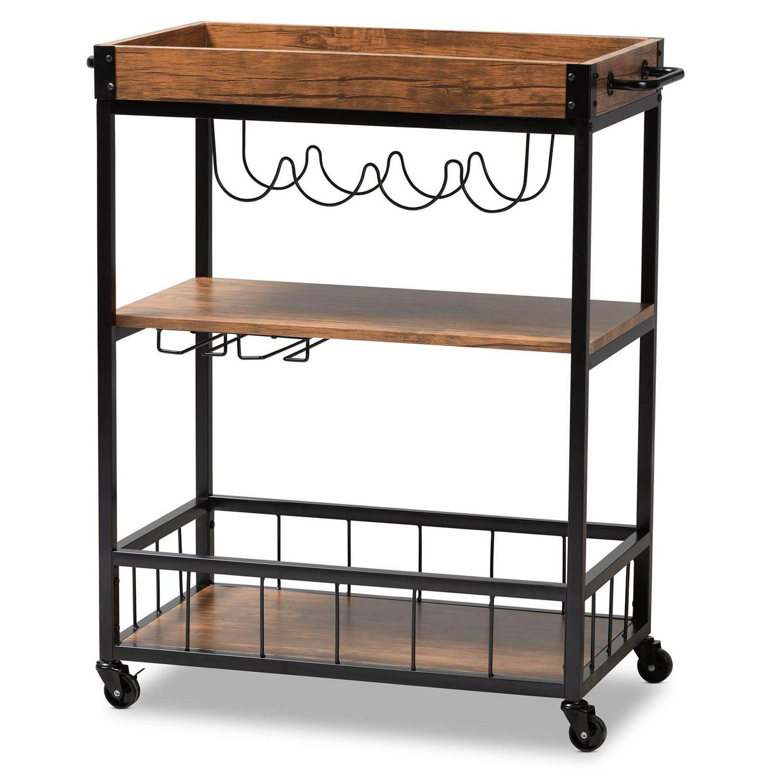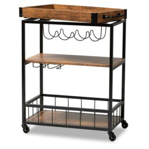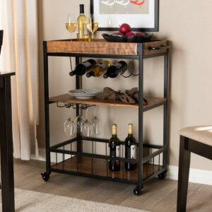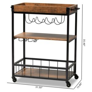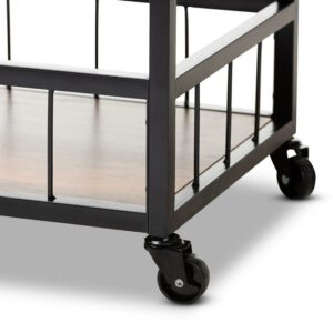 Baxton Studio Cerne Vintage Rustic Industrial Oak Brown and Black Finished Mobile Metal Bar Cart with Wine Bottle Rack
