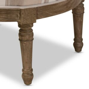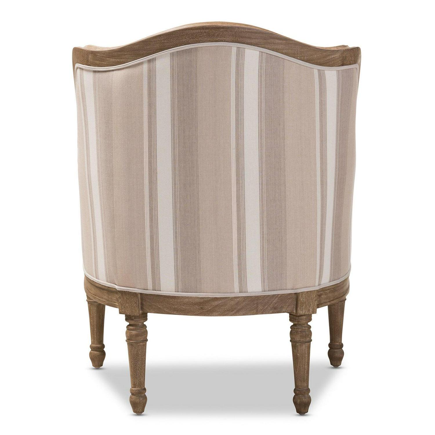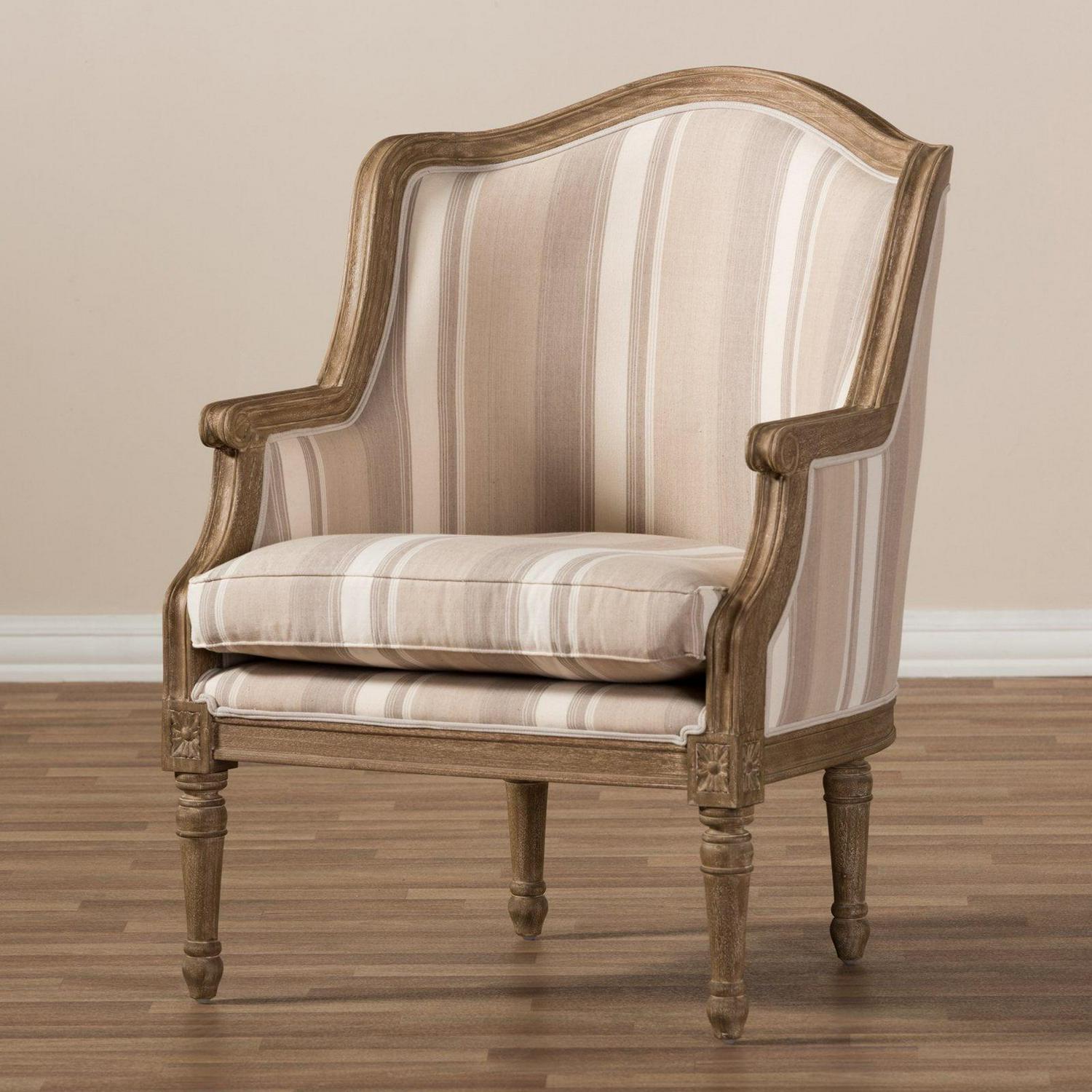 Classic contouring, contrasting leg designs and the comfort of cotton combine to create our Charlemagne Traditional French Accent Chair. Cedar wood frame and distressed brown oak wood finish (with white streaking) celebrate this timeless design. The tan-and-brown-striped beige cotton base upholstery makes a bit bolder statement than the Charlemagne s mono-toned versions. However, the color scheme still is surprisingly versatile for accent placement or room positioning. There s really no comparison to this attention to detail in the discount furniture arena.