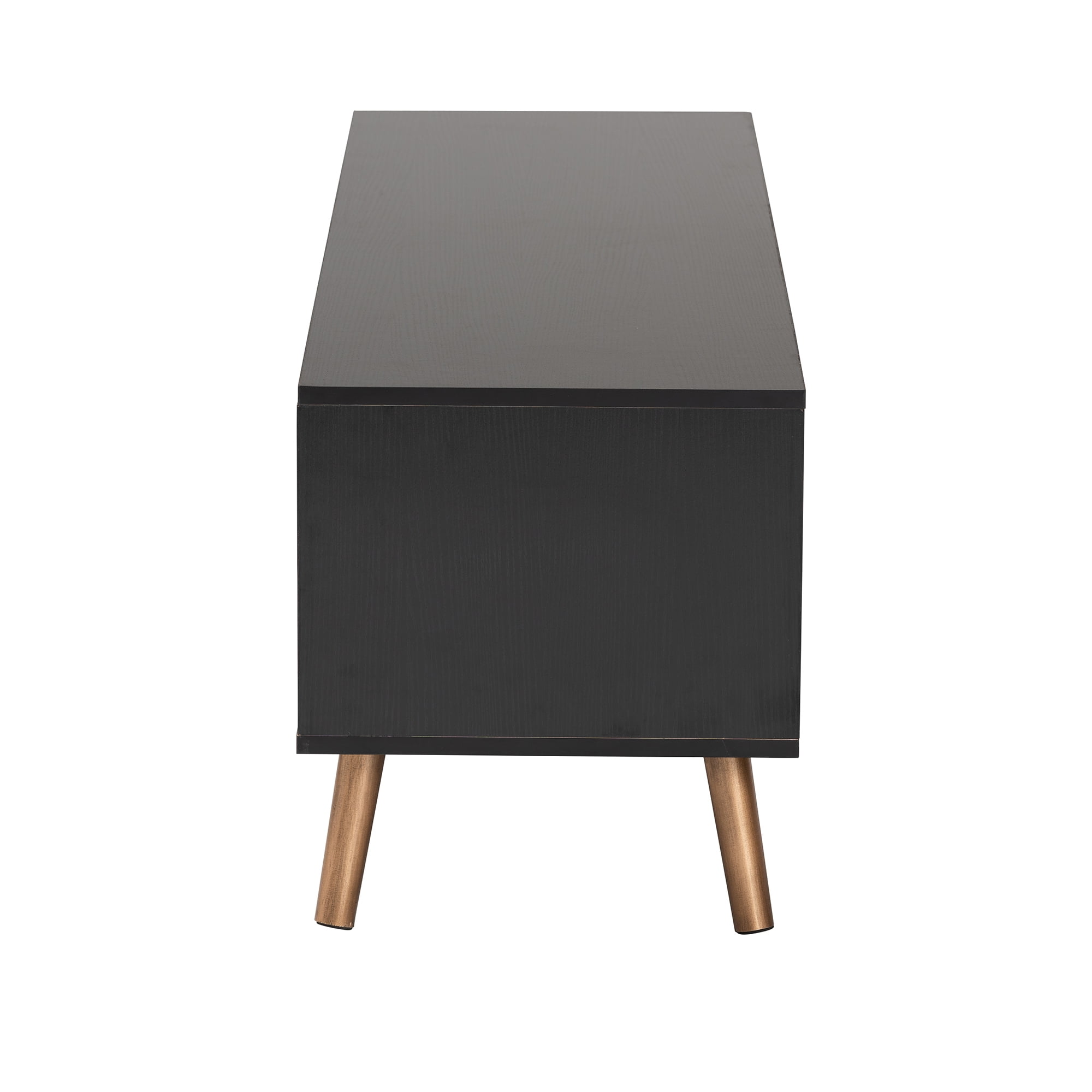 • Modern and contemporary TV stand • Constructed from Engineered Wood • Two (2) open shelves and two (2) enclosed shelves behind the doors • Supports televisions measuring up to 70″ (measured diagonally) • Cord management hole on back panel • Angled legs • Cut-out door handles • Product Weight: 50 Pound • Package Weight: 54.5 Pound • Overall Dimensions: 55.10″ W x 15.70″ D x 17.70″ H; Drawer: 26.60″ W x 15.00″ D x 4.90″ H; Clearance: 6.30″ H; • Product Color: Dark Brown/Natural Brown/Gold • Product Composition: Particle Board/Wood