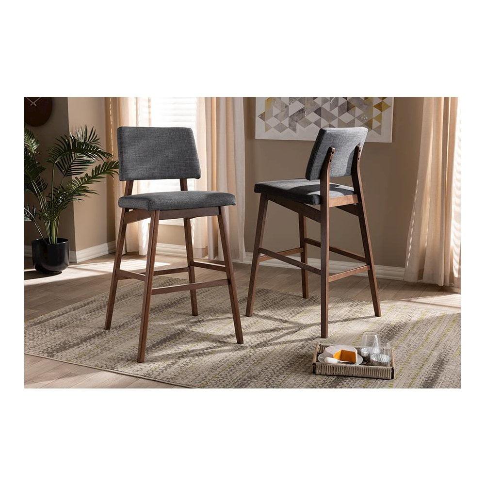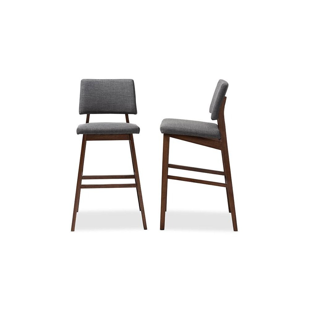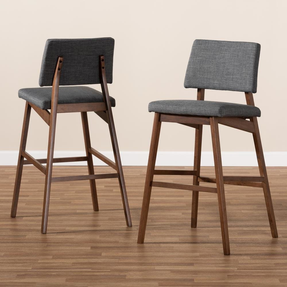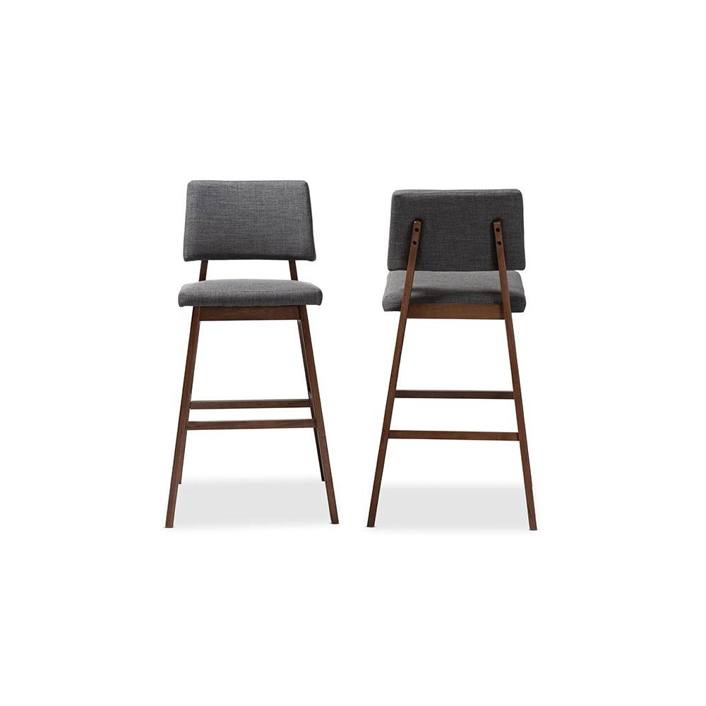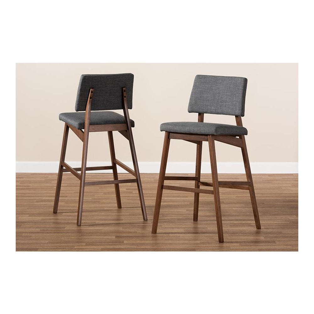 Baxton Studio Colton Mid-Century Modern Dark Gray Fabric Upholstered and Walnut-Finished Wood Bar Stool Set of 2