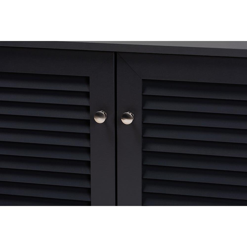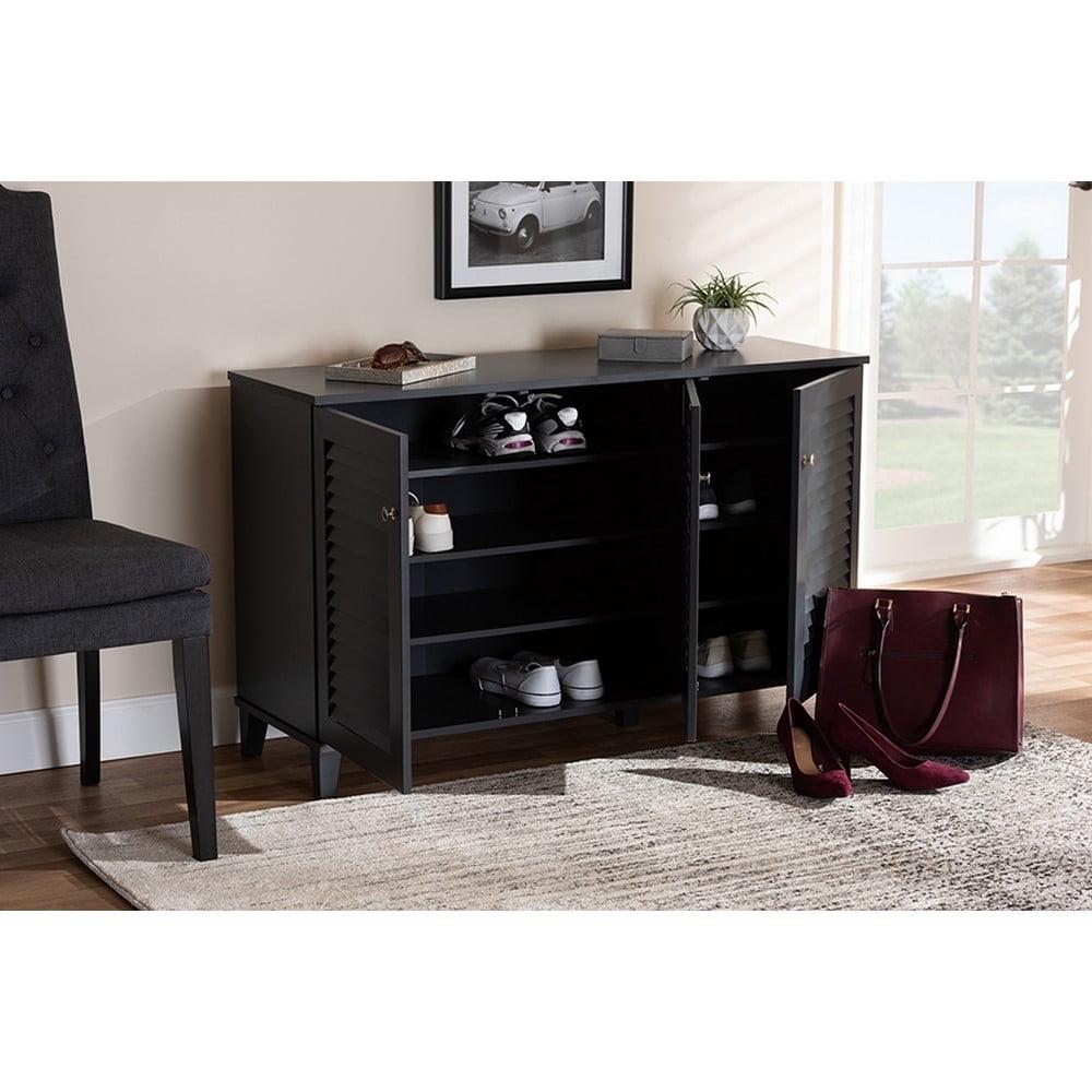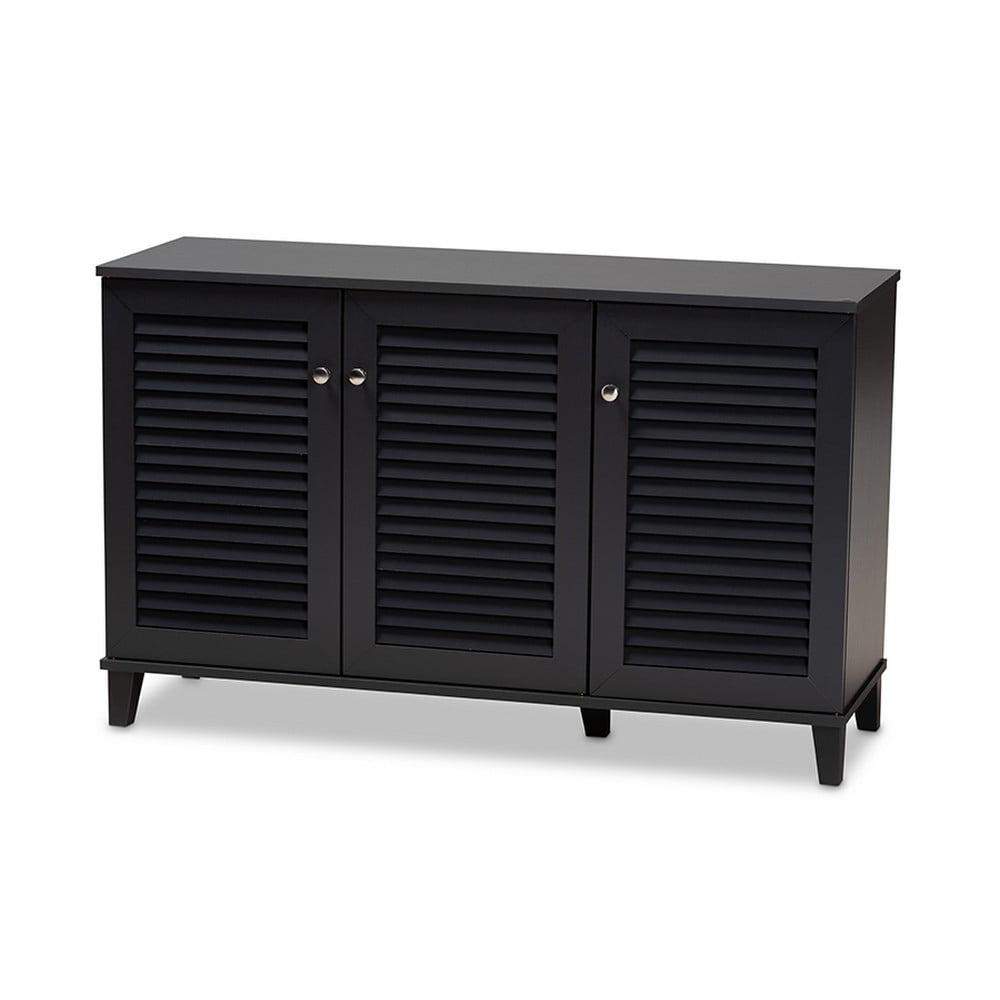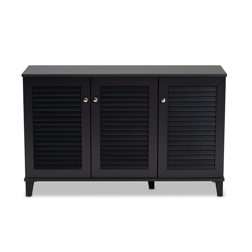 Baxton Studio Coolidge Modern and Contemporary Dark Grey Finished 8-Shelf Wood Shoe Storage Cabinet Store your shoes on the sly with the Coolidge shoe cabinet. Three slatted doors, fitted with round knobs, conceal eight shelves with storage space for up to 16 pairs of shoes. Tapered legs add refined style and provide elevation to deter dust buildup. Constructed from engineered wood, the Coolidge showcases a sleek dark grey finish that complements any color scheme. The Coolidge shoe cabinet is made in Malaysia and requires assembly.