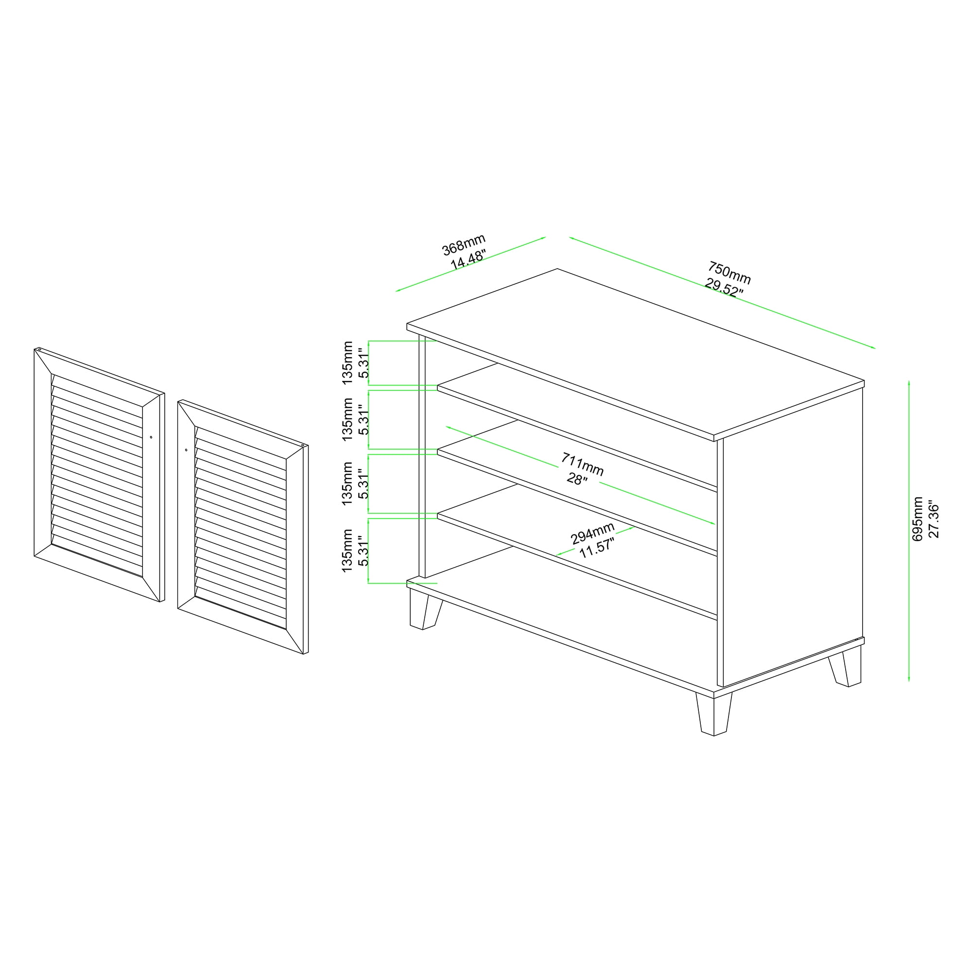 Round doorknobs Constructed from engineered wood Slatted wood doors Four (4) shelves provide space for 12 pairs of shoes, measuring below 12.75″ in depth Assembly required Product Weight: 44.1 Pound Package Weight: 48.5 Pound Overall Dimensions: 27.40″ High x 29.50″ Wide x 14.50″ Deep; Shelf Dimensions: 28.00″ Wide x 11.60″ Deep x 5.30″ High; Legs: 3.50″ High Product Color: Oak Brown / Dark Brown Product Composition: MDF / Solid Wood