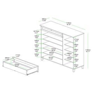 – Overall Dimensions: 45.10″ High x 45.20″ Wide x 14.50″ Deep; Drawer Dimensions: 26.40″ Wide x 11.20″ Deep x 4.40″ High; Larger Shelf: 28.50″ Wide x 11.60″ Deep x 8.20″ High; Smaller Shelf: 14.00″ Wide x 11.60″ Deep x 5.80″ High; Legs: 3.50″ High