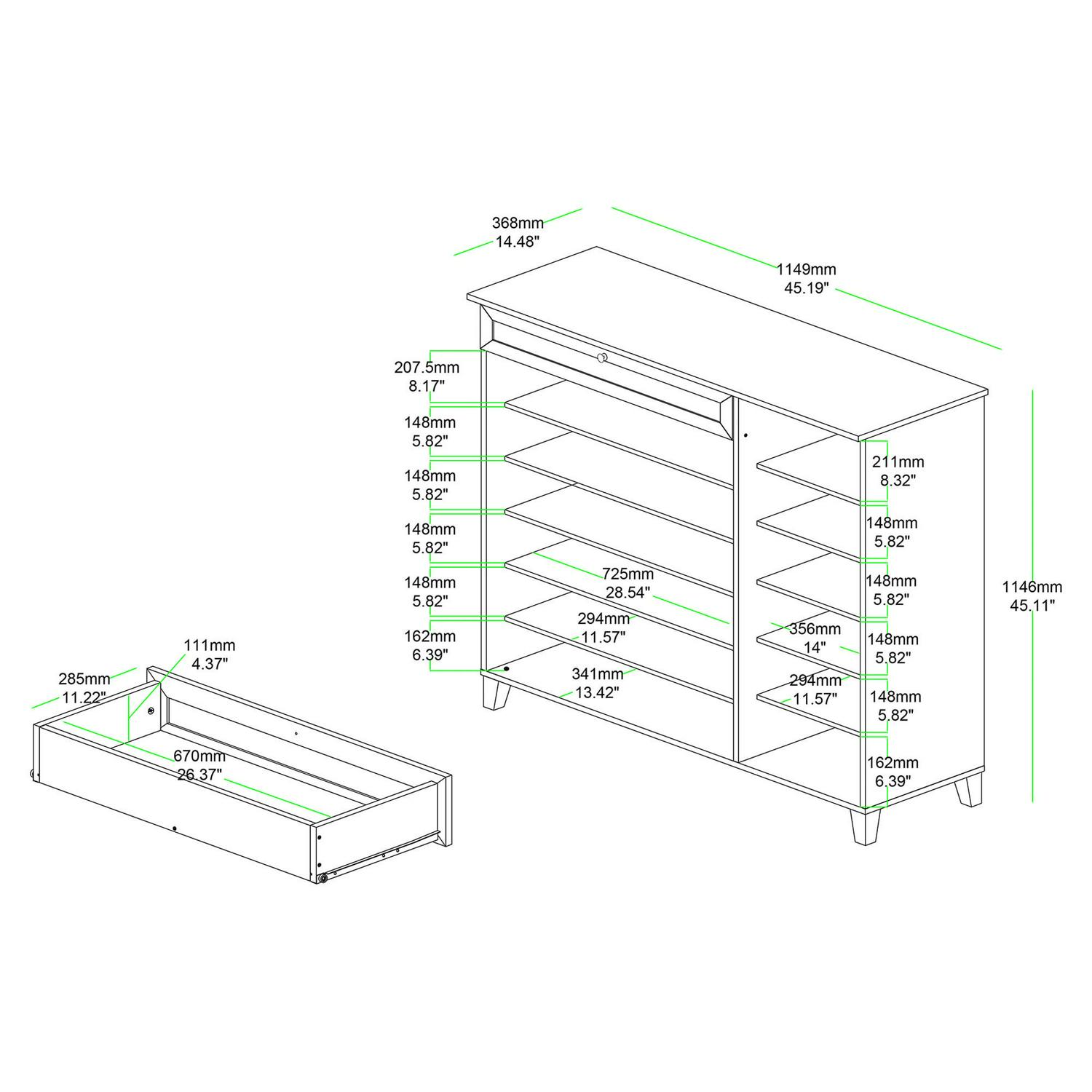 – Eleven (11) shelves provide space for about 21 pairs of shoes, depending on the size