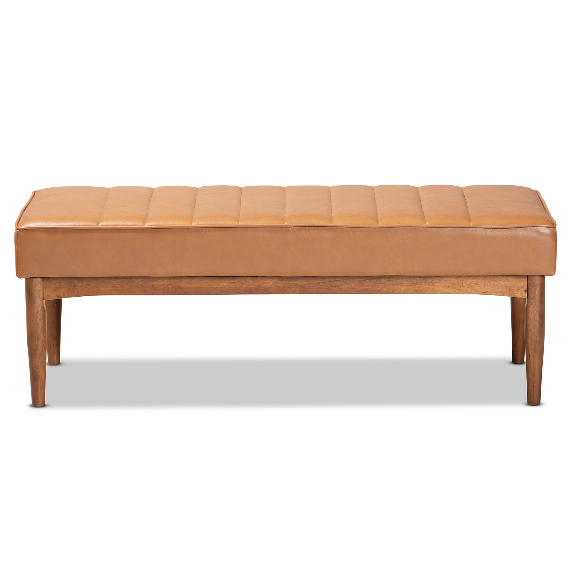 Mid-century modern dining bench Constructed from rubber wood and engineered wood Walnut brown finish Upholstered in faux leather and padded with foam Channel tufted Product Weight: 23.8 Pound Package Weight: 1 Pound Dimensions: 17.3″ High x 47″ Wide x 17.7″ Deep; Seating Dimensions: 17.3″ High x 47″ Wide x 17.7″ Deep; Legs: 11.4″ High Product Color: Tan/Walnut Brown Product Composition: Faux Leather/MDF/LVL/Foam/Rubber wood