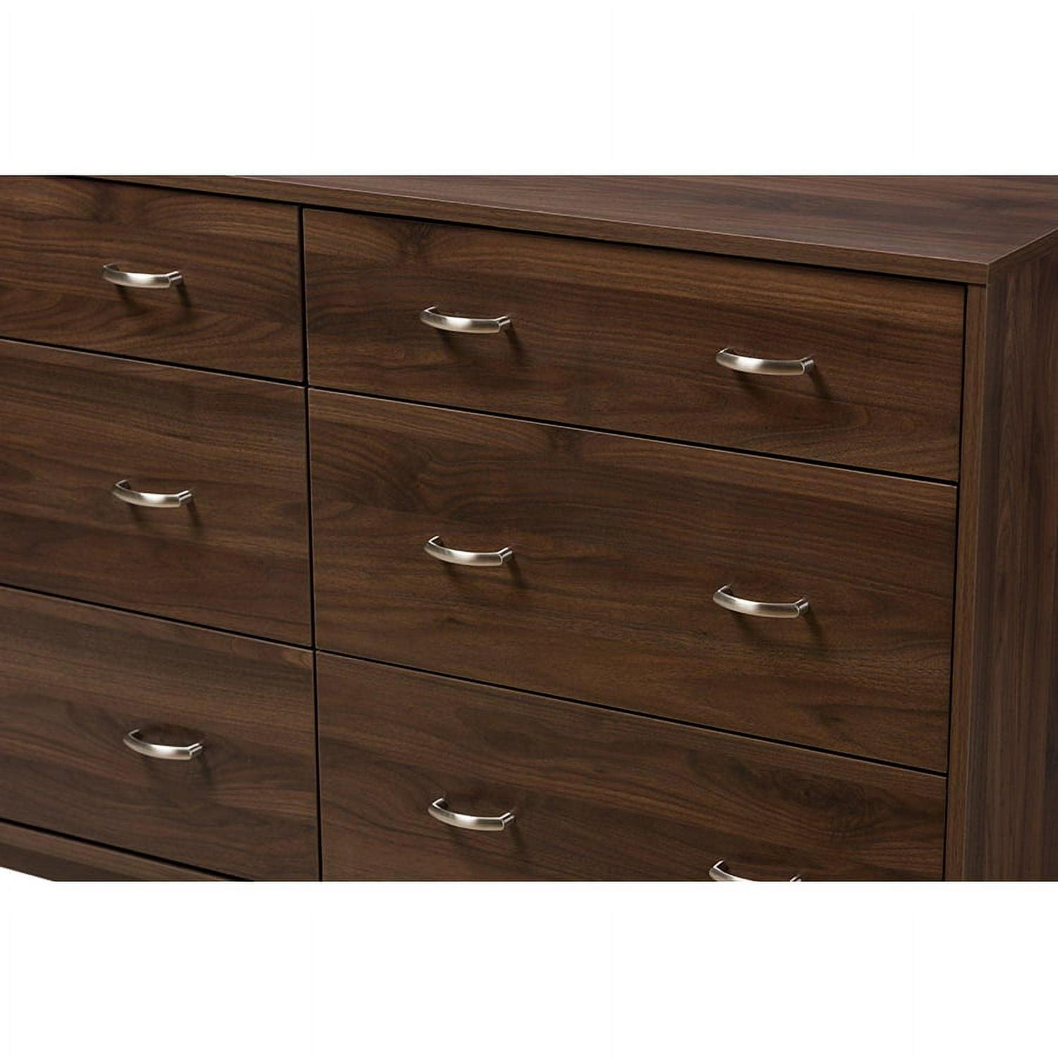 Baxton Studio Disa Mid-Century Modern Walnut Brown Finished 6-Drawer Dresser Robust design with minimalist detailing for a handsome form that balances wood finishing with modernism, the Disa 6-drawer dresser complements a range of interior aesthetics from colonial to contemporary for versatile styling. Constructed of engineered wood and MDF boards for sturdiness, the dresser features six pull-out drawers on metal runners for a smooth movement for your clothes and linens. Finished in walnut brown veneer for an alluring woodgrain, the Disa is accented with sleek metal handles for simple functionality with contemporary looks. Solid wood angled legs in a tapered design, for a Scandinavian touch in your dcor hold up the Disa sturdily. Made in Malaysia, the Disa requires assembly.